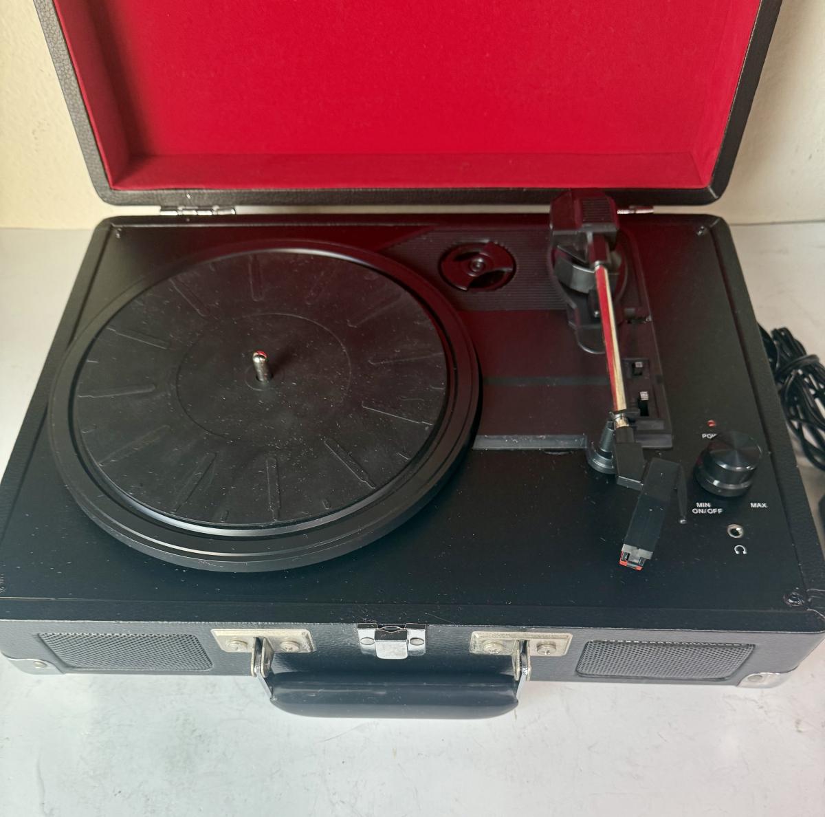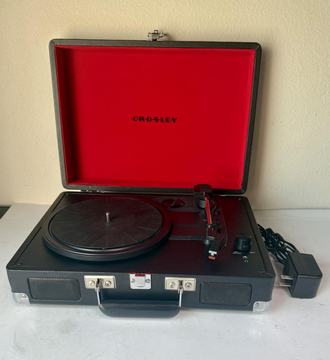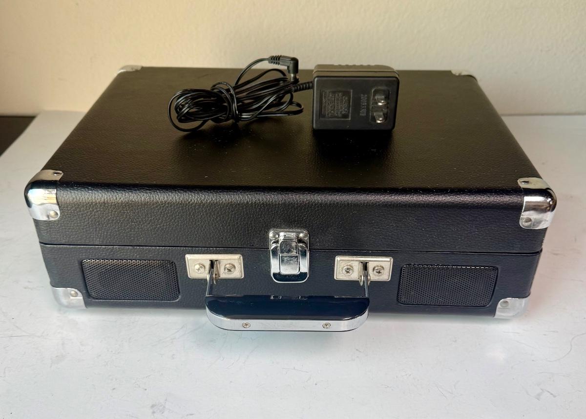 Brief-case style portable turntable with built-in speakers. Has 9V power transformer and cord. Model CR8005A. †tested, powers on and runs as expected.