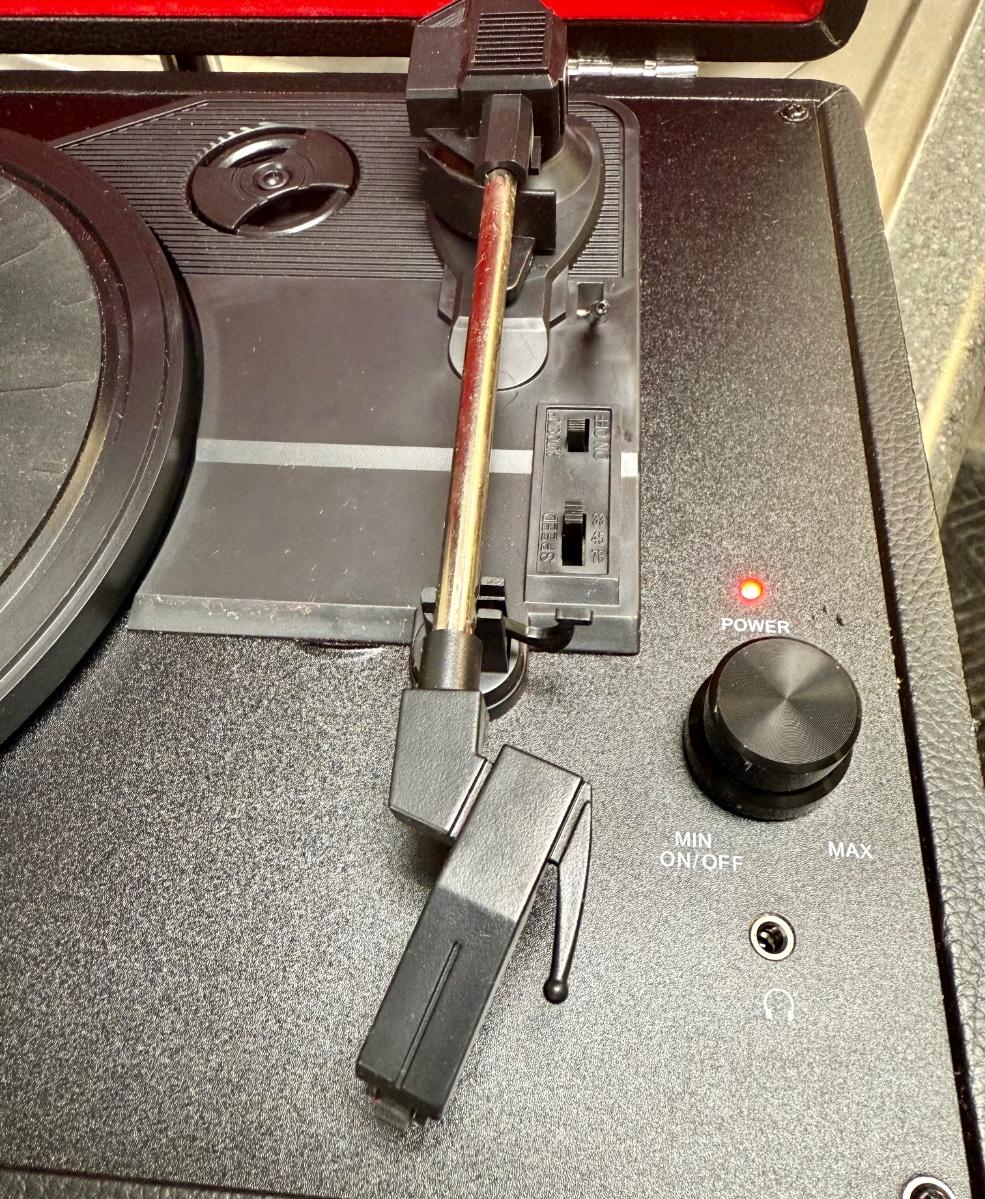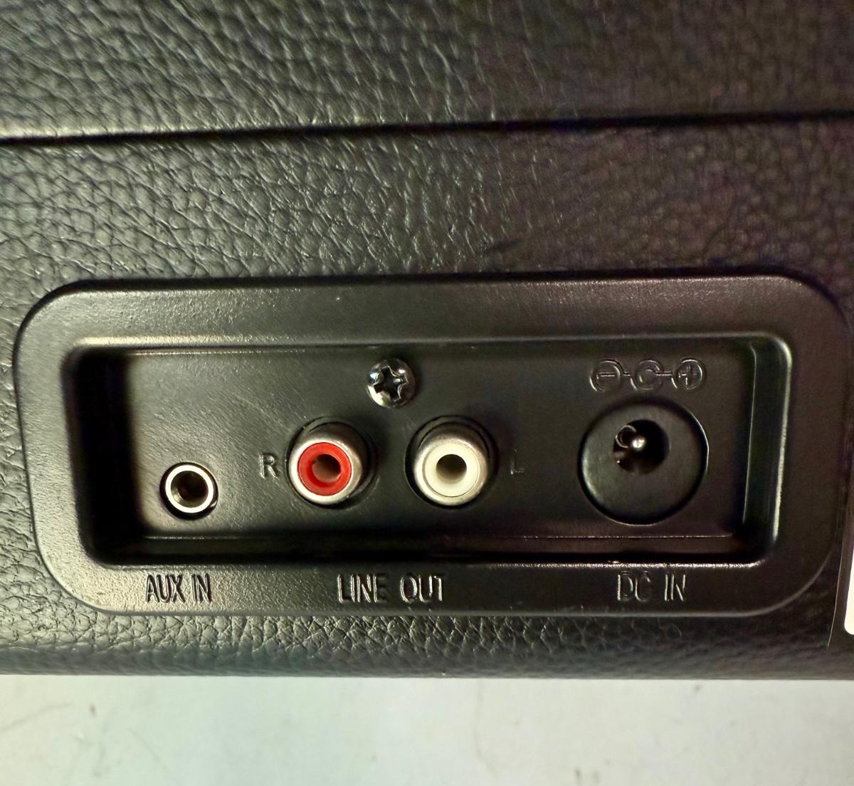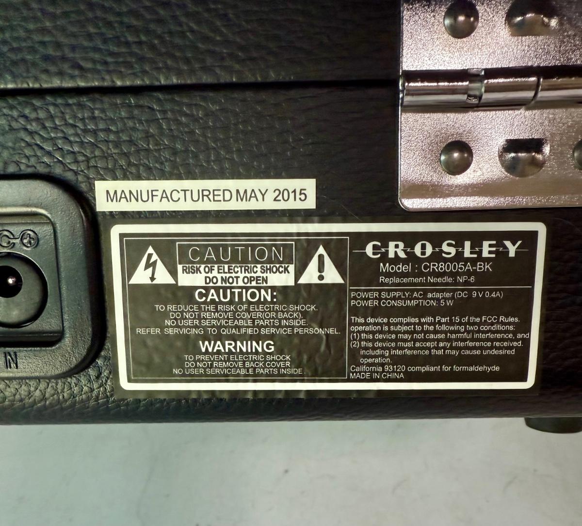 Brief-case style portable turntable with built-in speakers. Has 9V power transformer and cord. Model CR8005A. †tested, powers on and runs as expected.