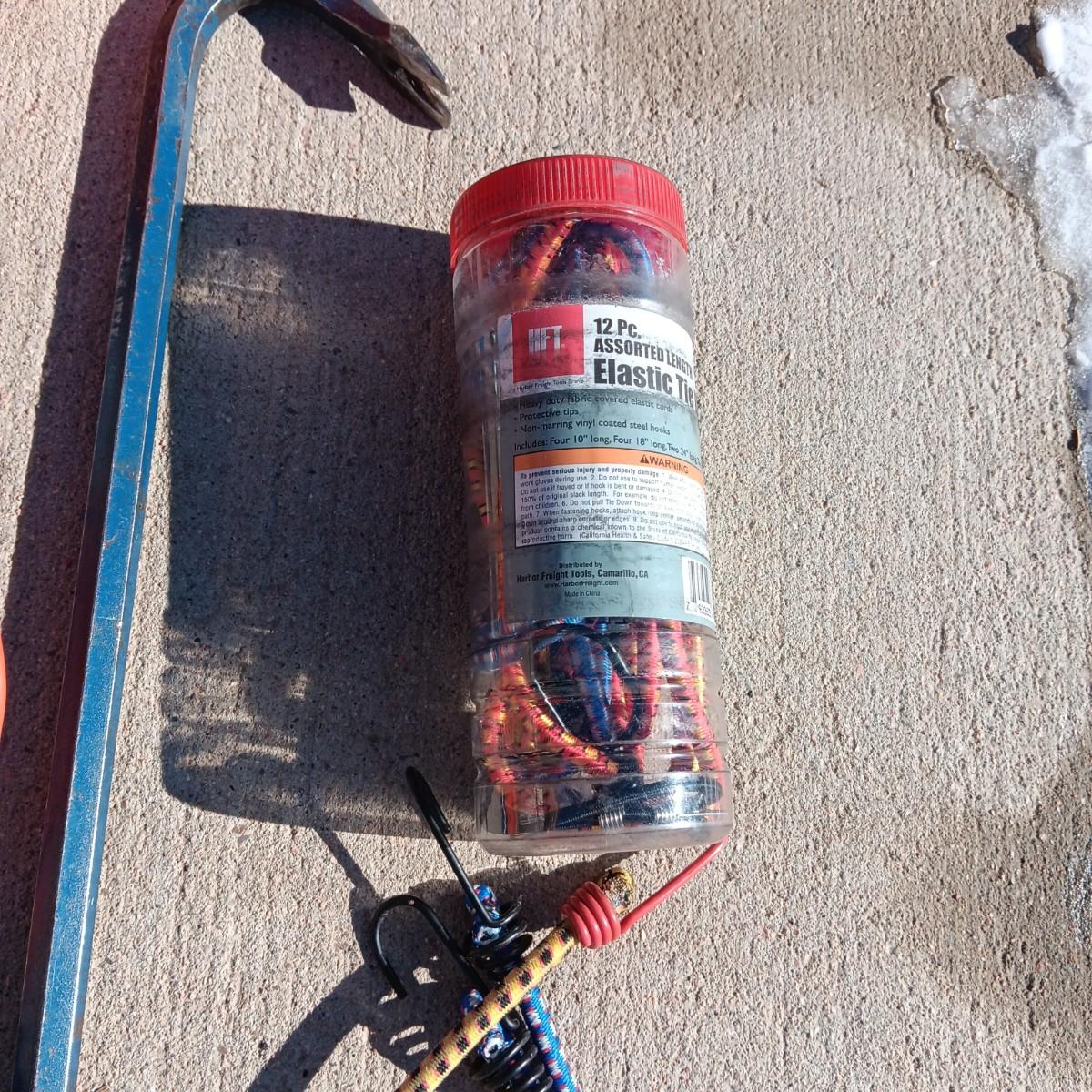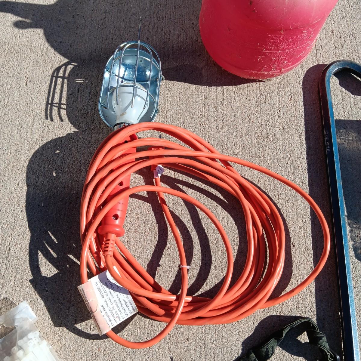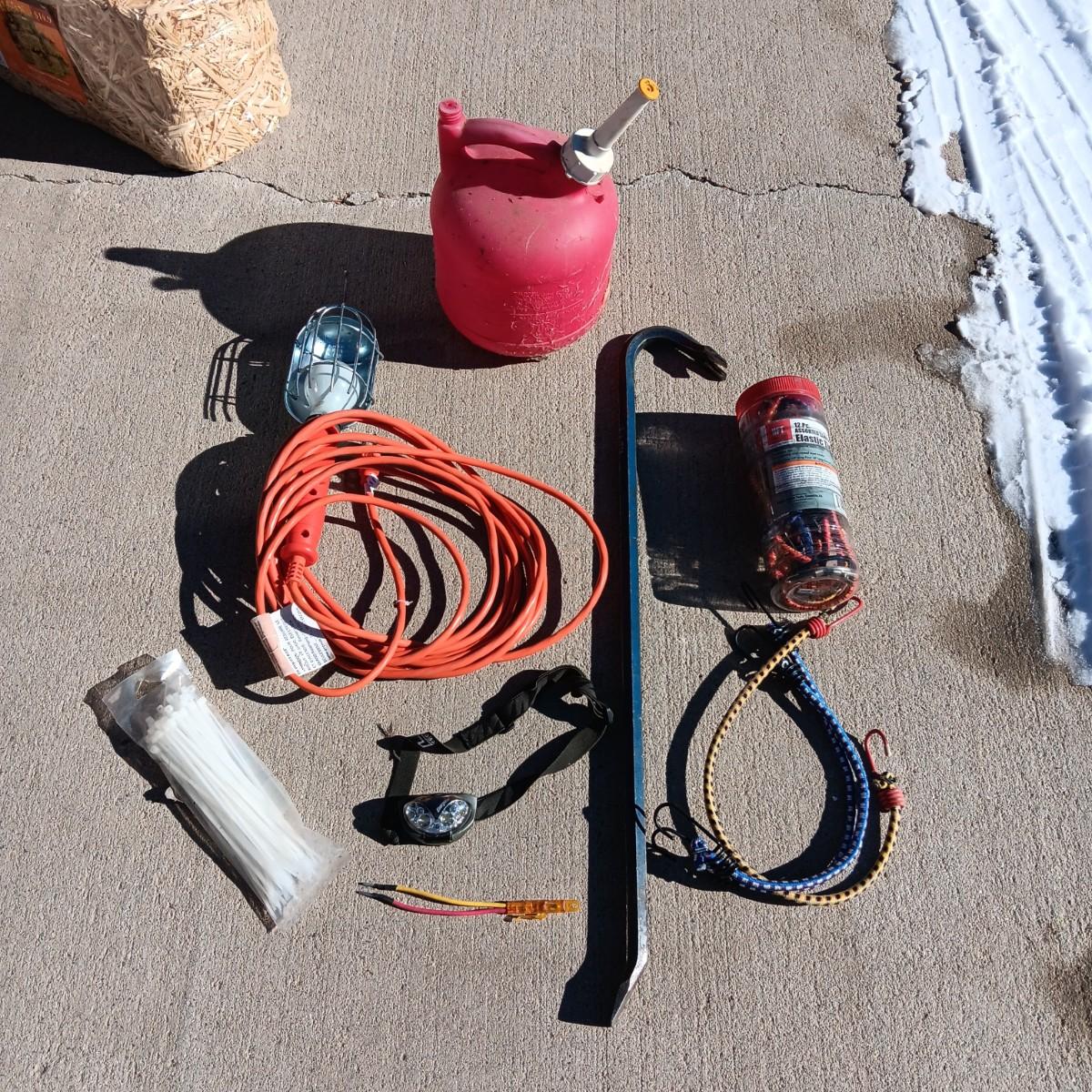 CROW BAR, TROUBLE LIGHT, GAS CAN, BUNGEE CORDS, HEADLIGHT AND ZIP TIES