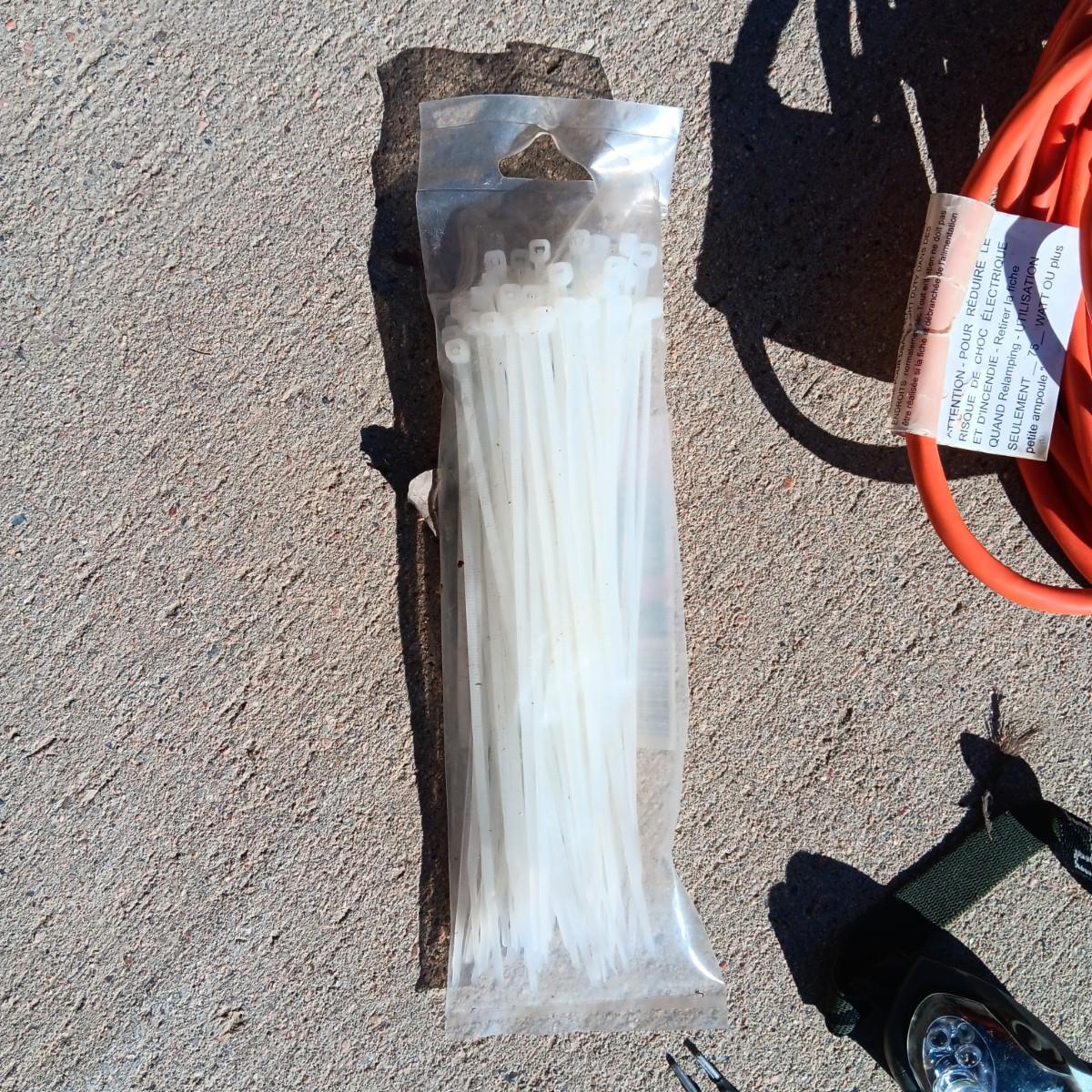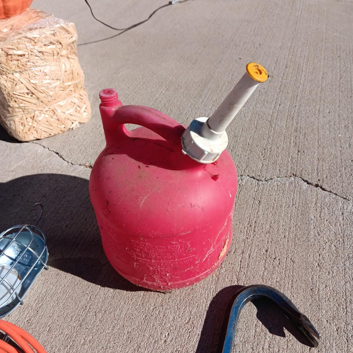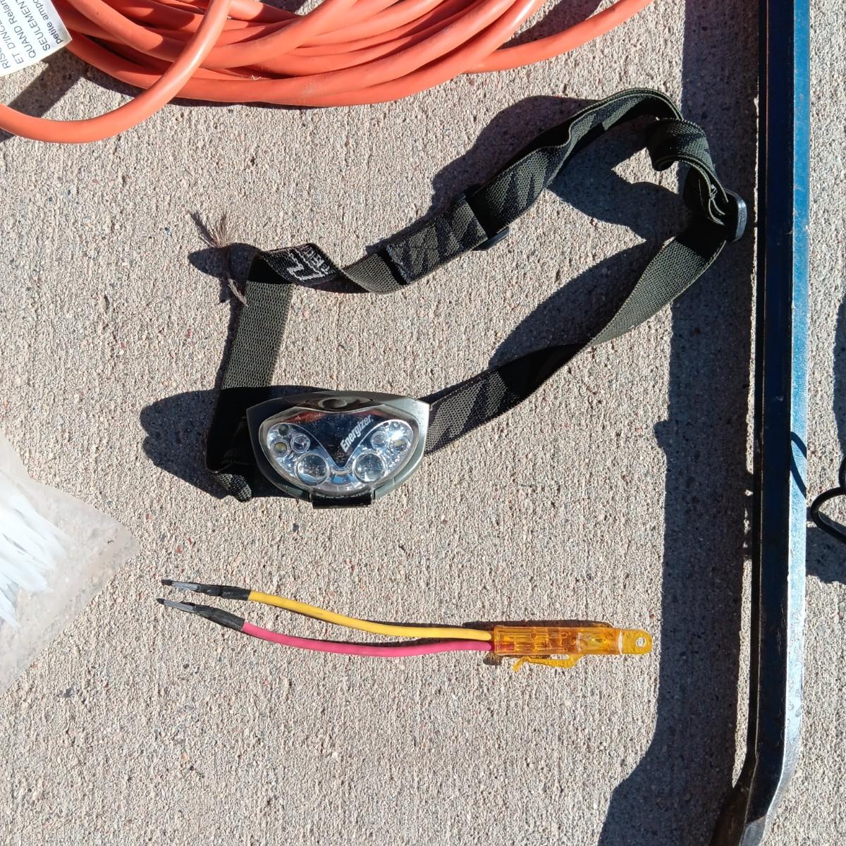 CROW BAR, TROUBLE LIGHT, GAS CAN, BUNGEE CORDS, HEADLIGHT AND ZIP TIES