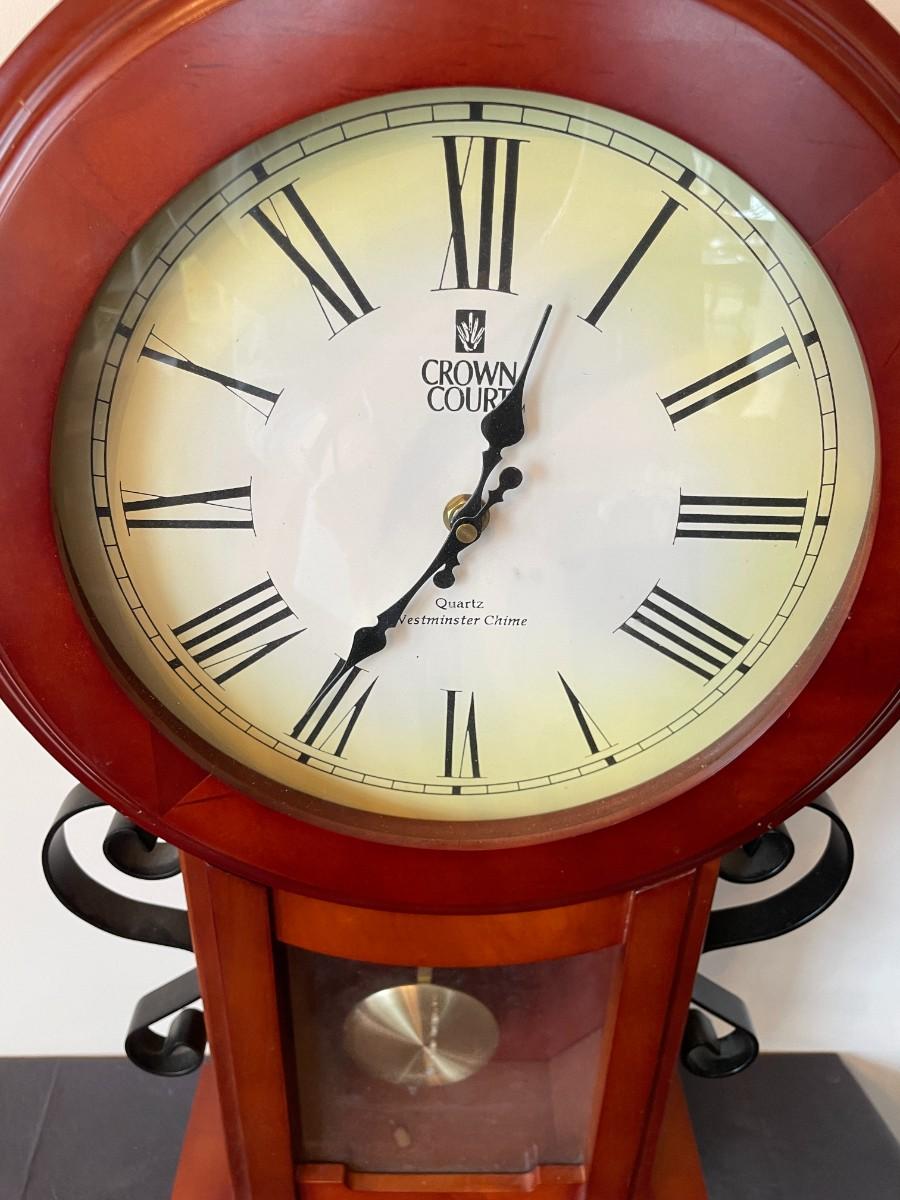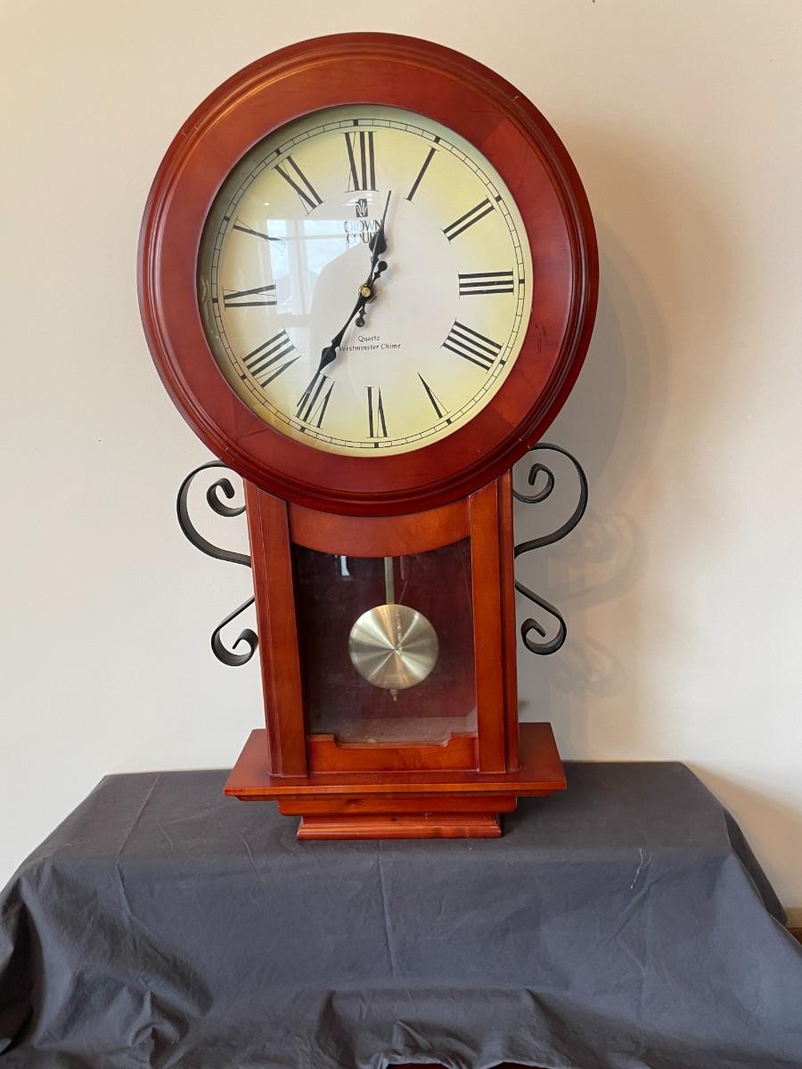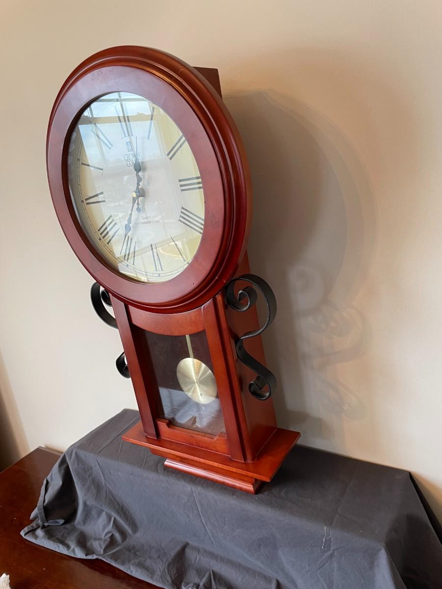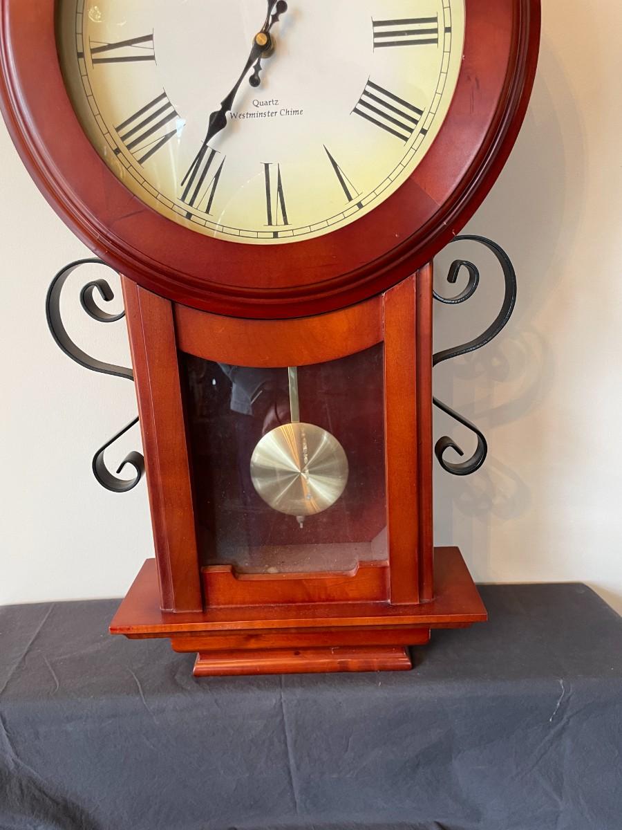 Vintage clock. Does not appear to be in working condition. 24 1/2"H x 12"W