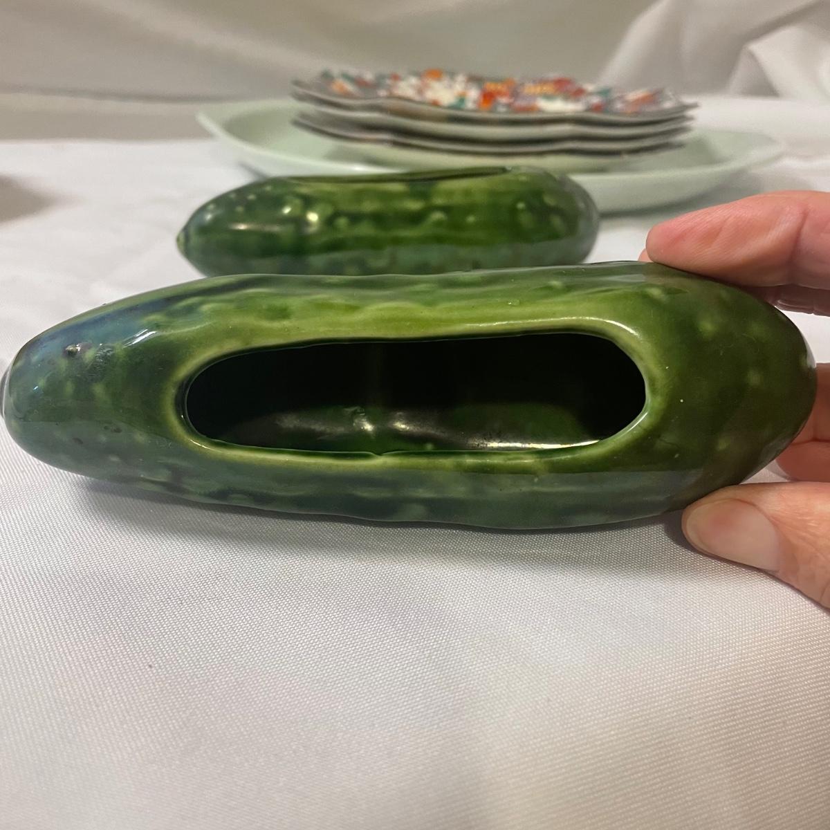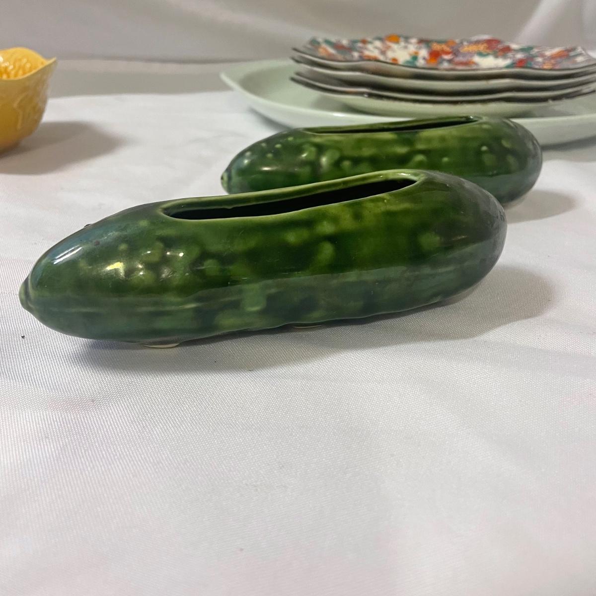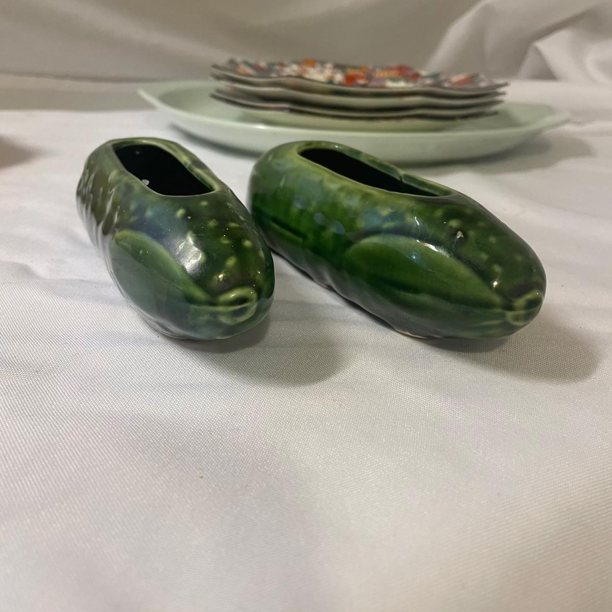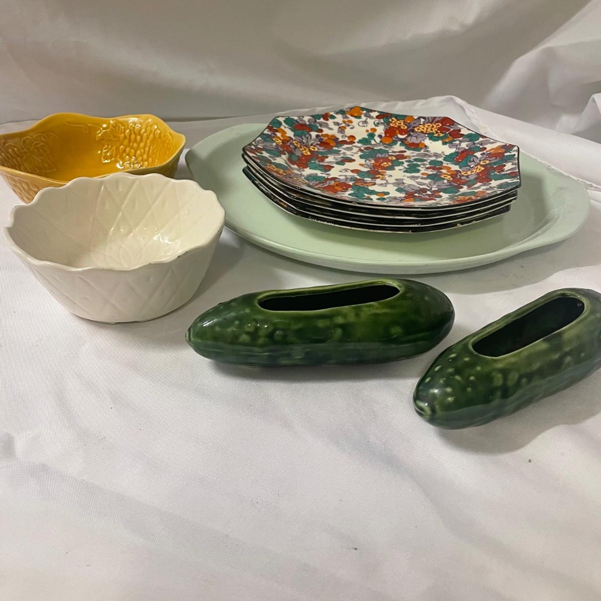 These 4 matching plates by Crown, Ducal Ware measure 8.5” d and are in great condition as are all the other ceramic pieces in this lot that includes a pair of pickle shaped planters that look like McCoy but are unmarked. Lot also includes two small bowls and a large sea-foam green serving plate that measures 12”d.