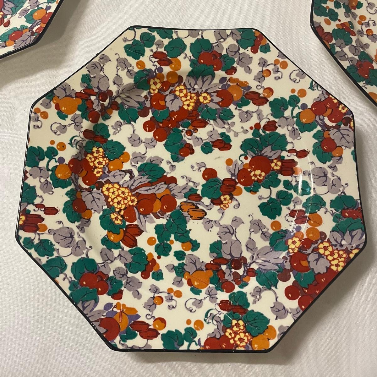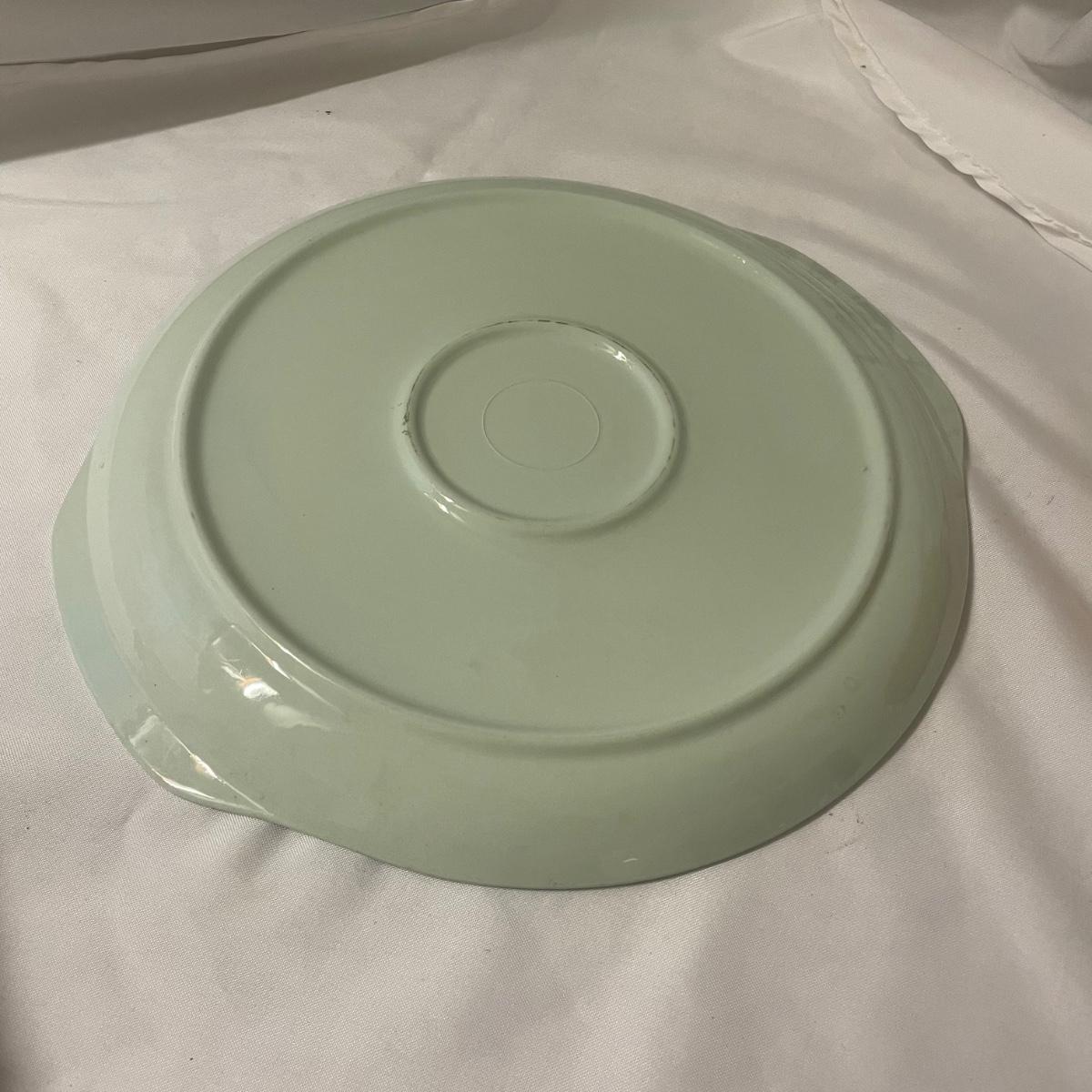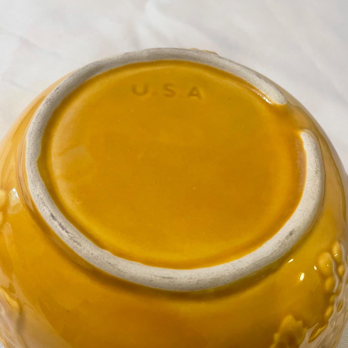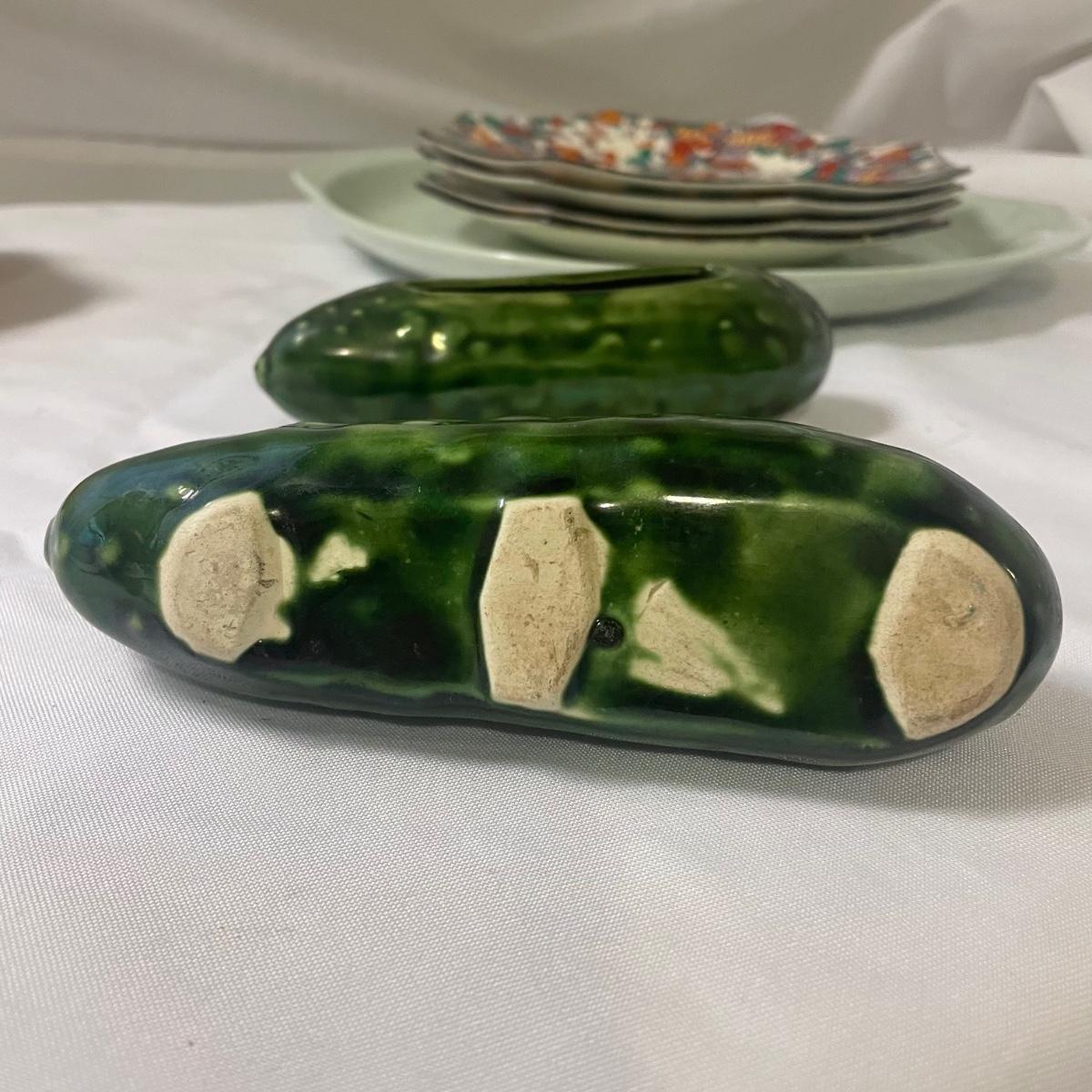 These 4 matching plates by Crown, Ducal Ware measure 8.5” d and are in great condition as are all the other ceramic pieces in this lot that includes a pair of pickle shaped planters that look like McCoy but are unmarked. Lot also includes two small bowls and a large sea-foam green serving plate that measures 12”d.