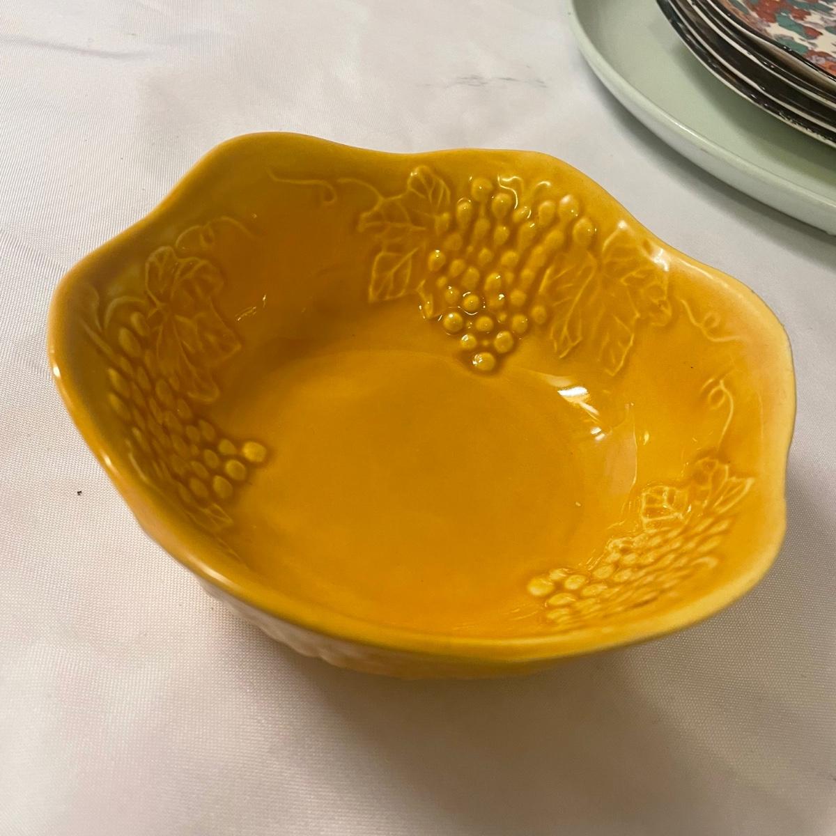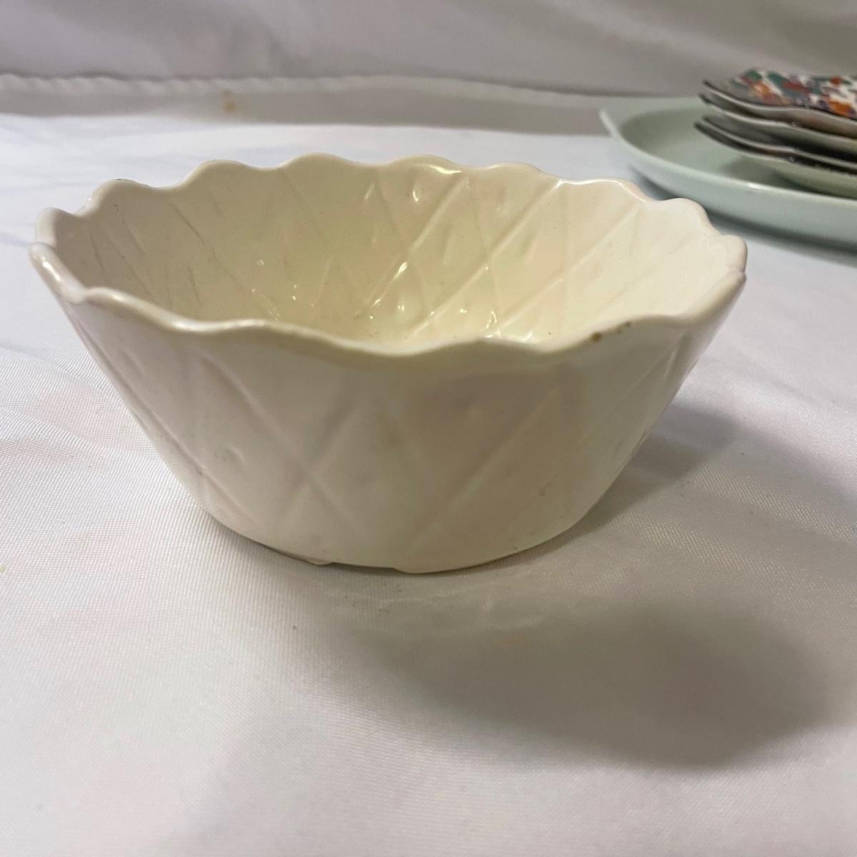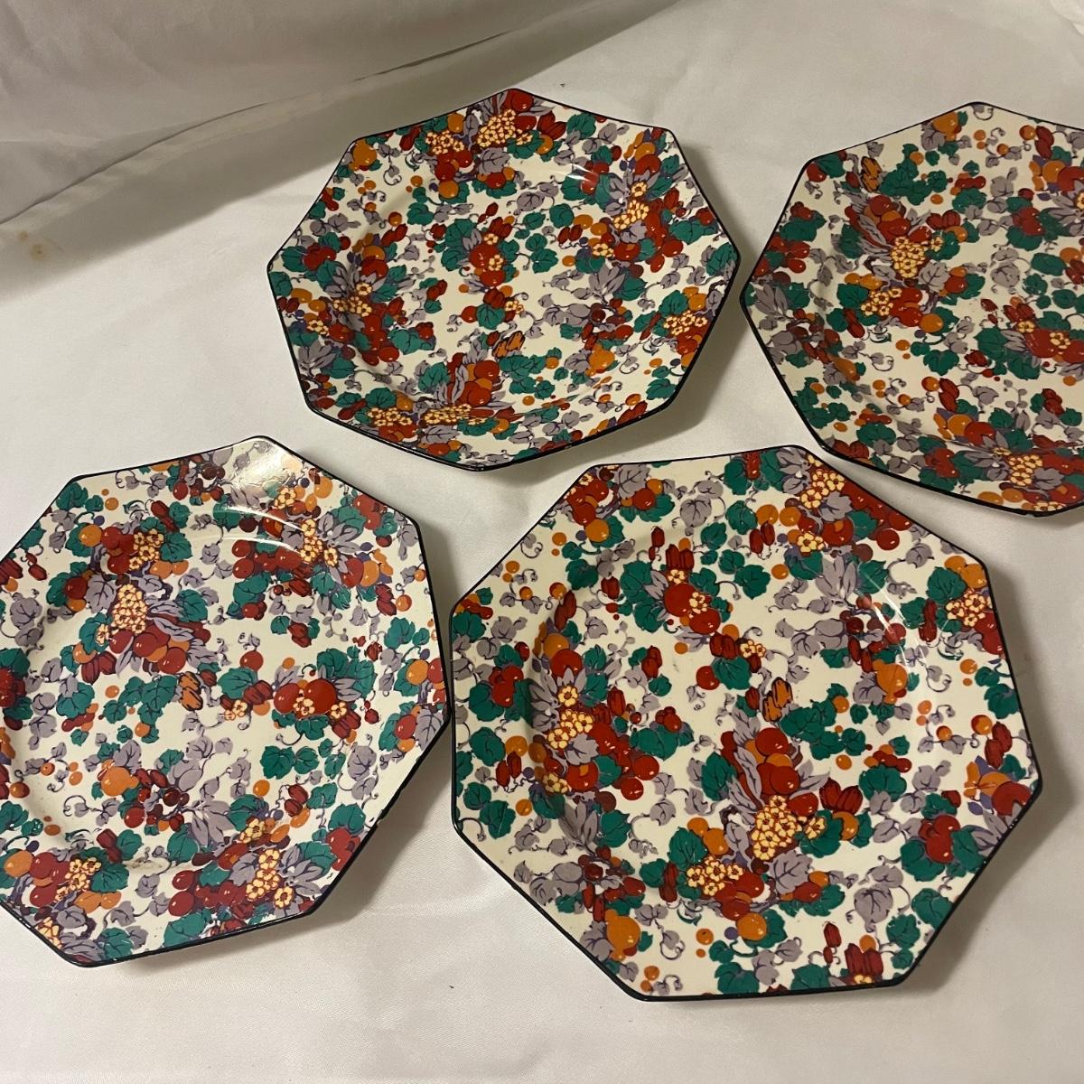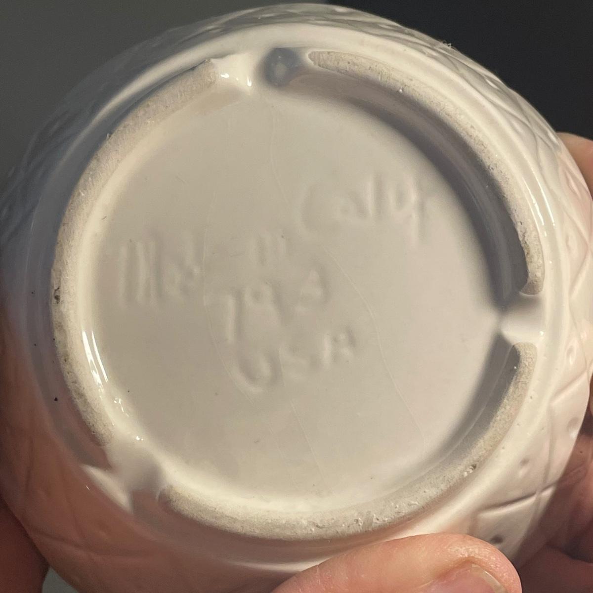 These 4 matching plates by Crown, Ducal Ware measure 8.5” d and are in great condition as are all the other ceramic pieces in this lot that includes a pair of pickle shaped planters that look like McCoy but are unmarked. Lot also includes two small bowls and a large sea-foam green serving plate that measures 12”d.