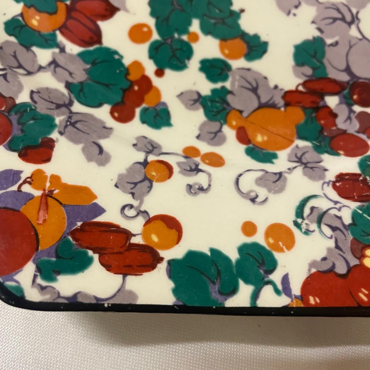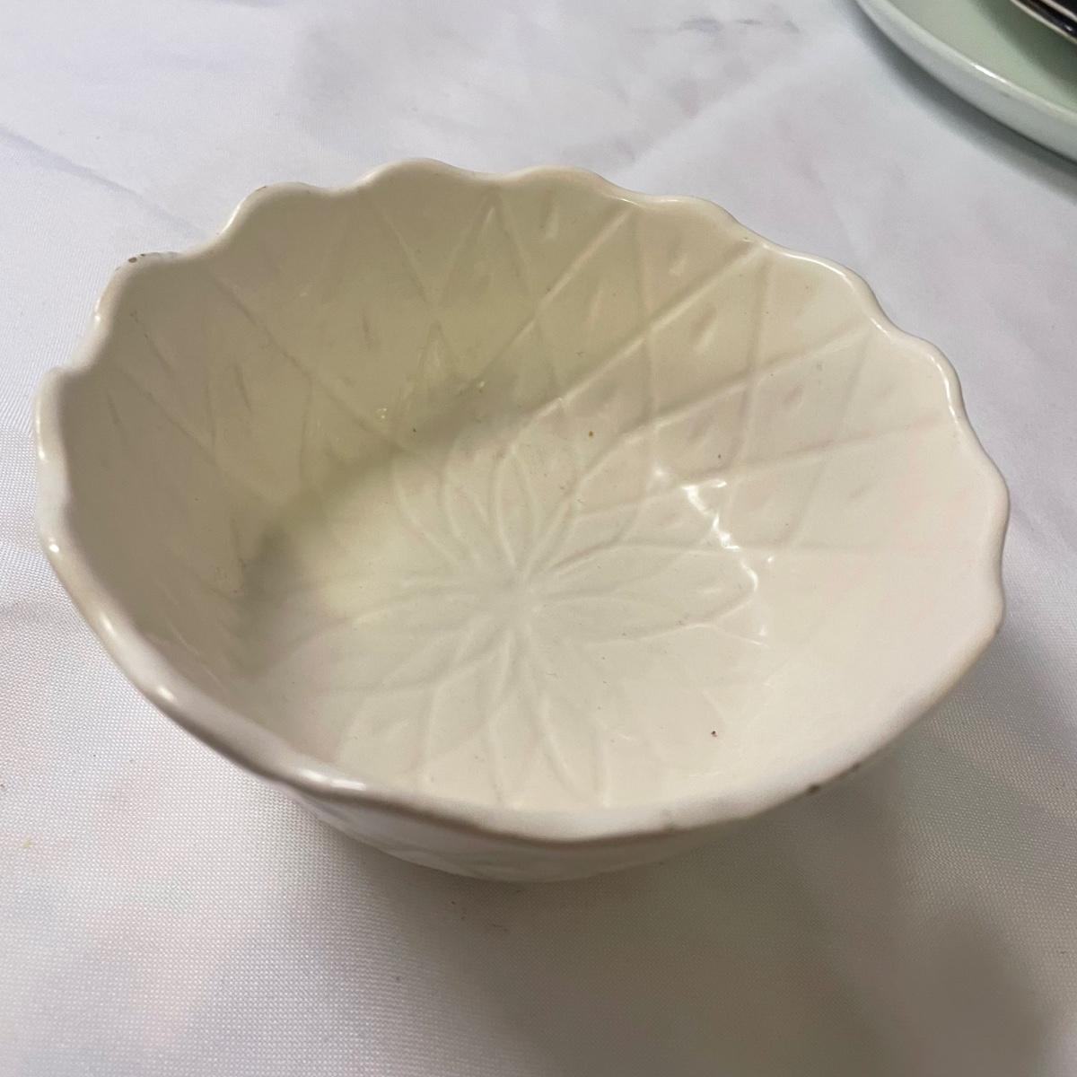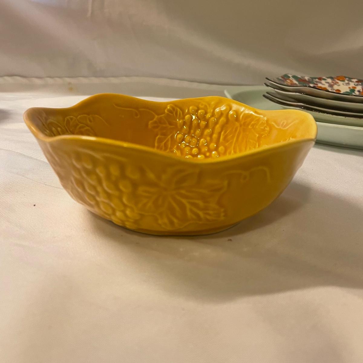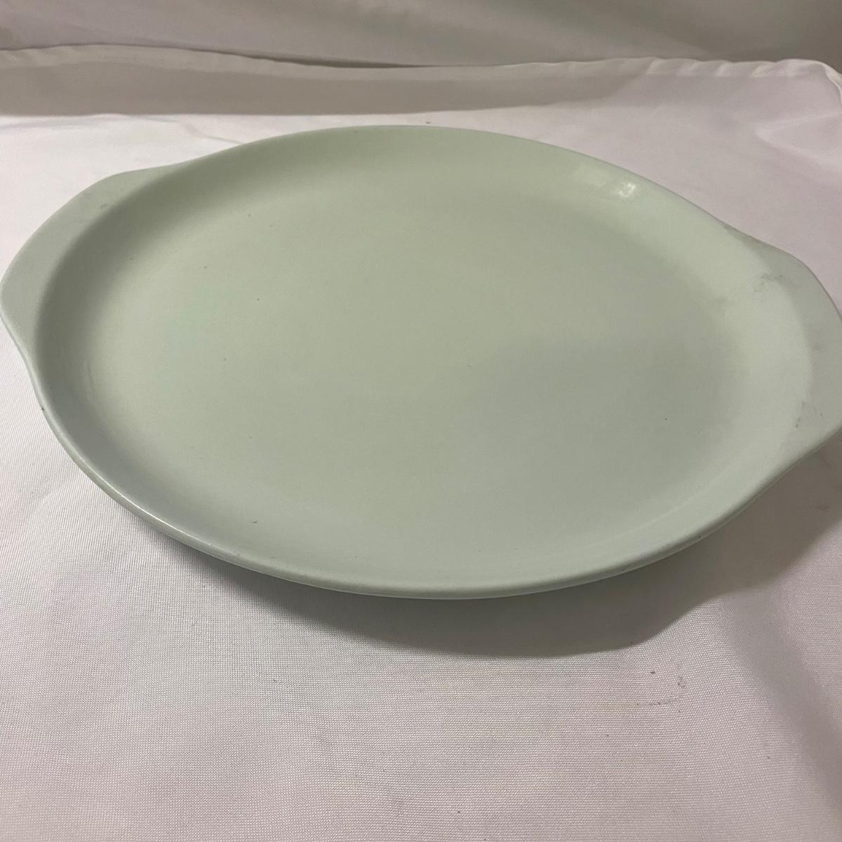 These 4 matching plates by Crown, Ducal Ware measure 8.5” d and are in great condition as are all the other ceramic pieces in this lot that includes a pair of pickle shaped planters that look like McCoy but are unmarked. Lot also includes two small bowls and a large sea-foam green serving plate that measures 12”d.