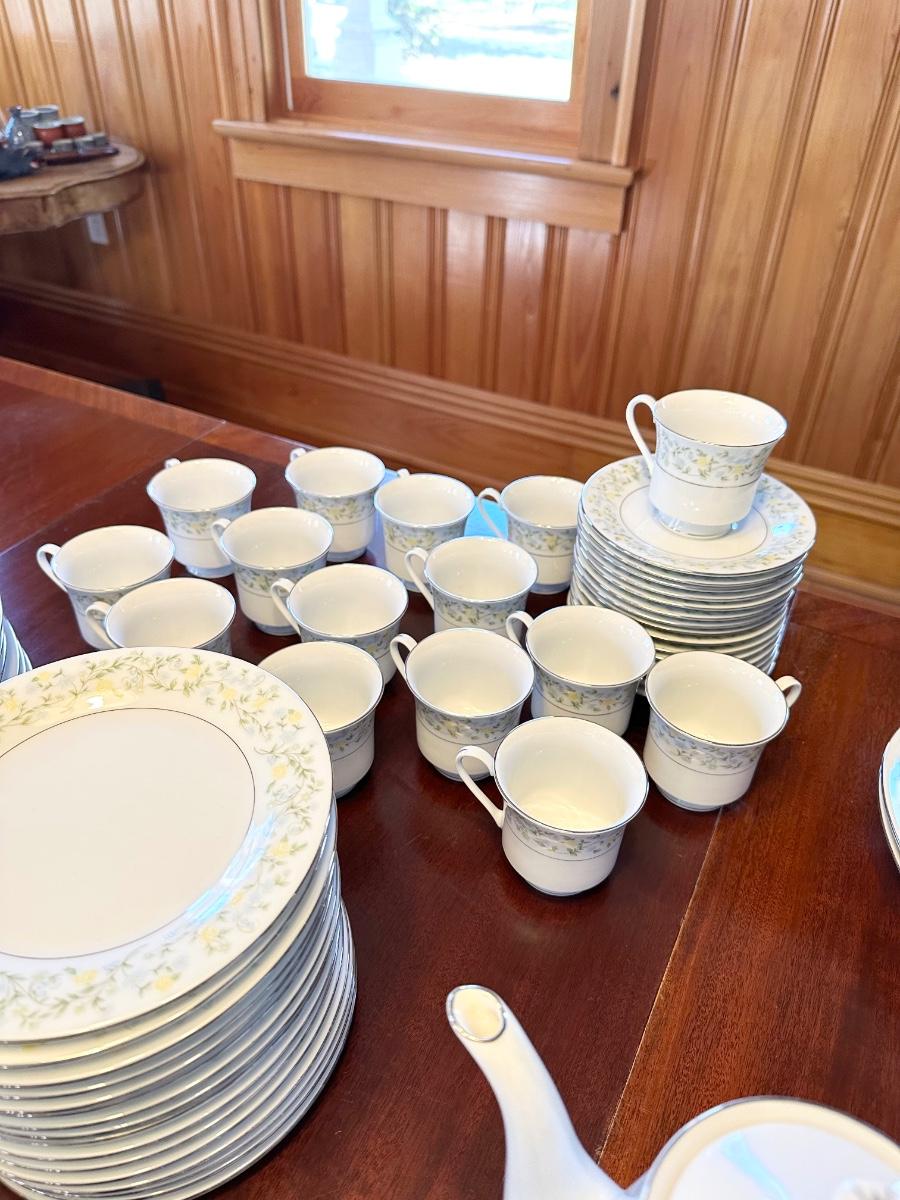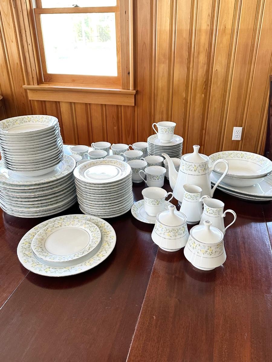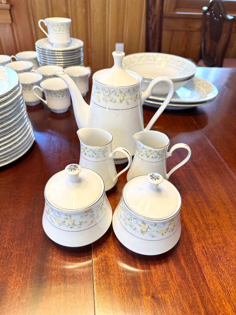69 Pieces include ~ 12 of the following ~ Dinner Plates, Bowls, Salad Plates, cups and matching saucers: Includes 1 Coffee/Tea Pot, 2 creamers and 2 sugar bowls ~ 2 platters and 2 Veg bowls (see photos), no chips ~ has extras