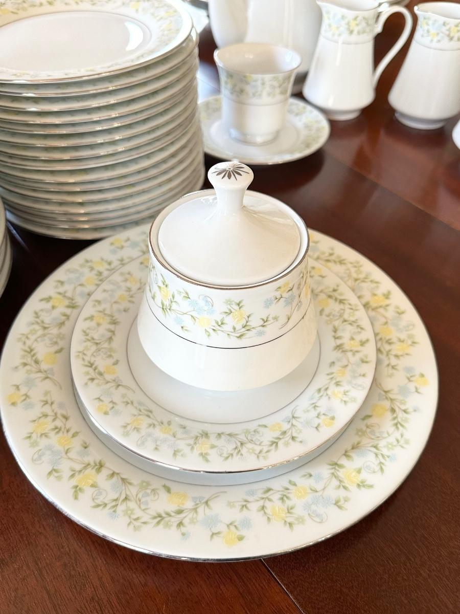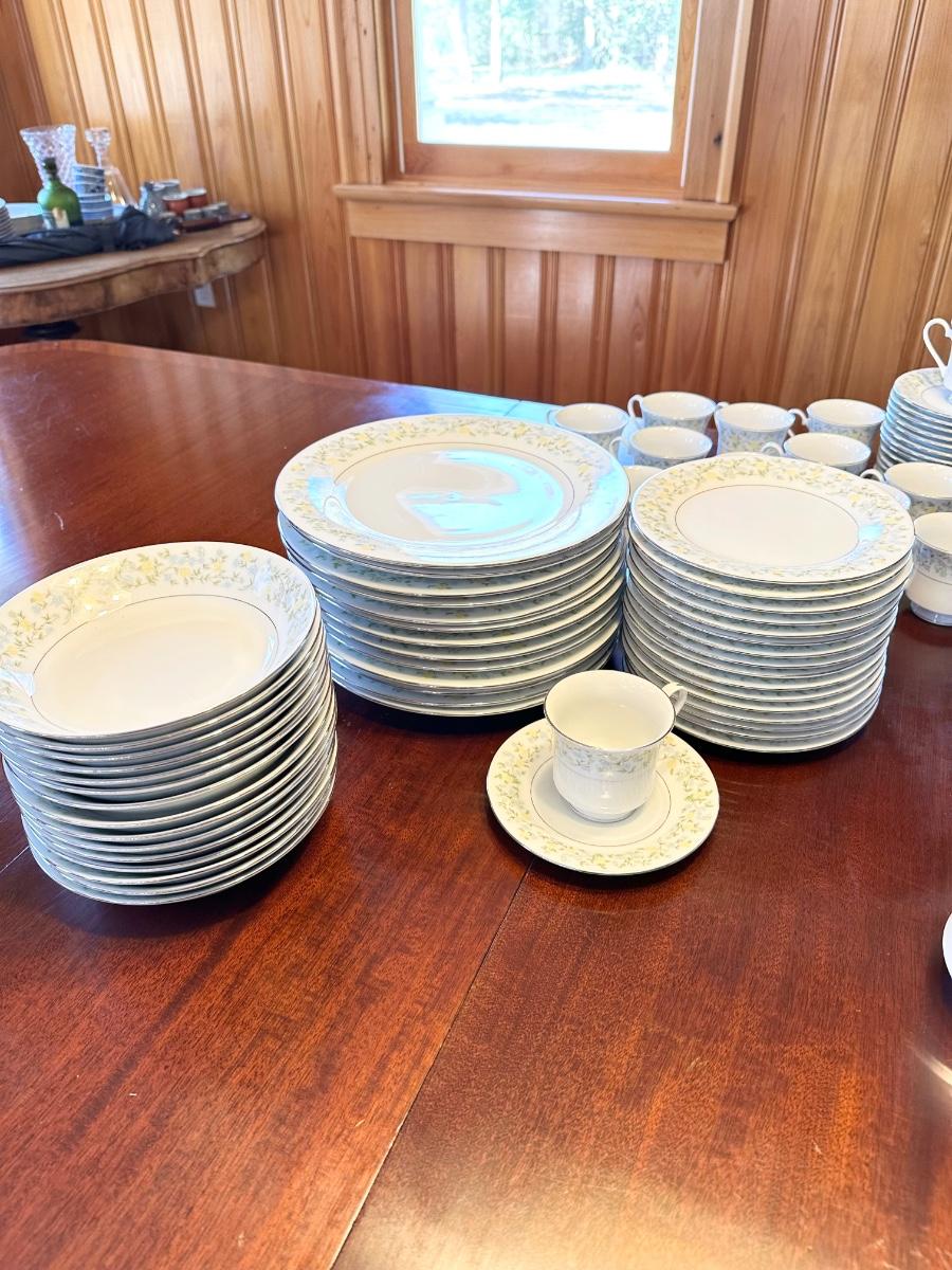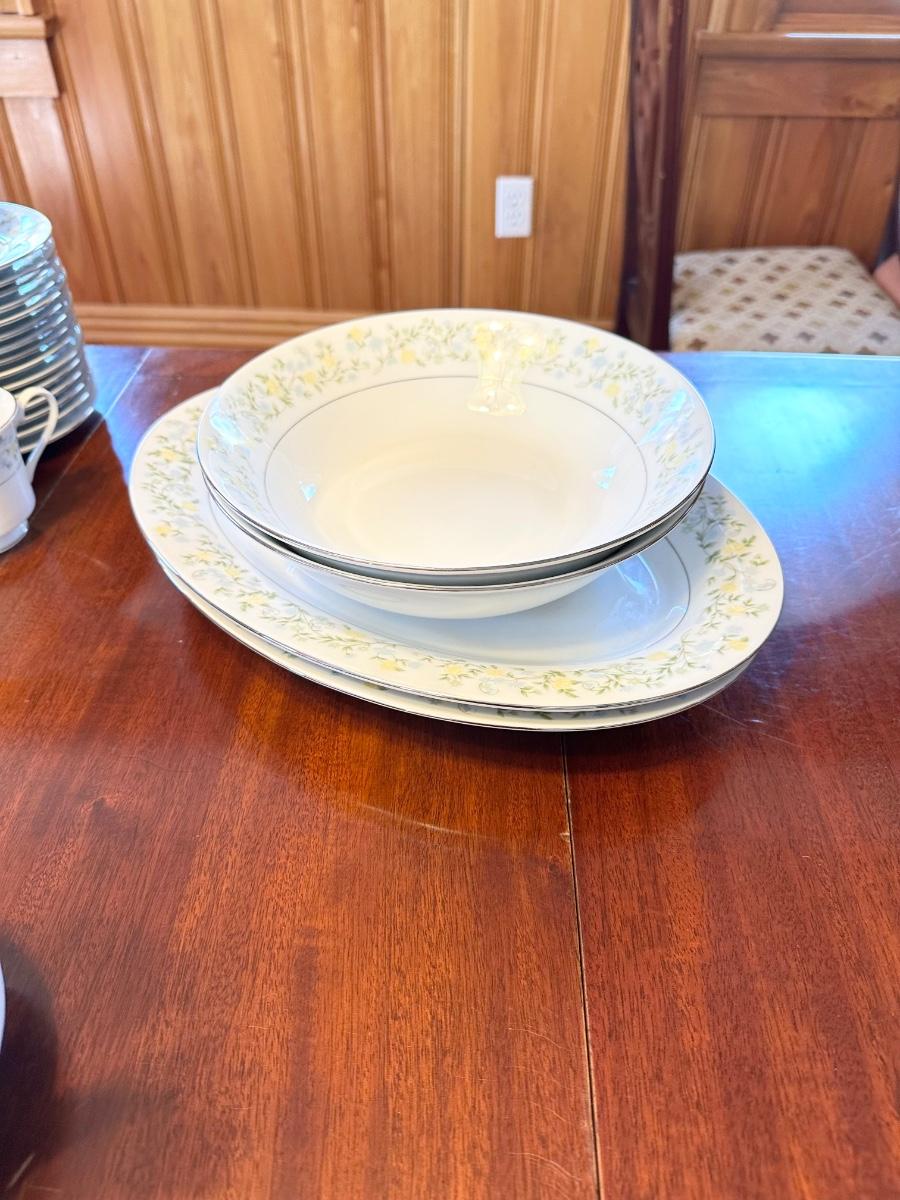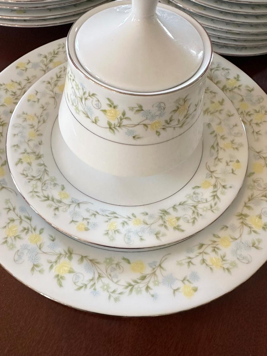 69 Pieces include ~ 12 of the following ~ Dinner Plates, Bowls, Salad Plates, cups and matching saucers: Includes 1 Coffee/Tea Pot, 2 creamers and 2 sugar bowls ~ 2 platters and 2 Veg bowls (see photos), no chips ~ has extras