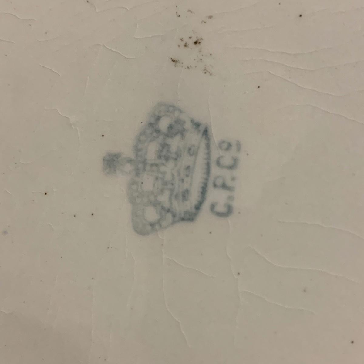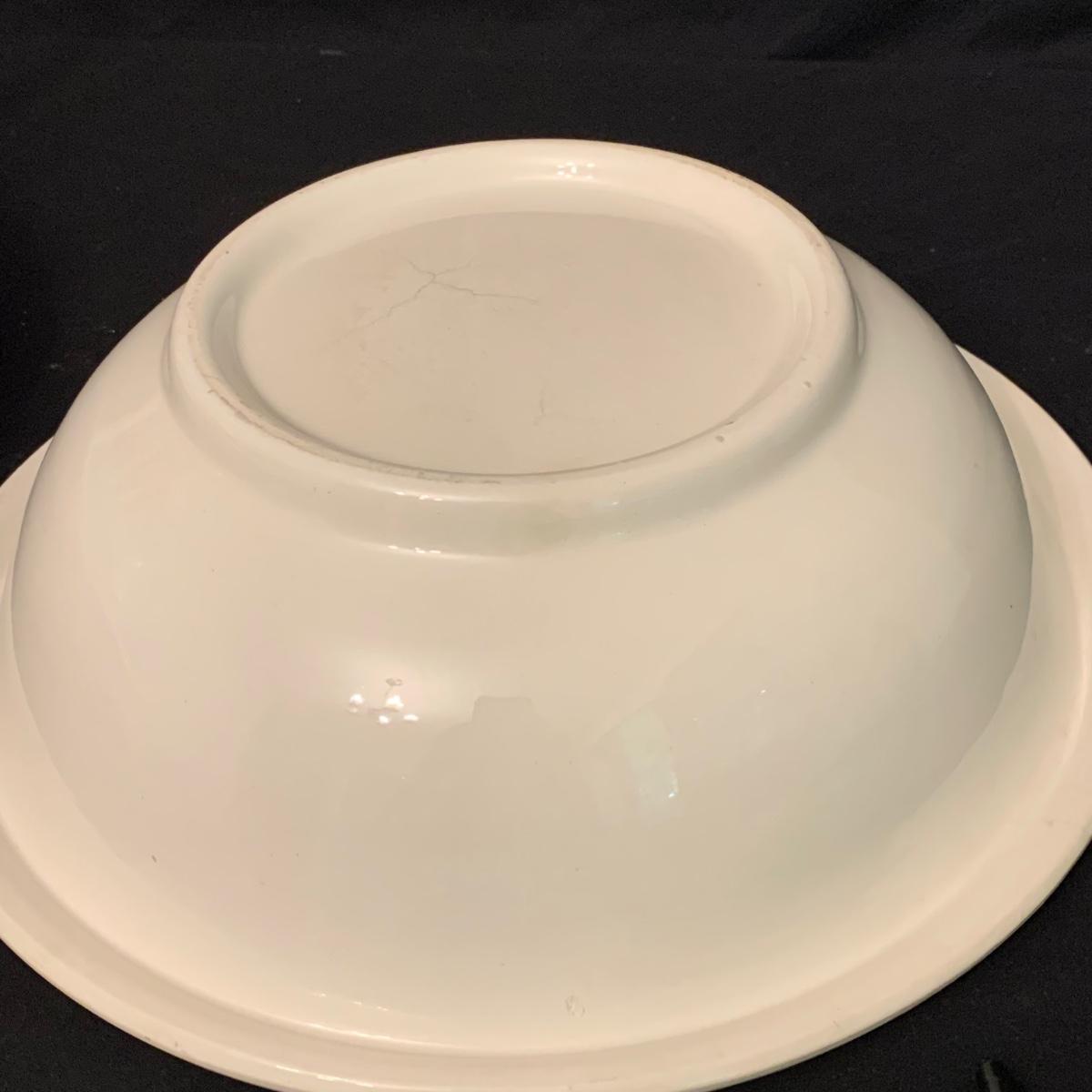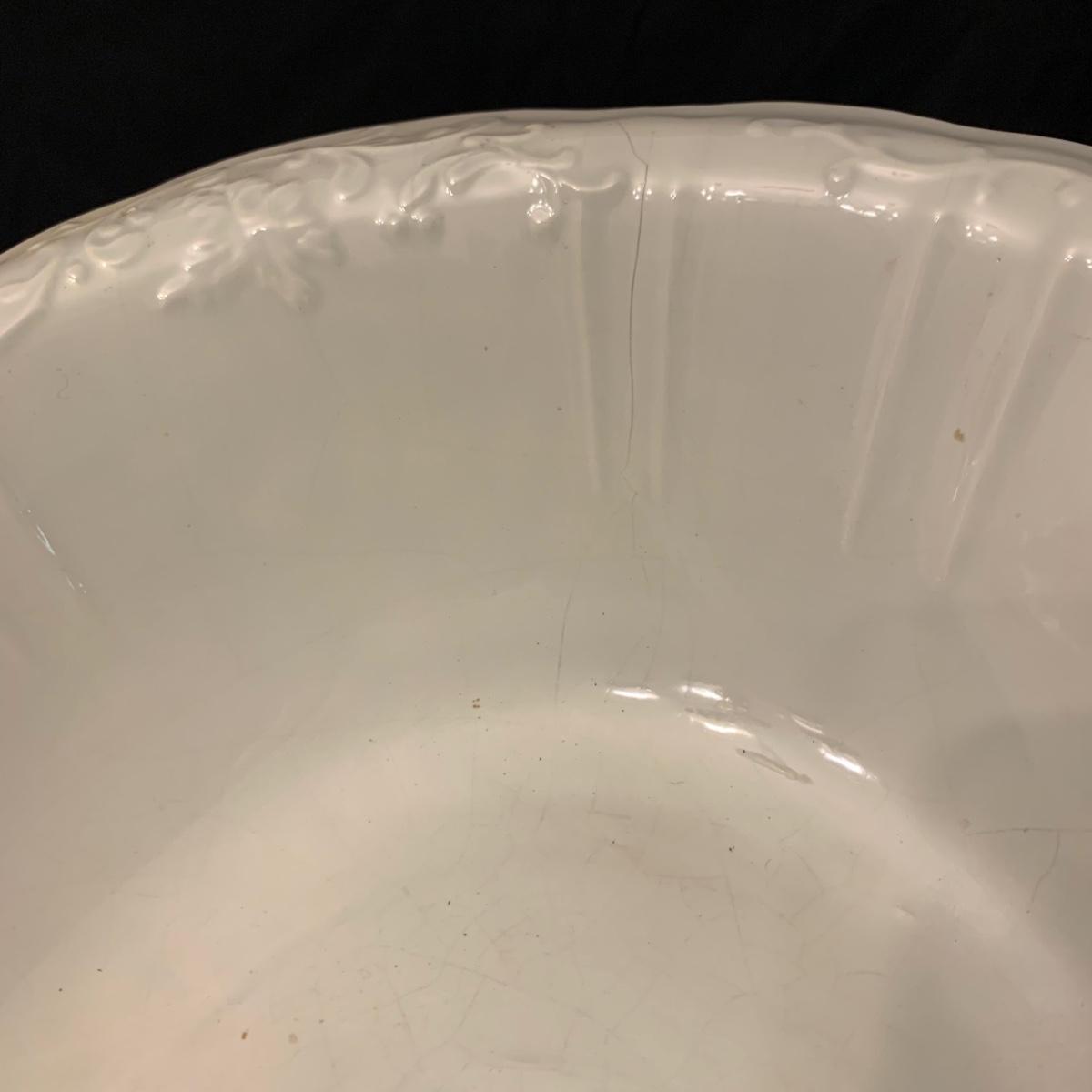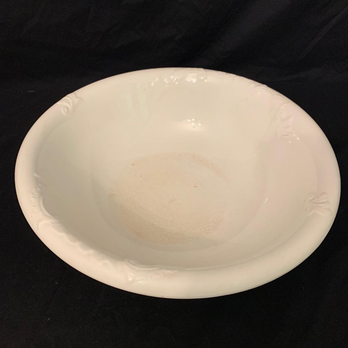Crown Pottery Co. porcelain pitcher with two wash basins. Pitcher is about 11” tall. There is a crack at the bottom of the handle, shown in photos. The bottom of the pitcher is marked with a crown and “CPCo”, indicating that it is from Crown Pottery Co. The wash basin with the scalloped edge measures 16”D. It has a small crack, shown in photos. The signature is illegible, but it does appear to be from 1968. A crack and some crazing are seen on the second basin as well. Shipping available.