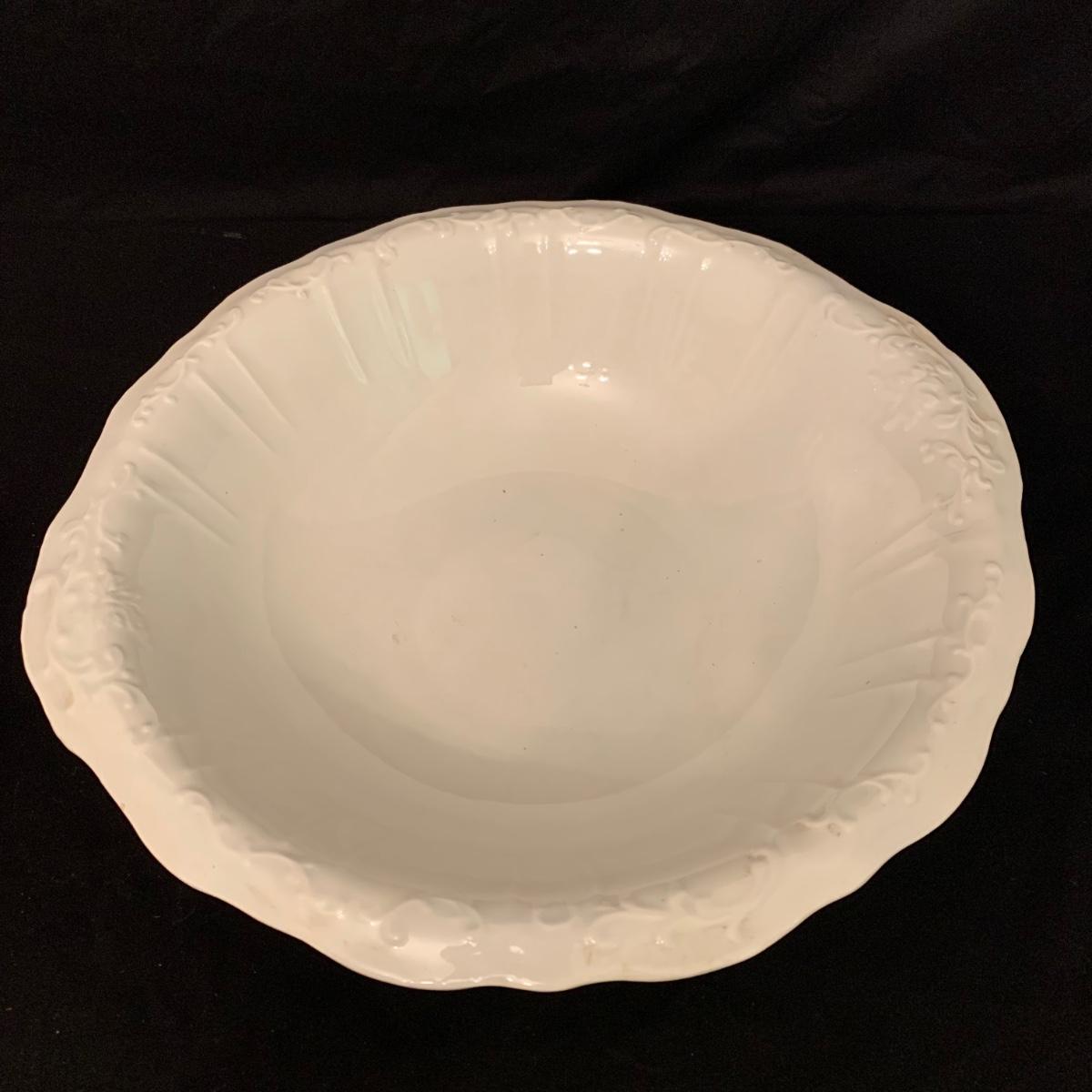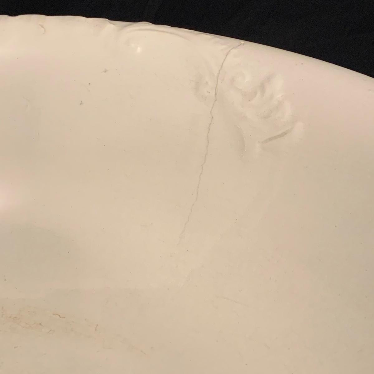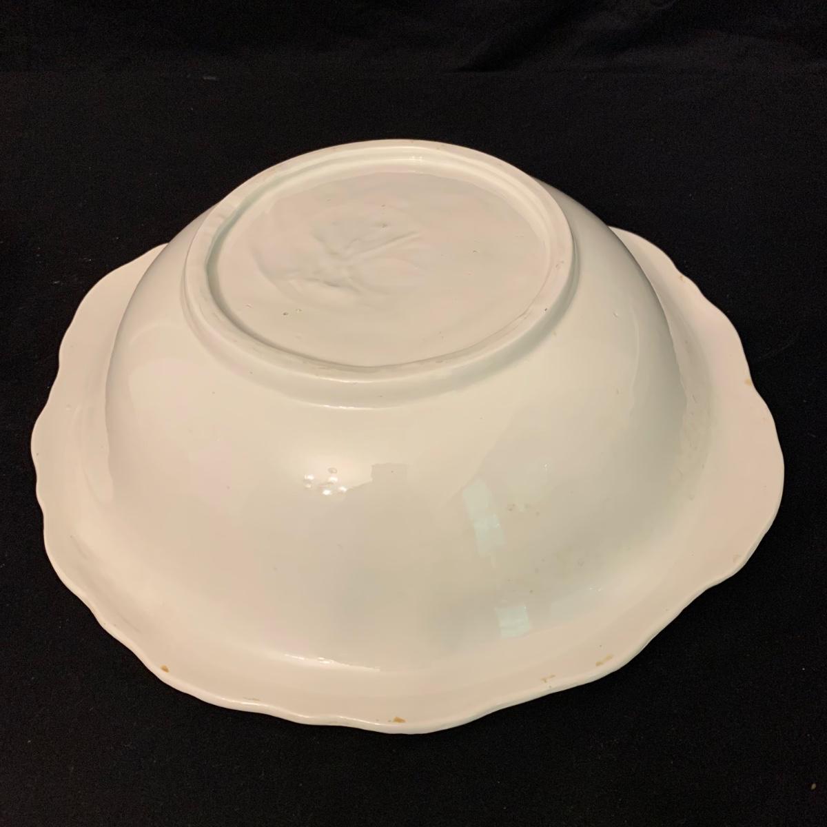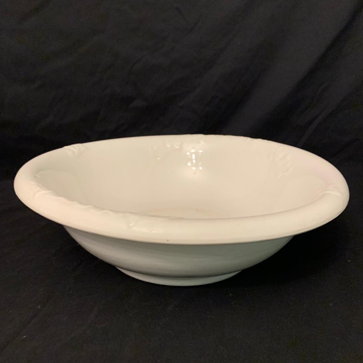 Crown Pottery Co. porcelain pitcher with two wash basins. Pitcher is about 11” tall. There is a crack at the bottom of the handle, shown in photos. The bottom of the pitcher is marked with a crown and “CPCo”, indicating that it is from Crown Pottery Co. The wash basin with the scalloped edge measures 16”D. It has a small crack, shown in photos. The signature is illegible, but it does appear to be from 1968. A crack and some crazing are seen on the second basin as well. Shipping available.