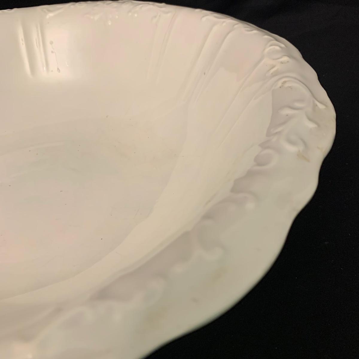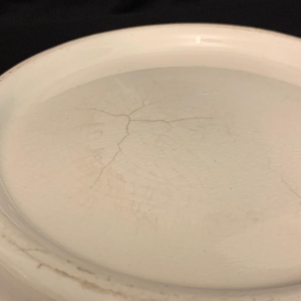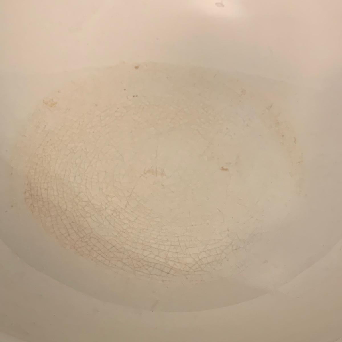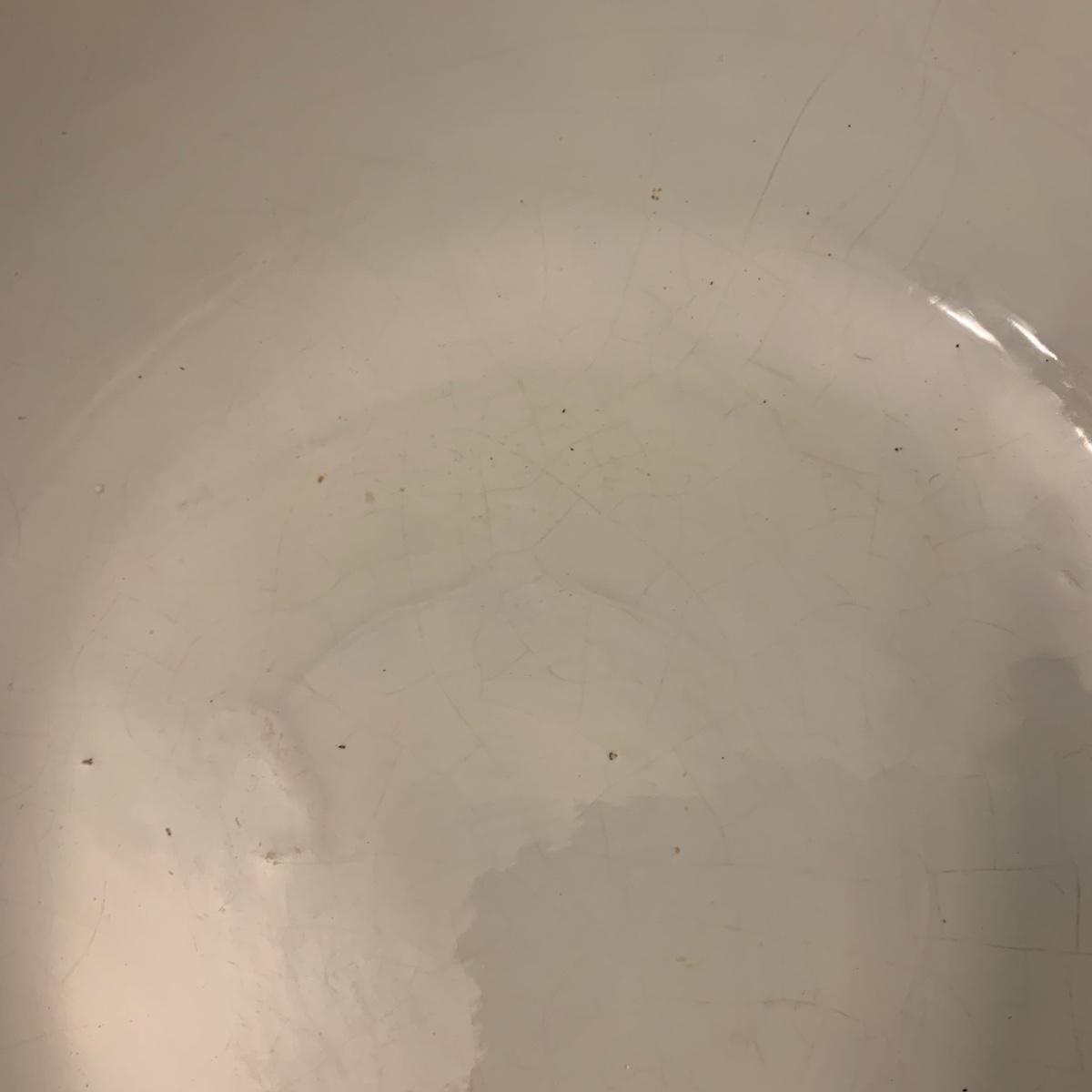 Crown Pottery Co. porcelain pitcher with two wash basins. Pitcher is about 11” tall. There is a crack at the bottom of the handle, shown in photos. The bottom of the pitcher is marked with a crown and “CPCo”, indicating that it is from Crown Pottery Co. The wash basin with the scalloped edge measures 16”D. It has a small crack, shown in photos. The signature is illegible, but it does appear to be from 1968. A crack and some crazing are seen on the second basin as well. Shipping available.