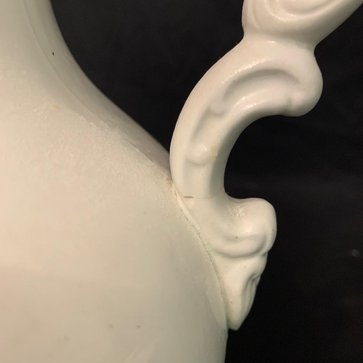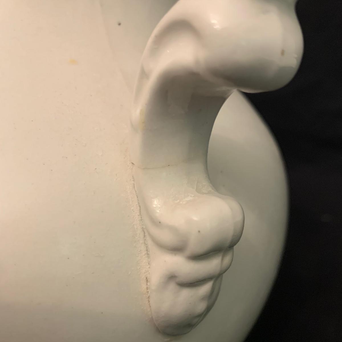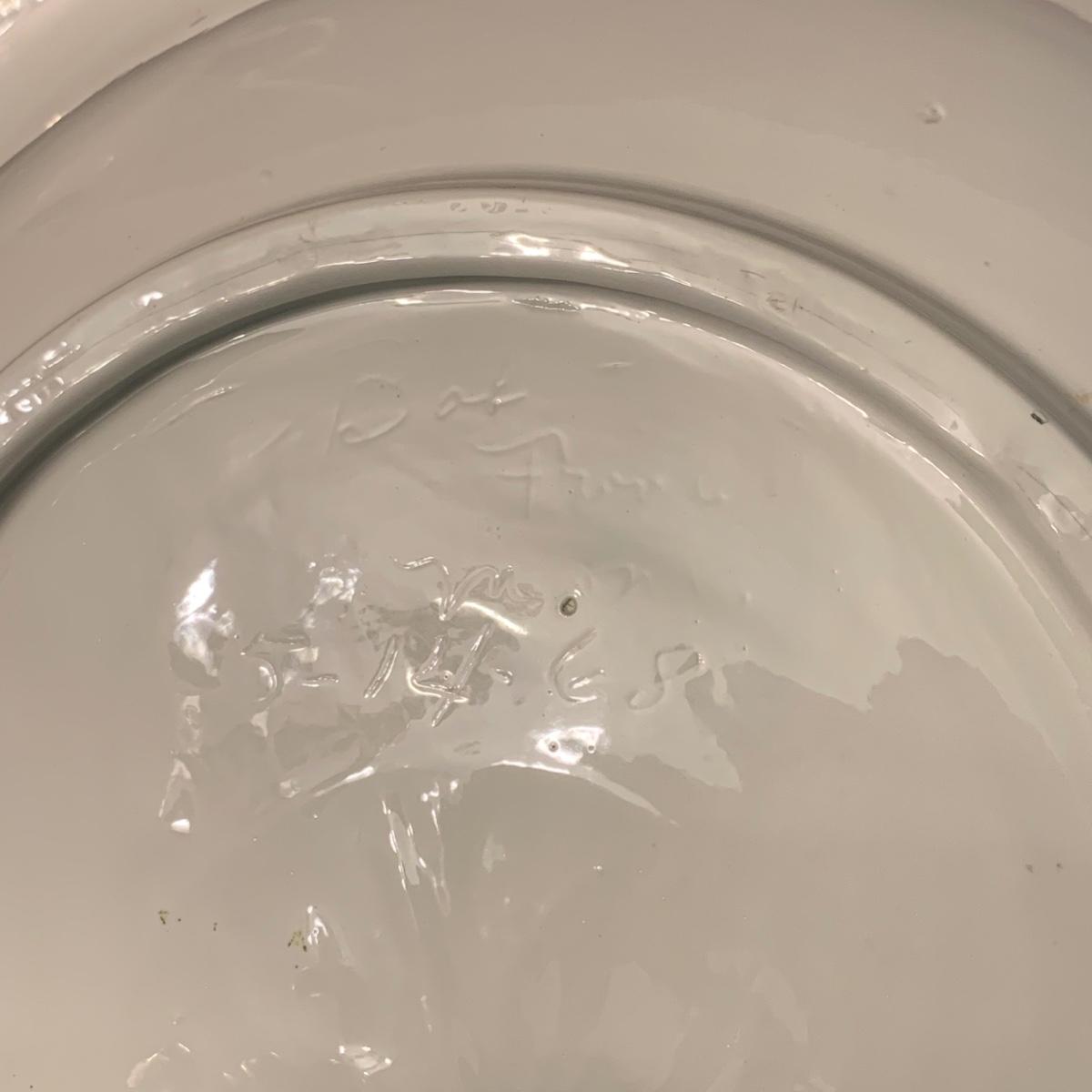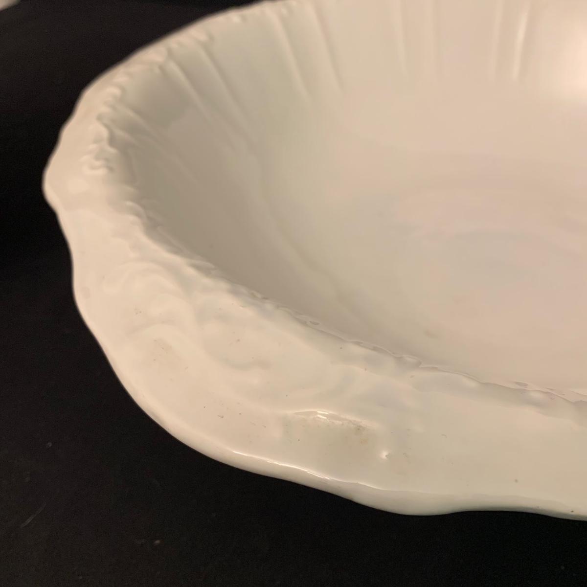 Crown Pottery Co. porcelain pitcher with two wash basins. Pitcher is about 11” tall. There is a crack at the bottom of the handle, shown in photos. The bottom of the pitcher is marked with a crown and “CPCo”, indicating that it is from Crown Pottery Co. The wash basin with the scalloped edge measures 16”D. It has a small crack, shown in photos. The signature is illegible, but it does appear to be from 1968. A crack and some crazing are seen on the second basin as well. Shipping available.