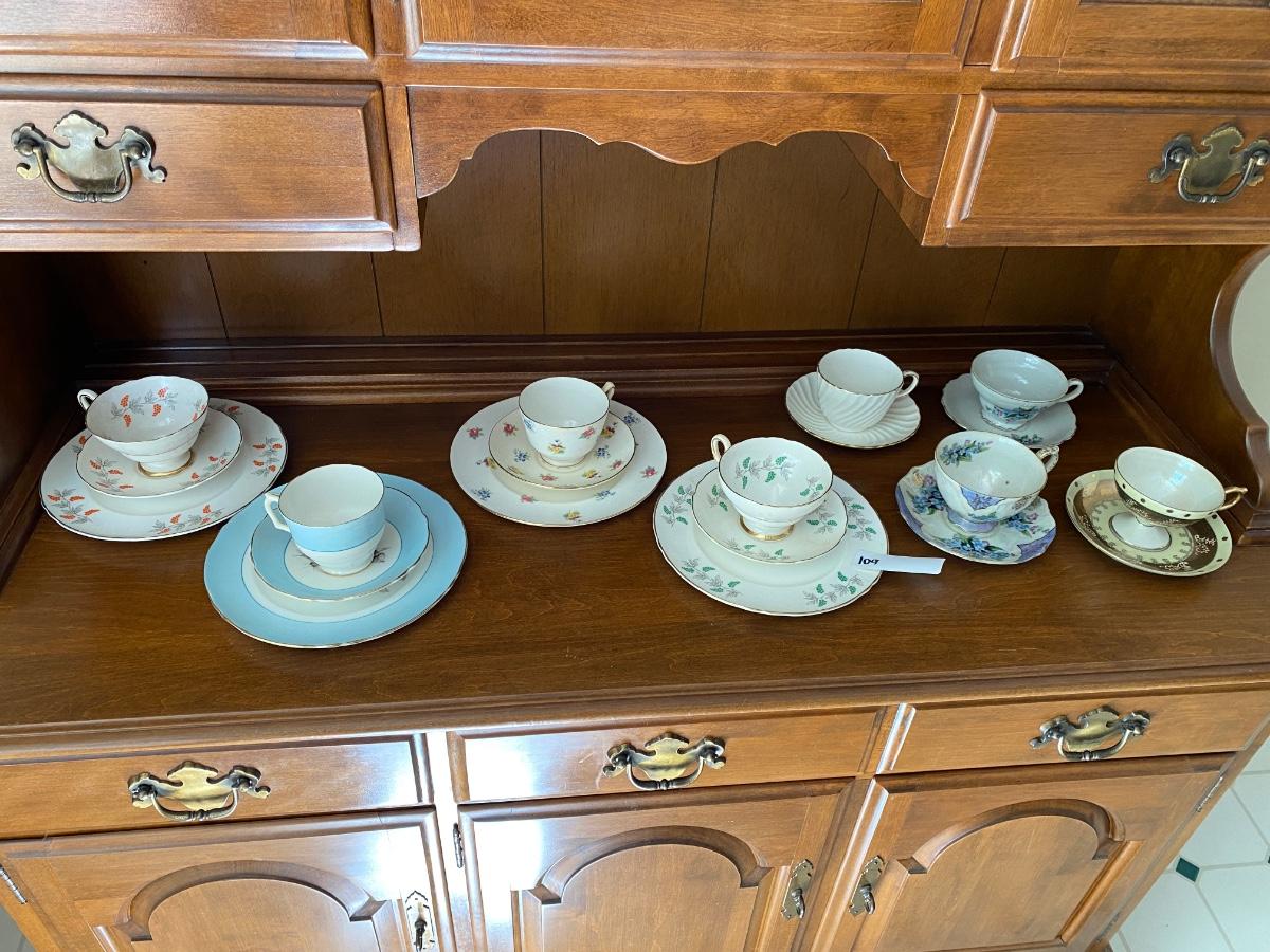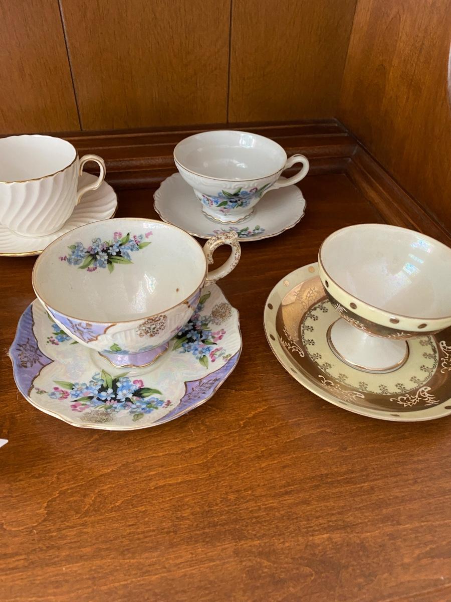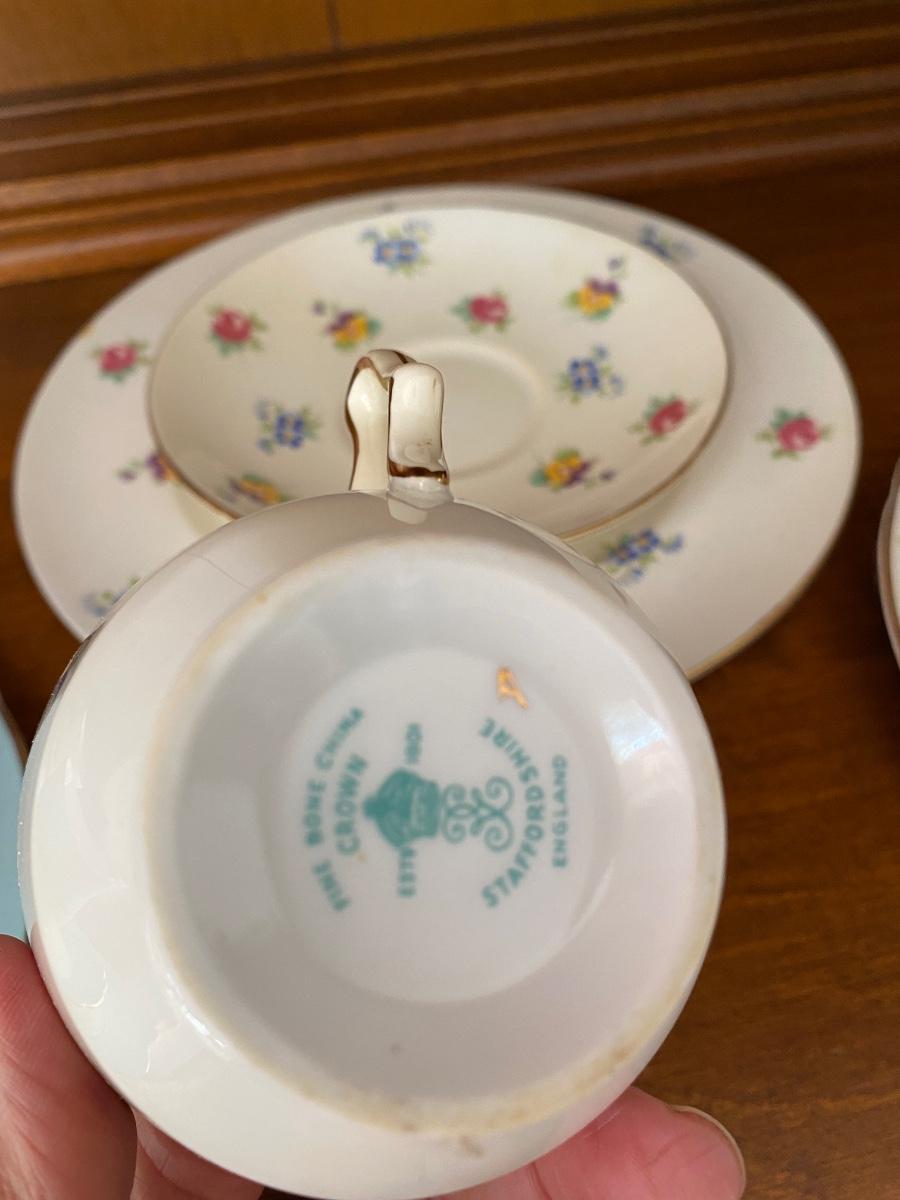 4 Crown Staffordshire England Snack Sets w/ Cup and Saucers, 4 Japan Cup and Saucers As Pictured