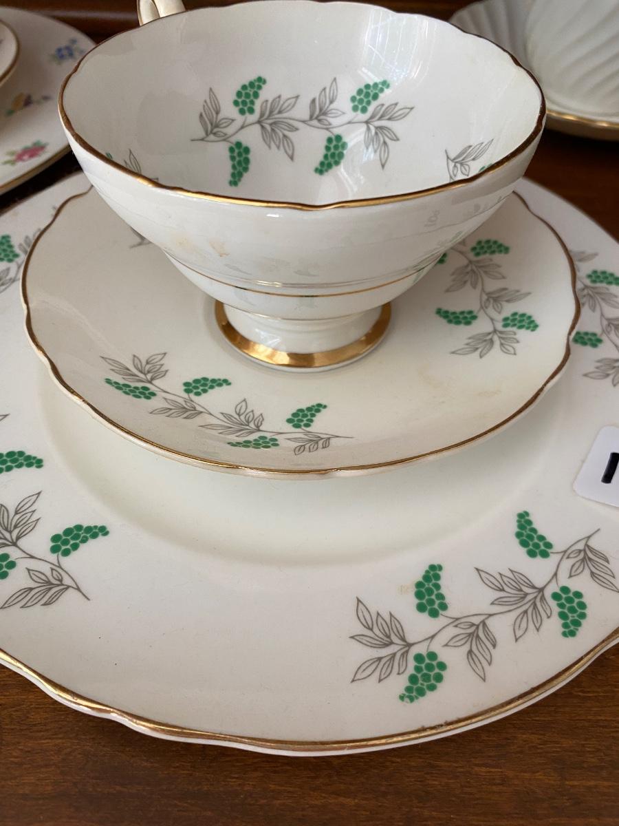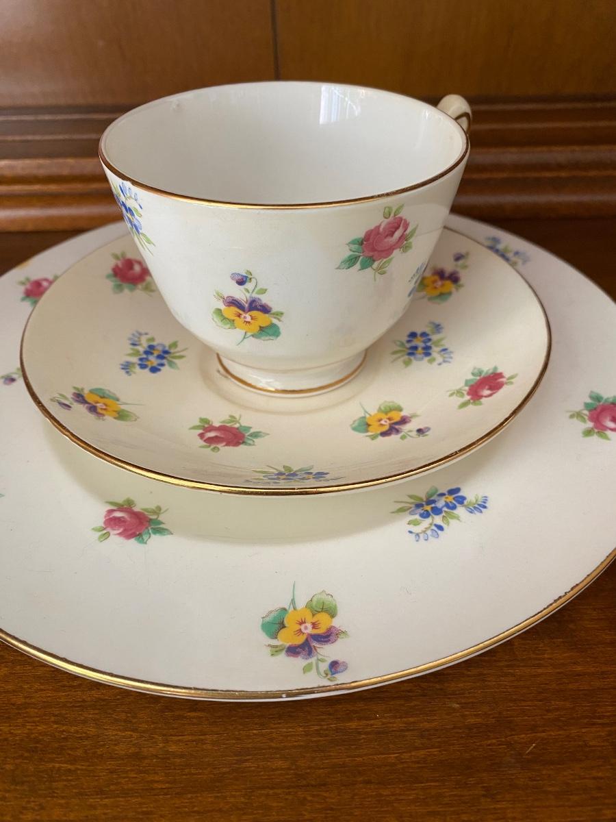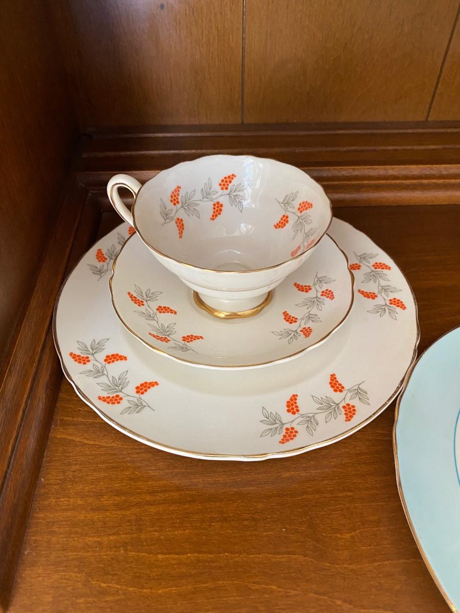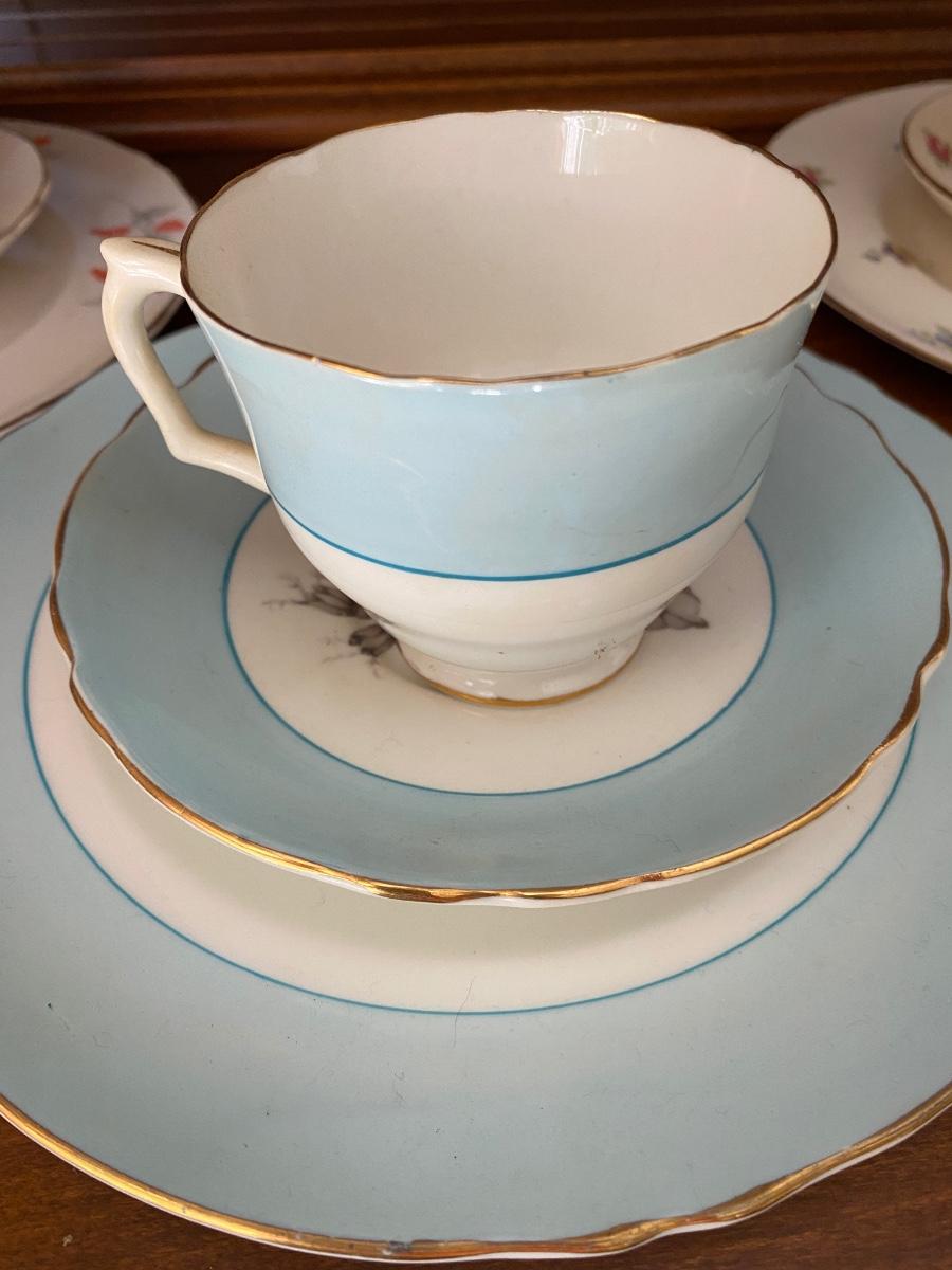 4 Crown Staffordshire England Snack Sets w/ Cup and Saucers, 4 Japan Cup and Saucers As Pictured