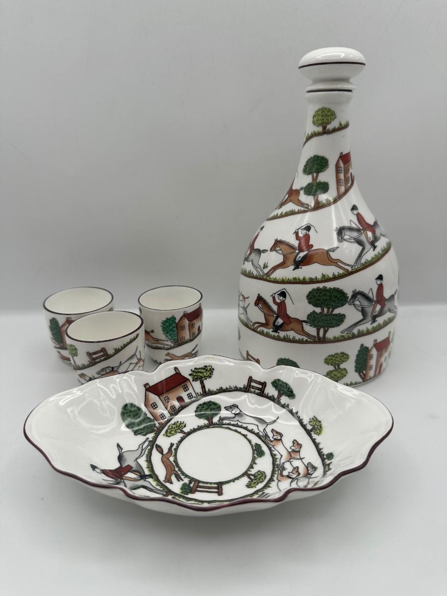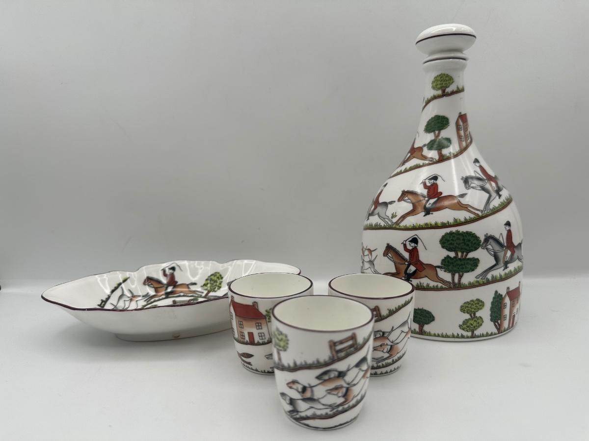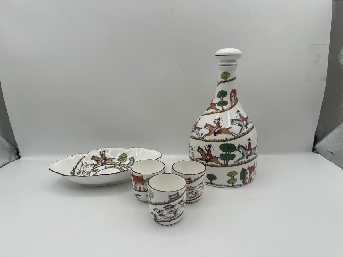 Crown Staffordshire Hunting Scene Bone China Decanter Set, England, 5 Pieces