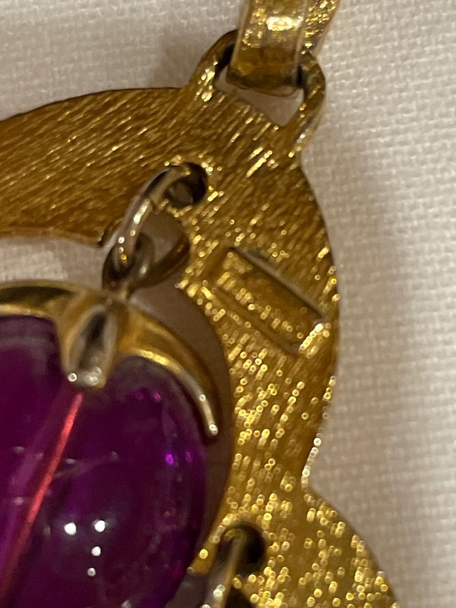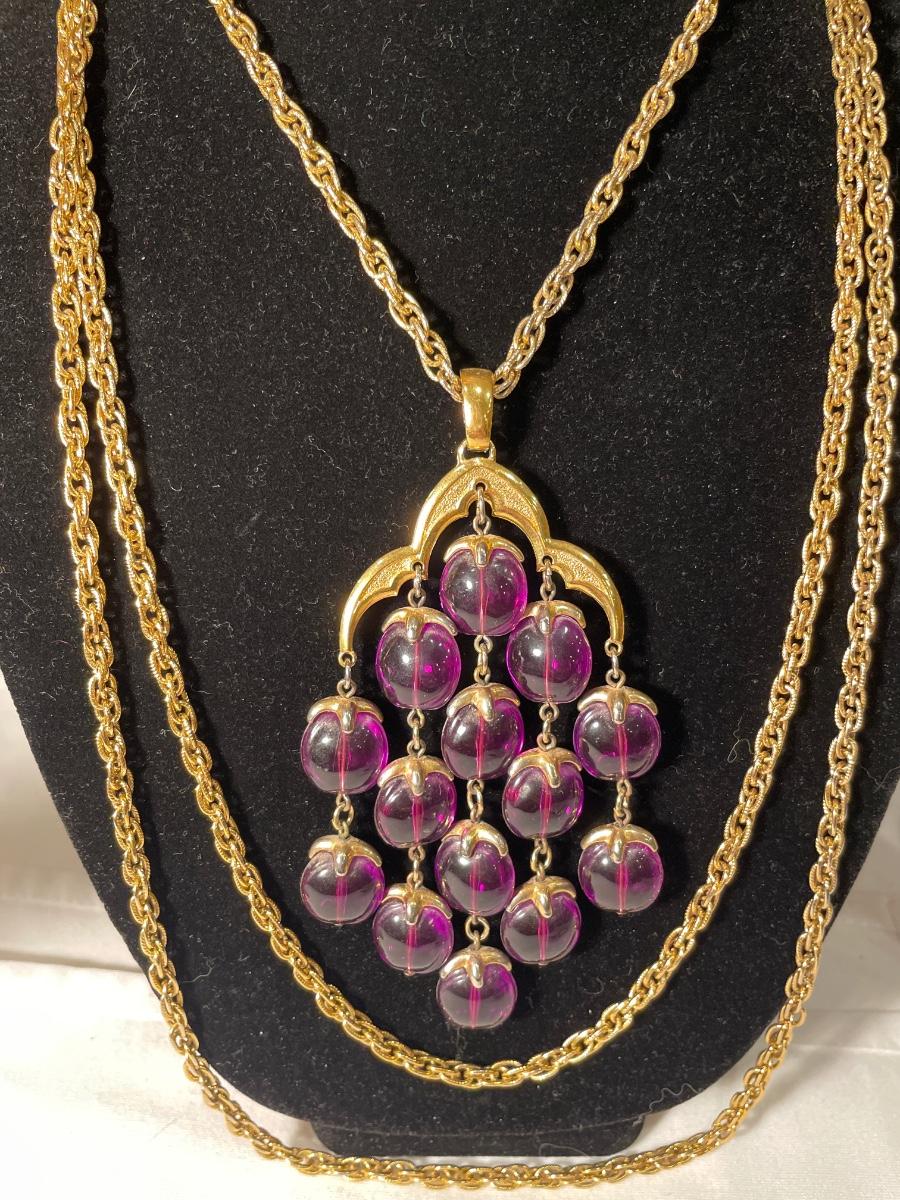 Layers of purple beads and 2 layers of gold tone chains. This vintage necklace is definitely a statement piece!!
