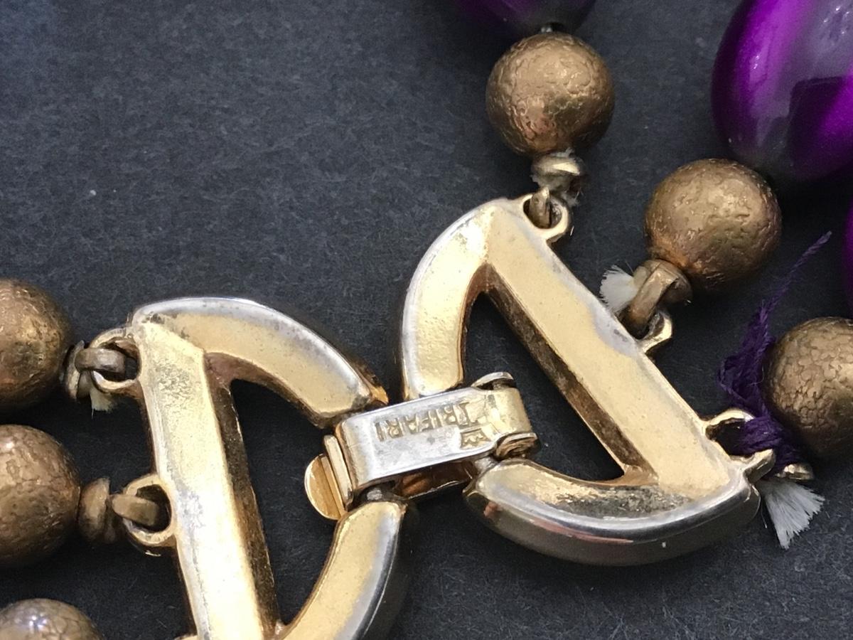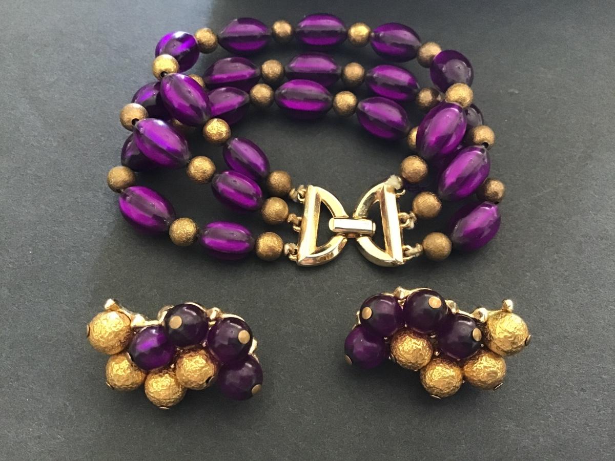 Crown Trifari Multi Strand Purple Lucite Bead Bracelet with Matching Earrings