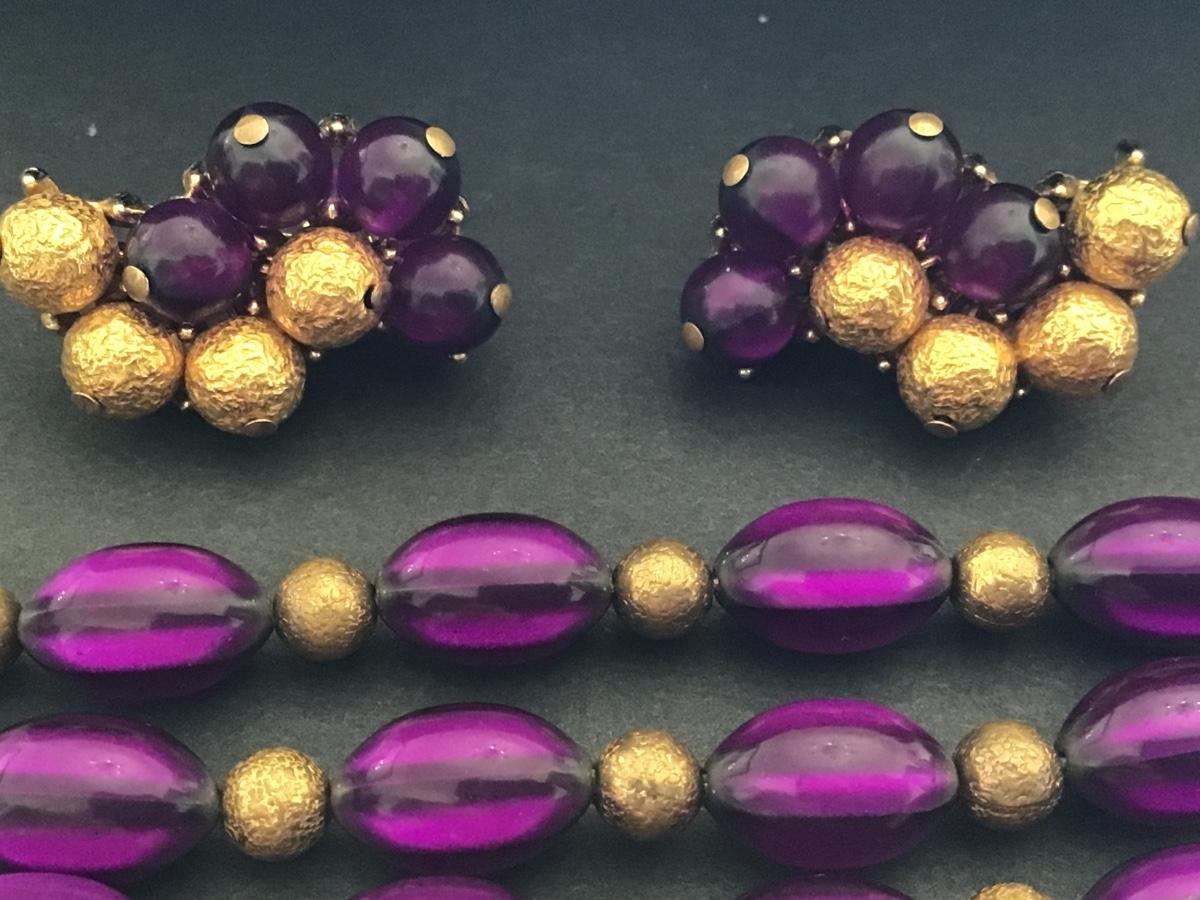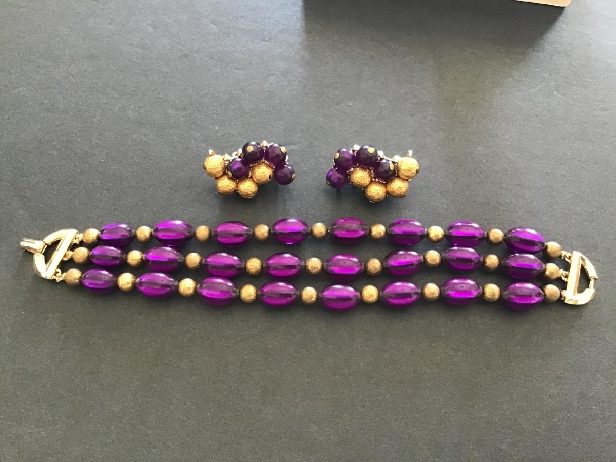 Crown Trifari Multi Strand Purple Lucite Bead Bracelet with Matching Earrings
