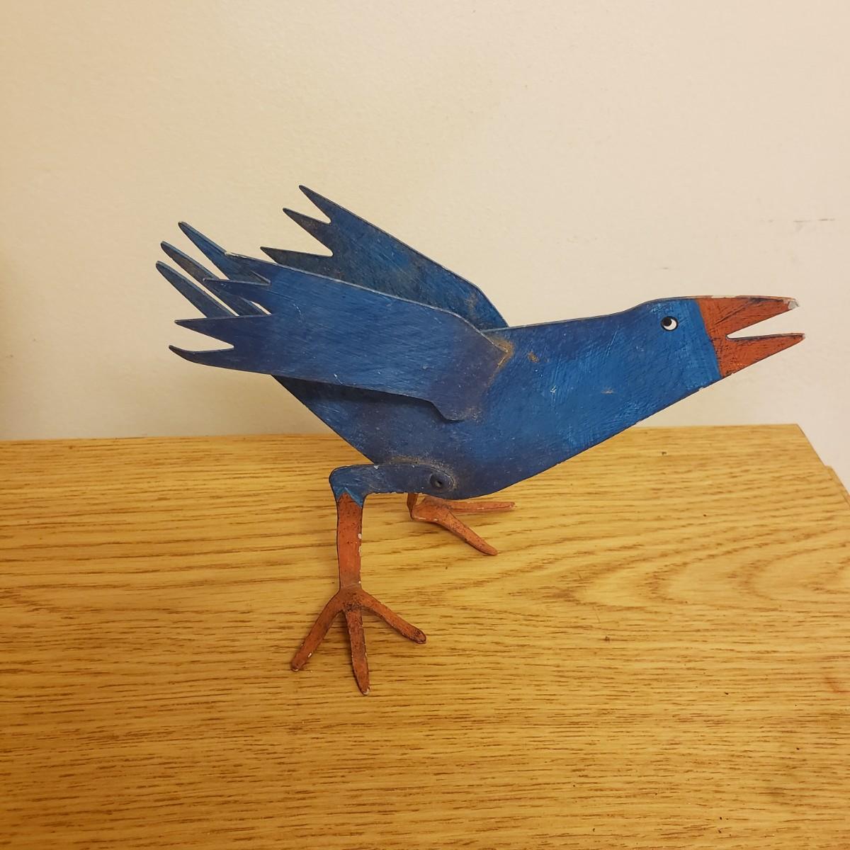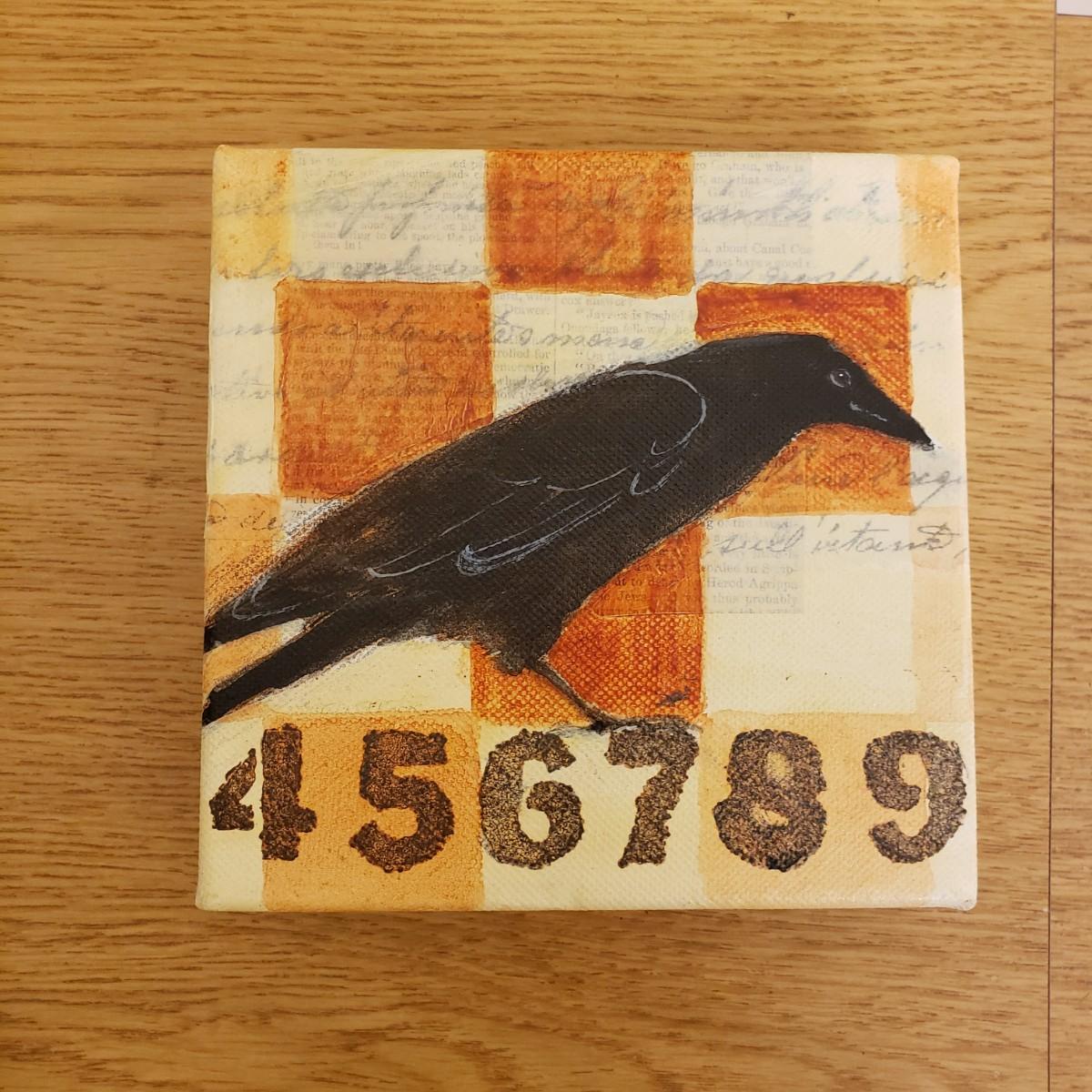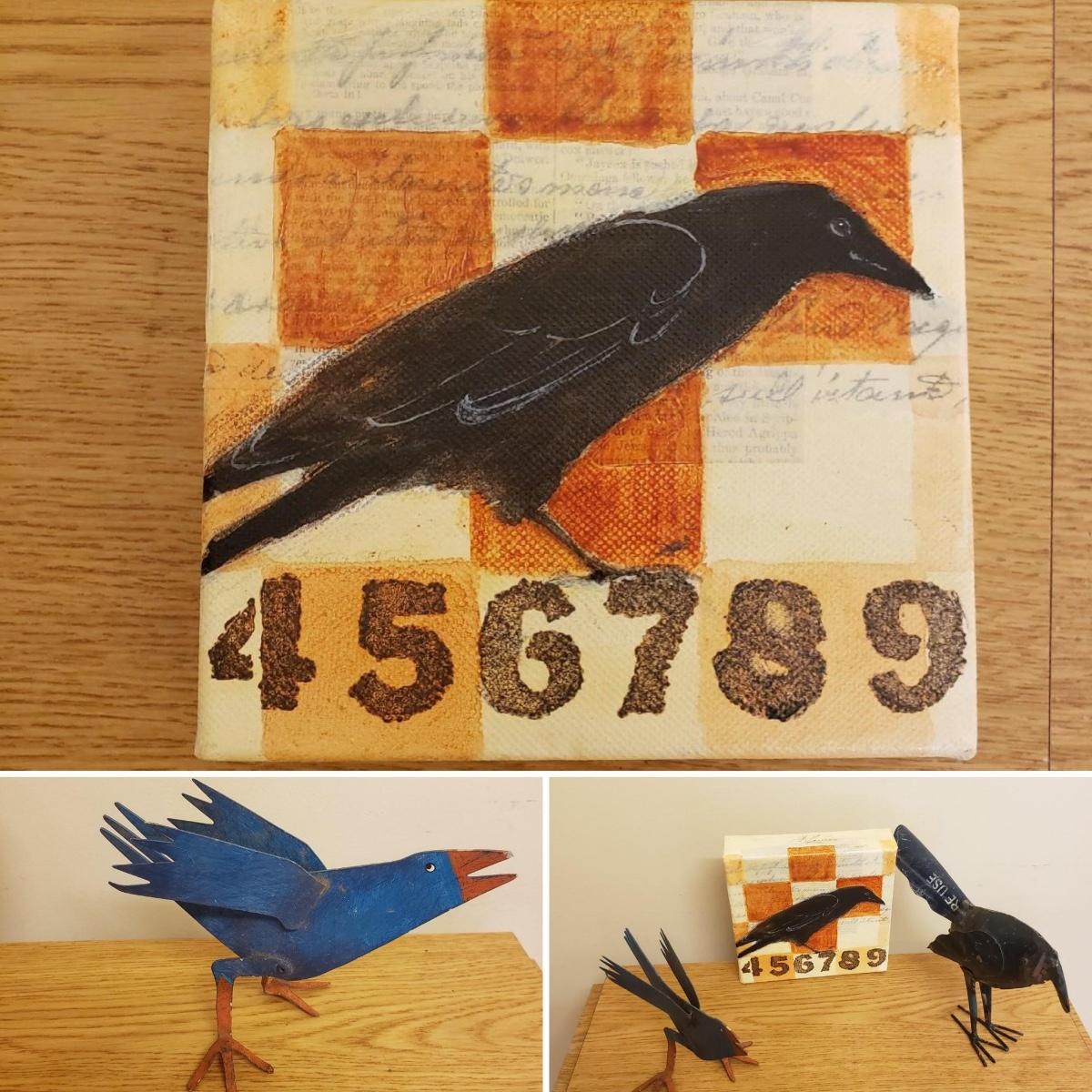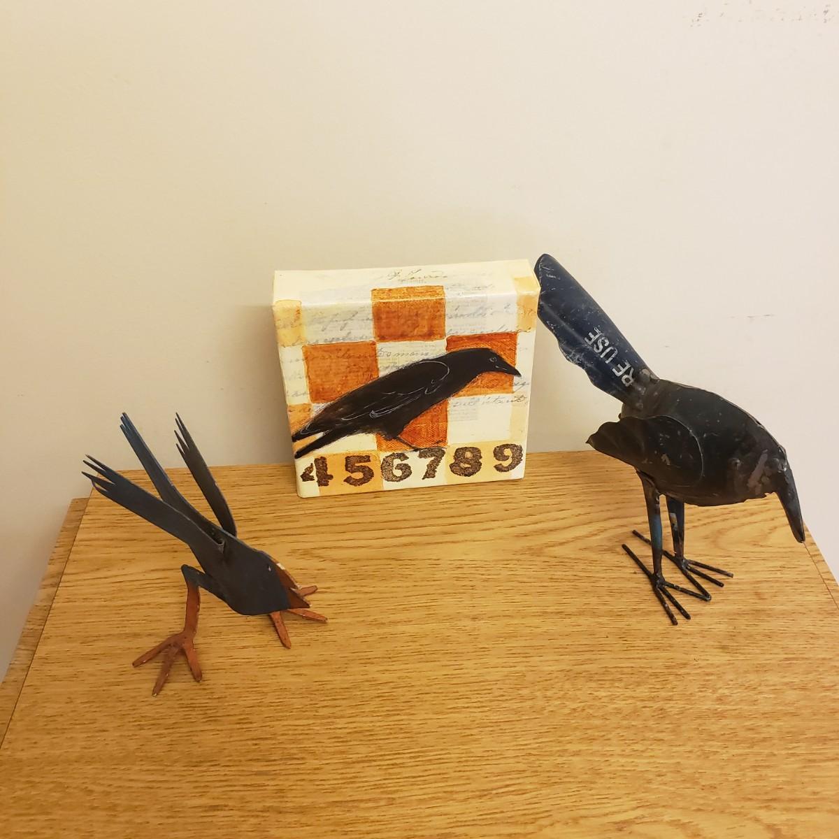 This three piece lot is everything Crows! The 6" x 6" mixed media picture is by Sharon Stolzenberger. The "Re Use" black crow has recycled pieces. The blue crow also has a recycled vibe to it.