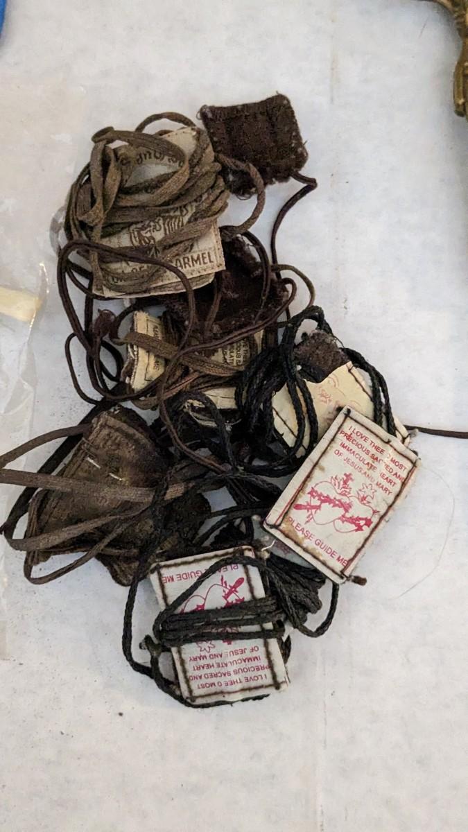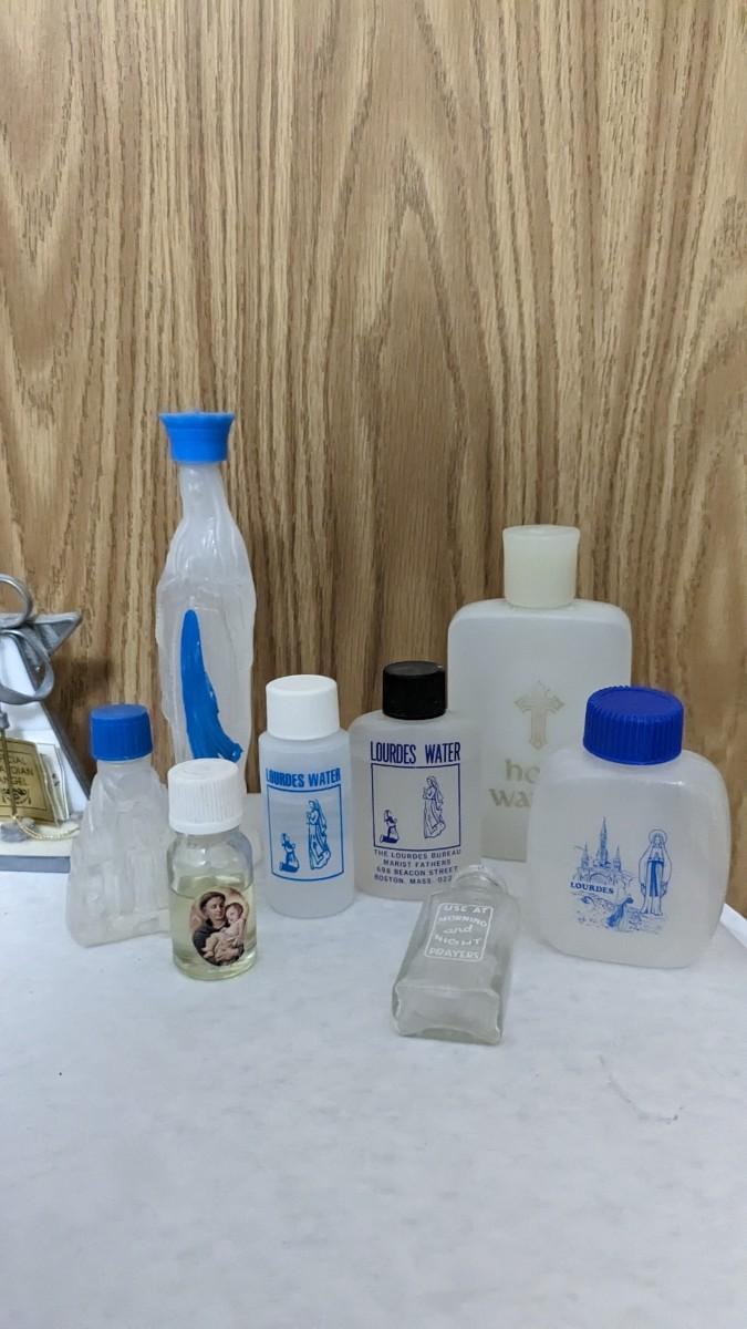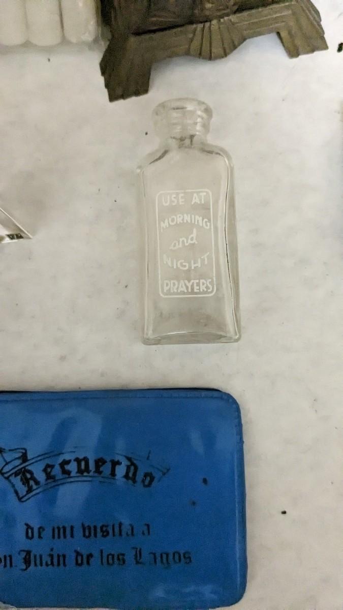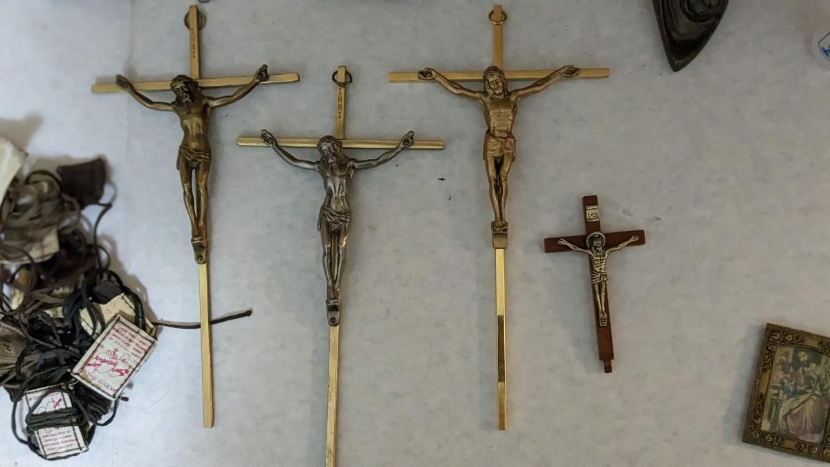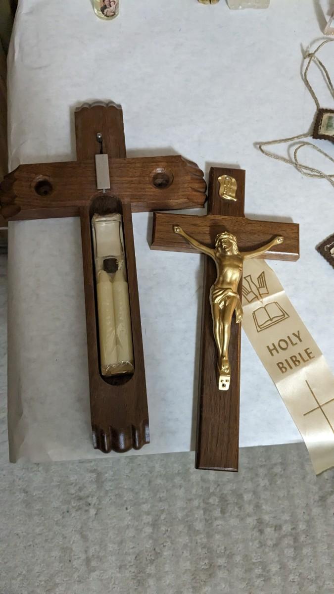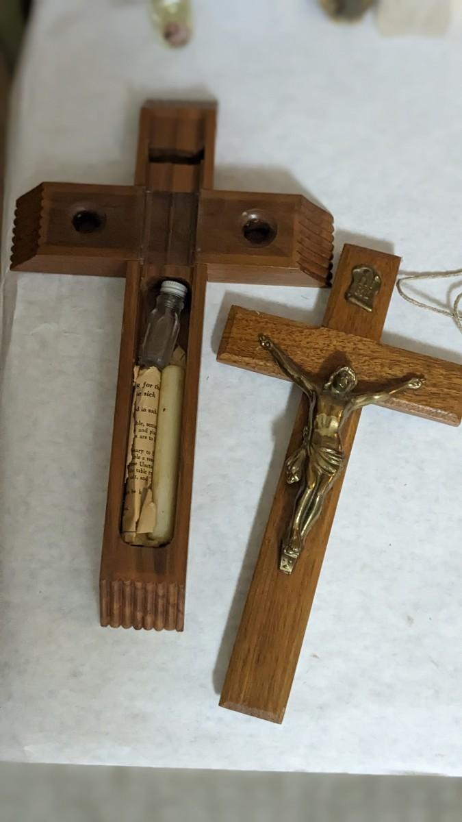 (3) standard brass crucifixes and 4" wood backed piece. (2) travelling crucifixes with contents-one was never used. Also includes 8 varied decade holy water/oil bottles with door dip, and 10 small travelling pieces. Lots of vintage in here and very hard to find pieces. livingroom