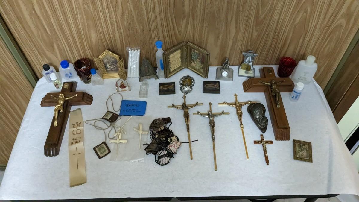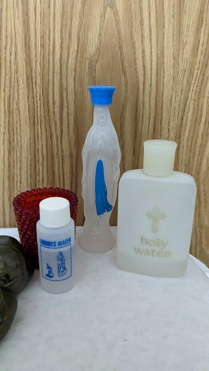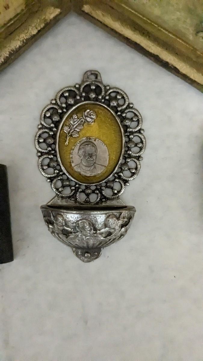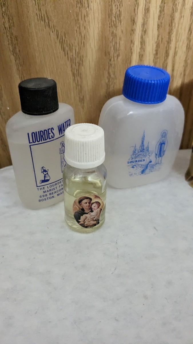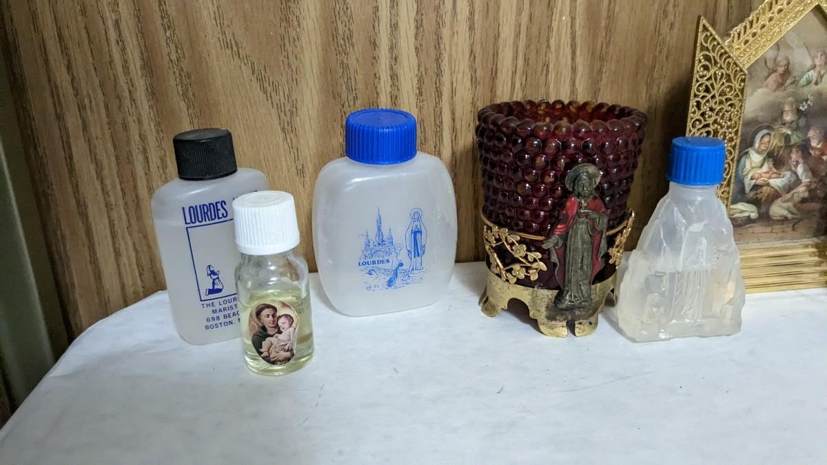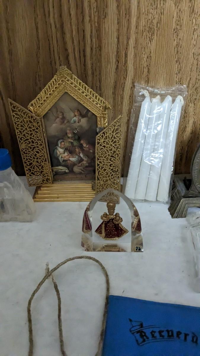 (3) standard brass crucifixes and 4" wood backed piece. (2) travelling crucifixes with contents-one was never used. Also includes 8 varied decade holy water/oil bottles with door dip, and 10 small travelling pieces. Lots of vintage in here and very hard to find pieces. livingroom