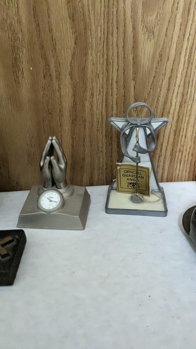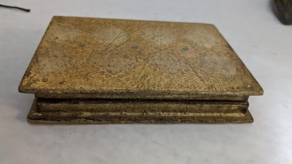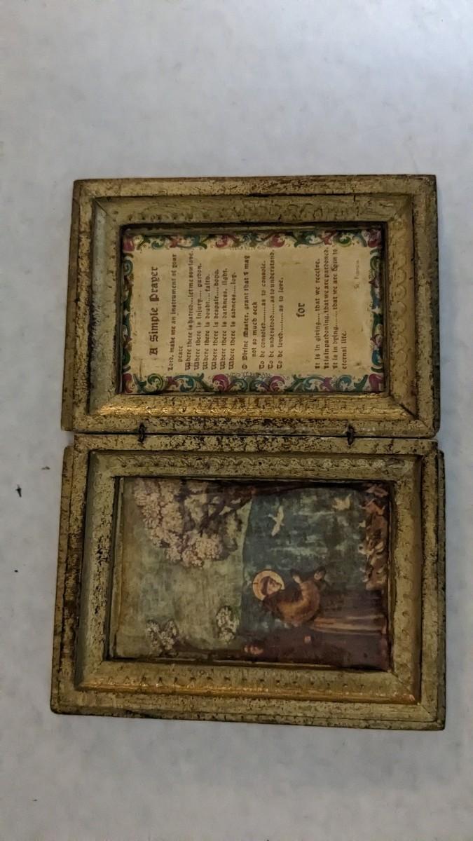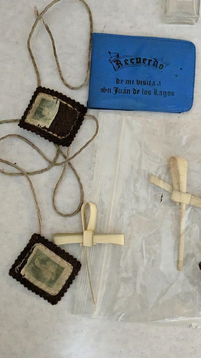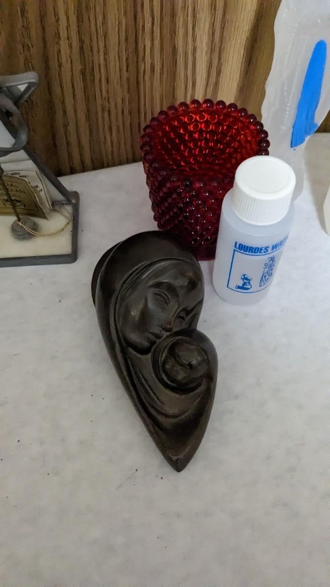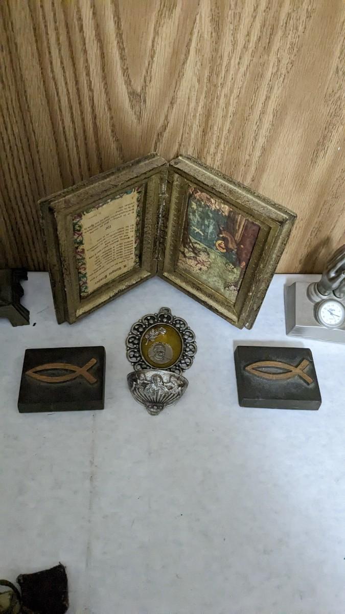 (3) standard brass crucifixes and 4" wood backed piece. (2) travelling crucifixes with contents-one was never used. Also includes 8 varied decade holy water/oil bottles with door dip, and 10 small travelling pieces. Lots of vintage in here and very hard to find pieces. livingroom