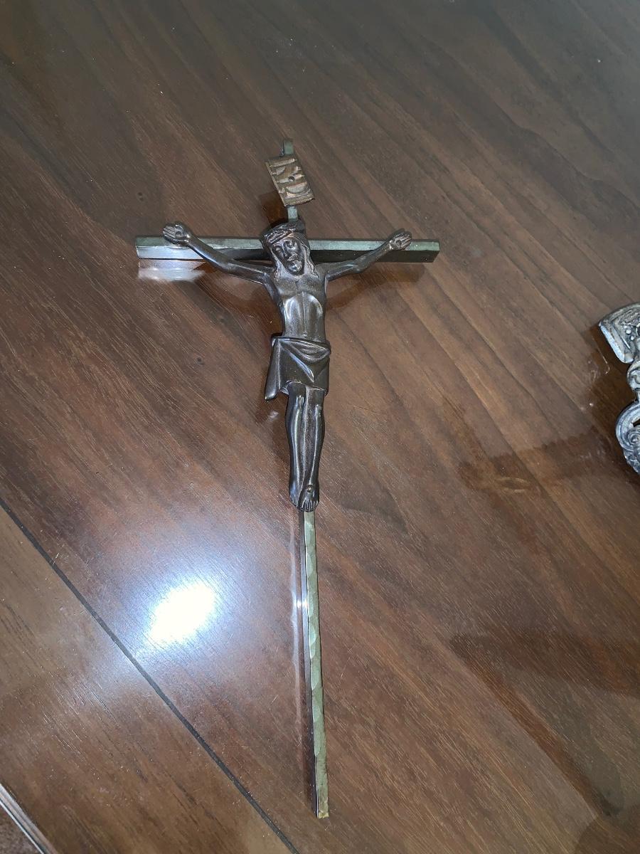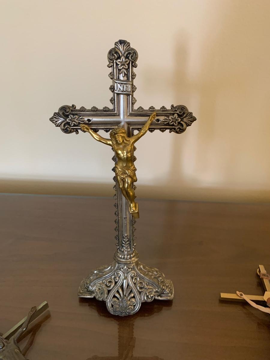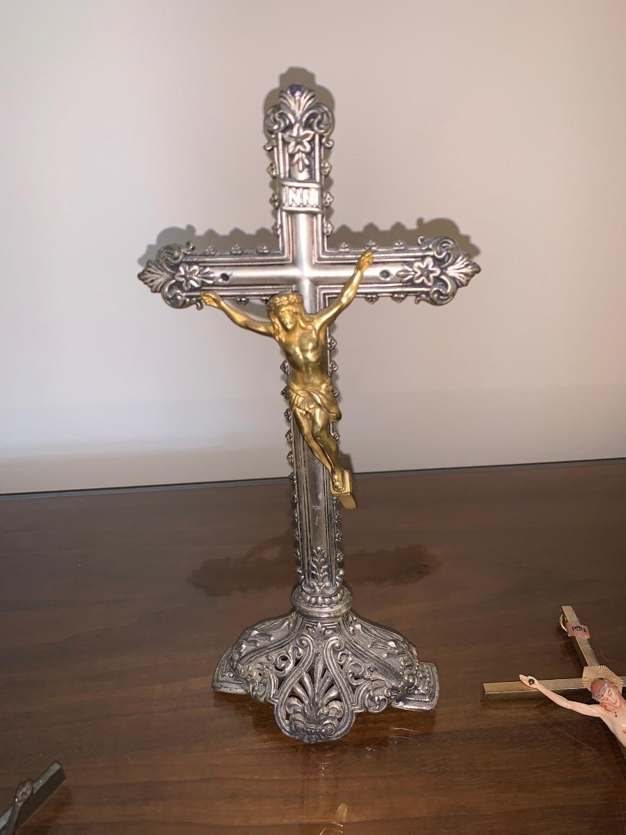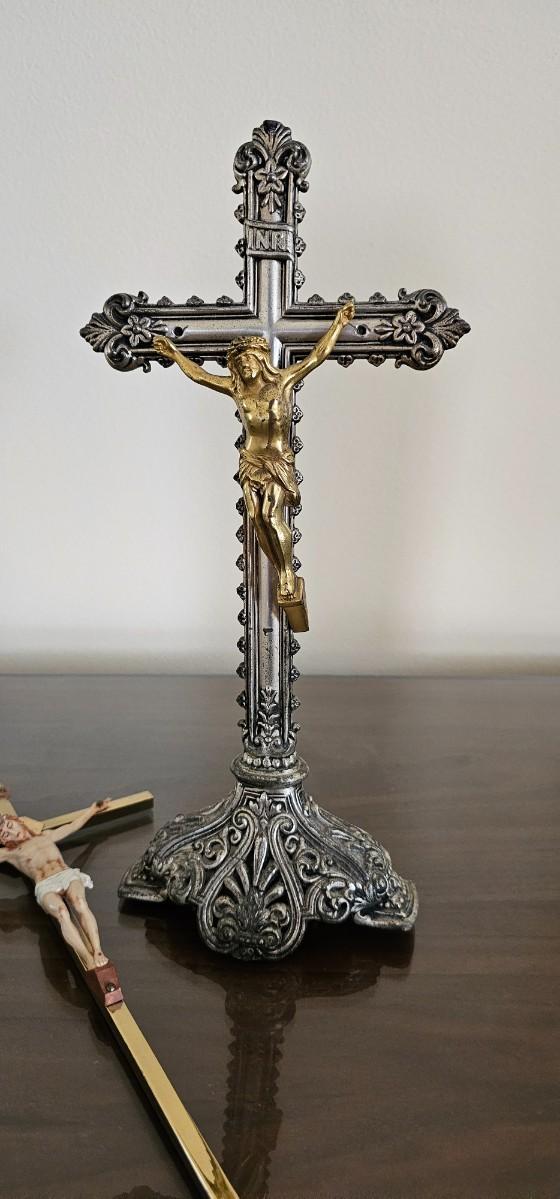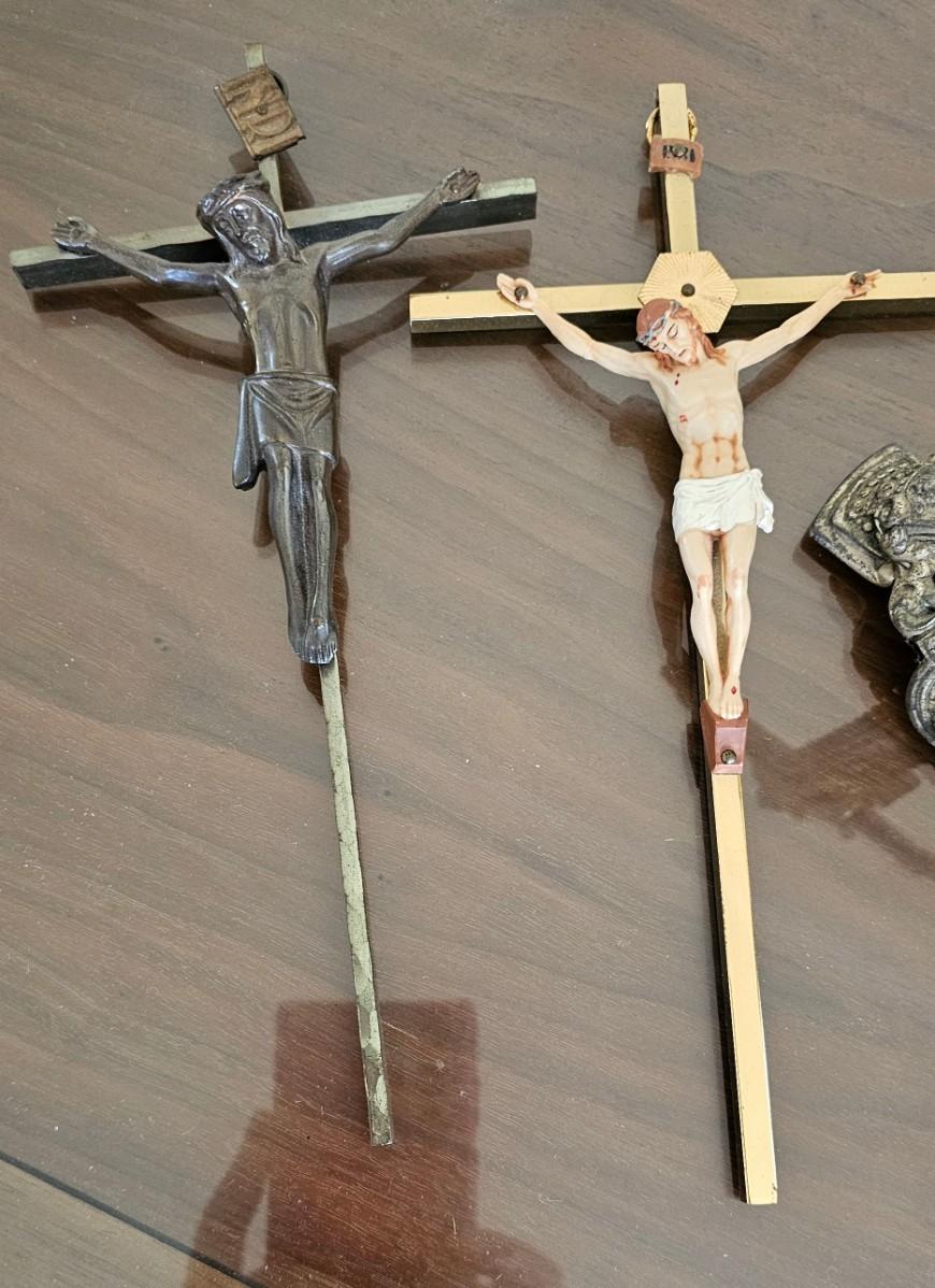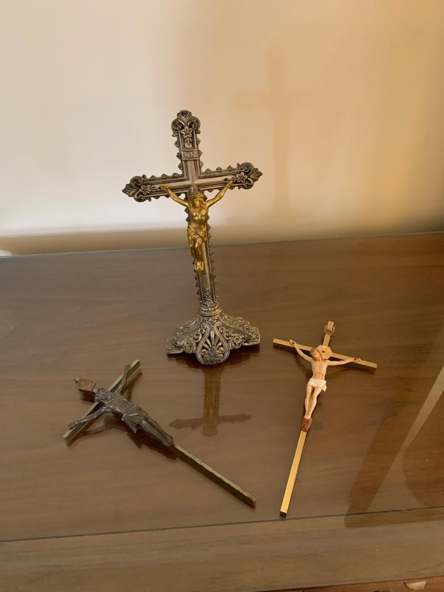 Vintage collection of 3 vintage metal crucifixes . Standing ornate has missing screws as shown in photo. All three are solid metal.