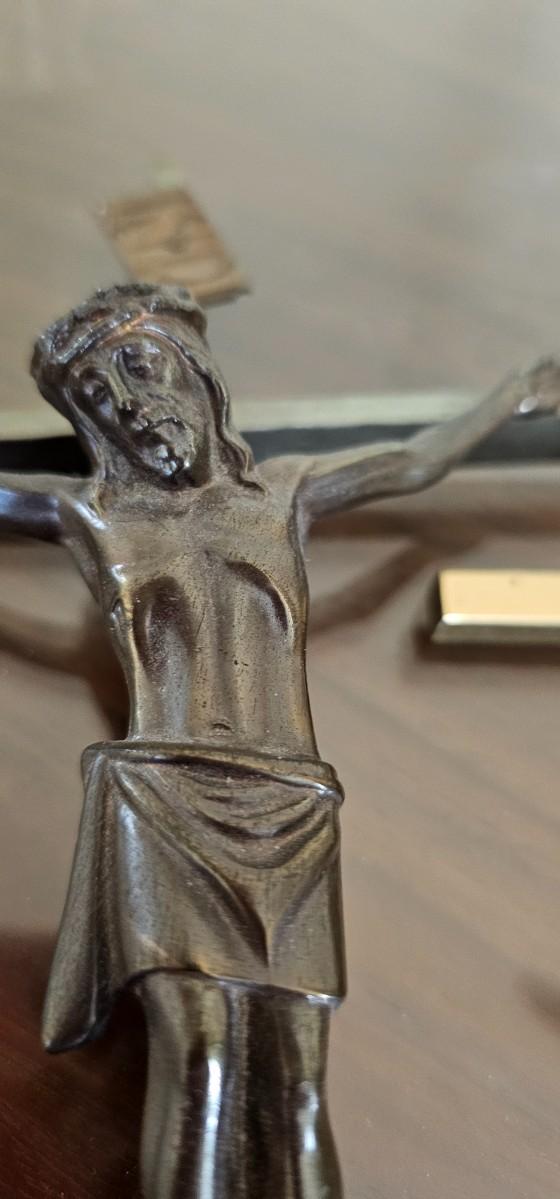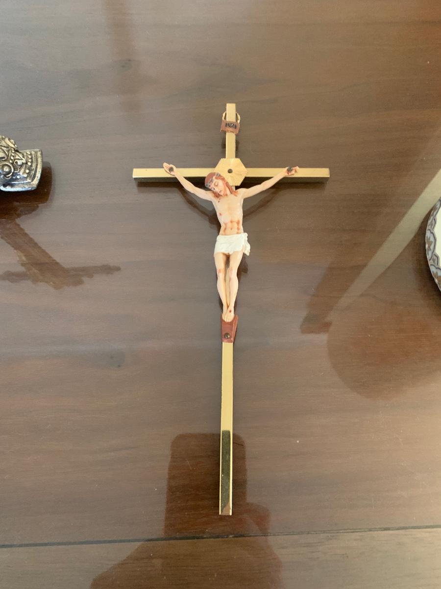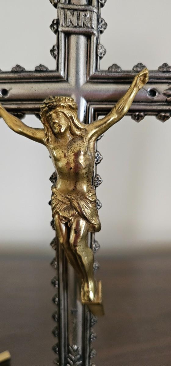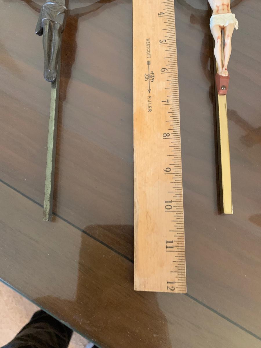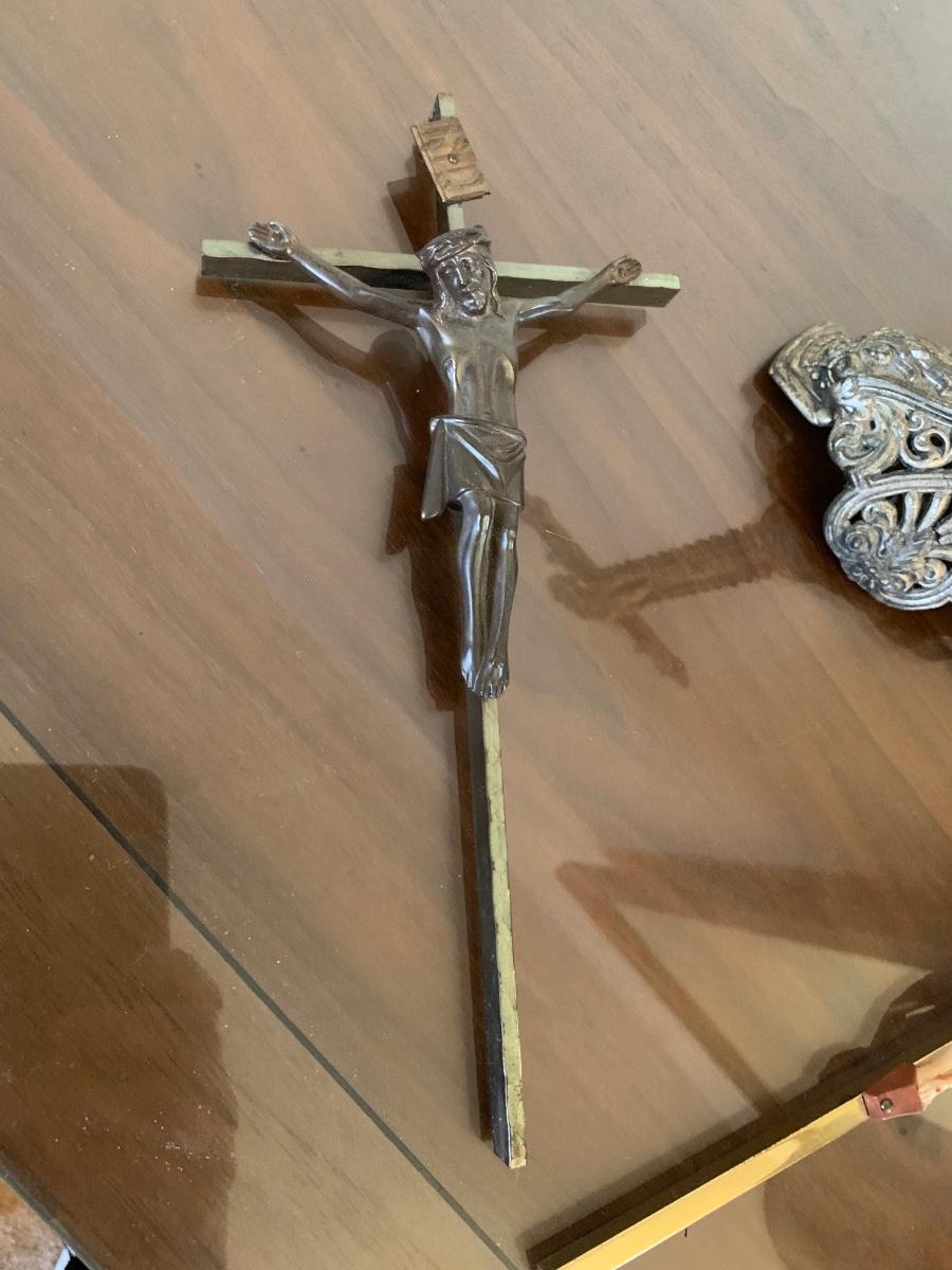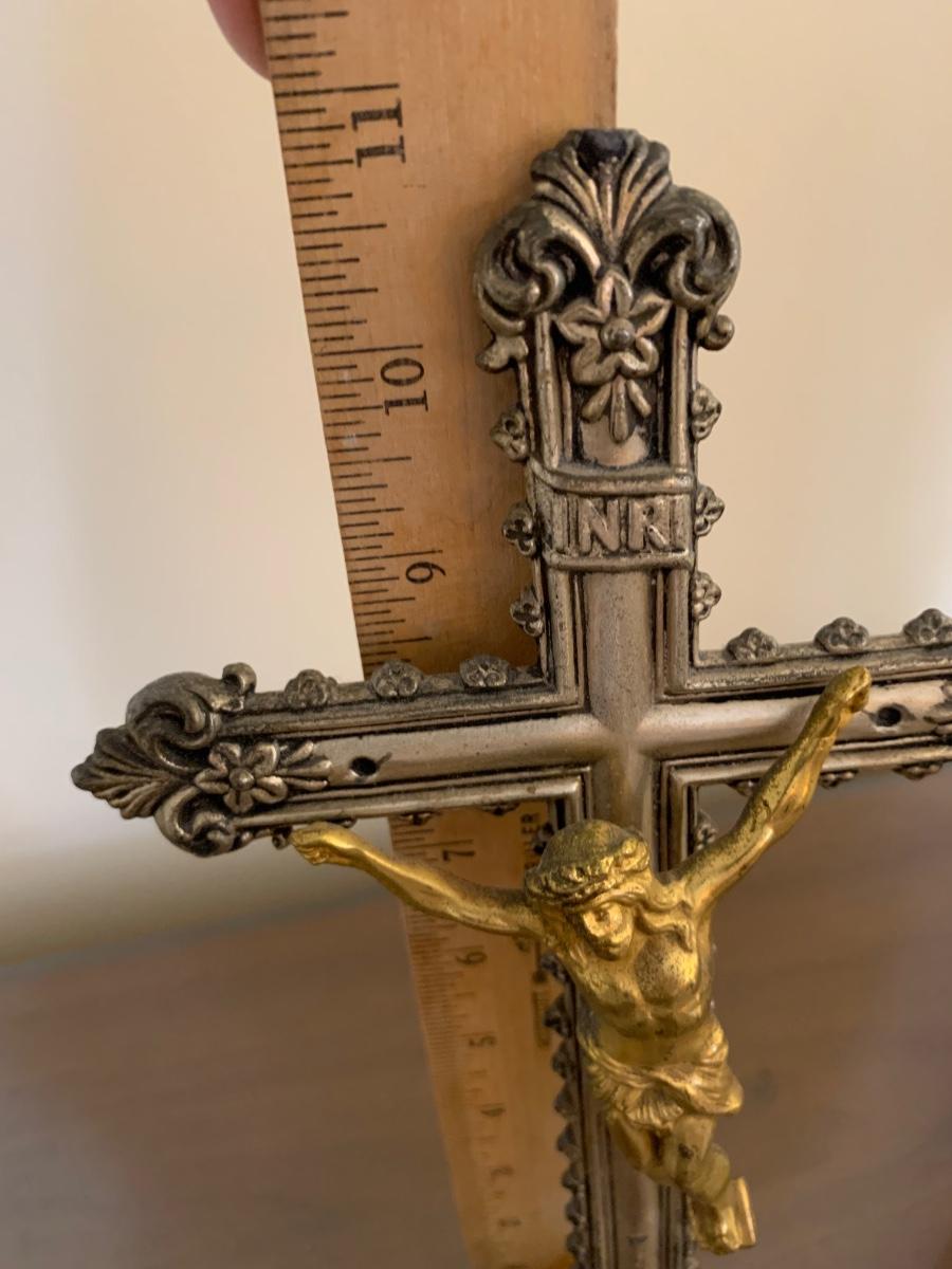Vintage collection of 3 vintage metal crucifixes . Standing ornate has missing screws as shown in photo. All three are solid metal.