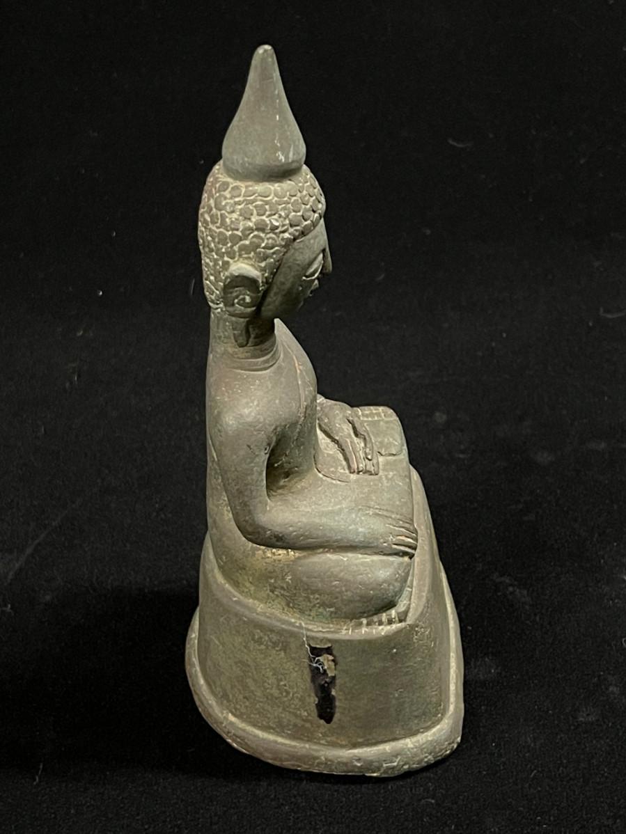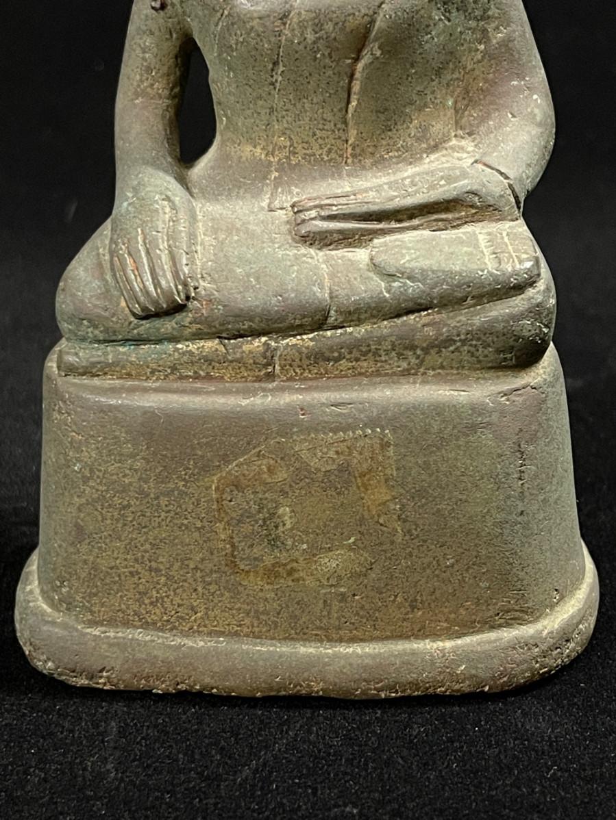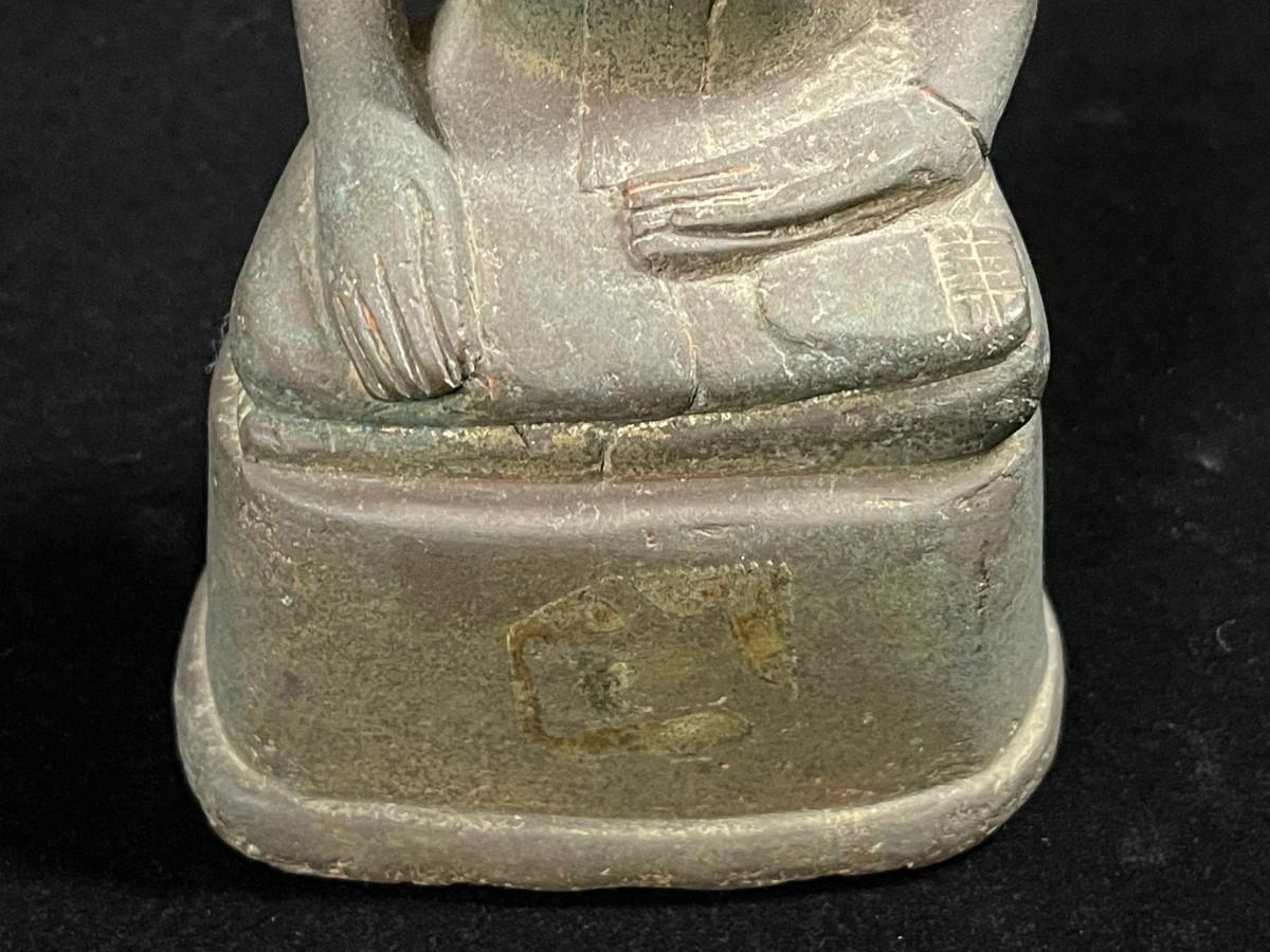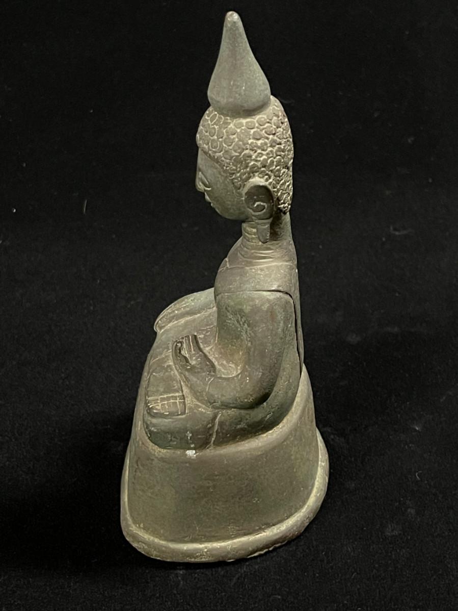 DESCRIPTION: This small bronze Buddha is an Ayutthaya-style Buddha from Thailand. Posed seated and touching the earth at the moment of enlightenment, the figure is seated on an unadorned throne that retains the a fragment of the original antique import stamp.