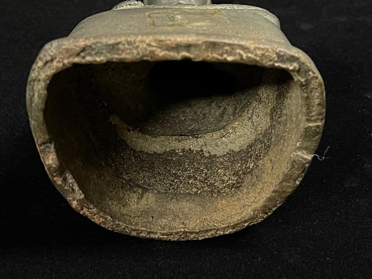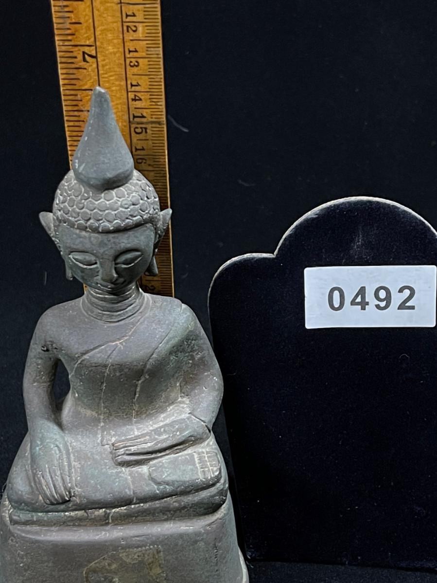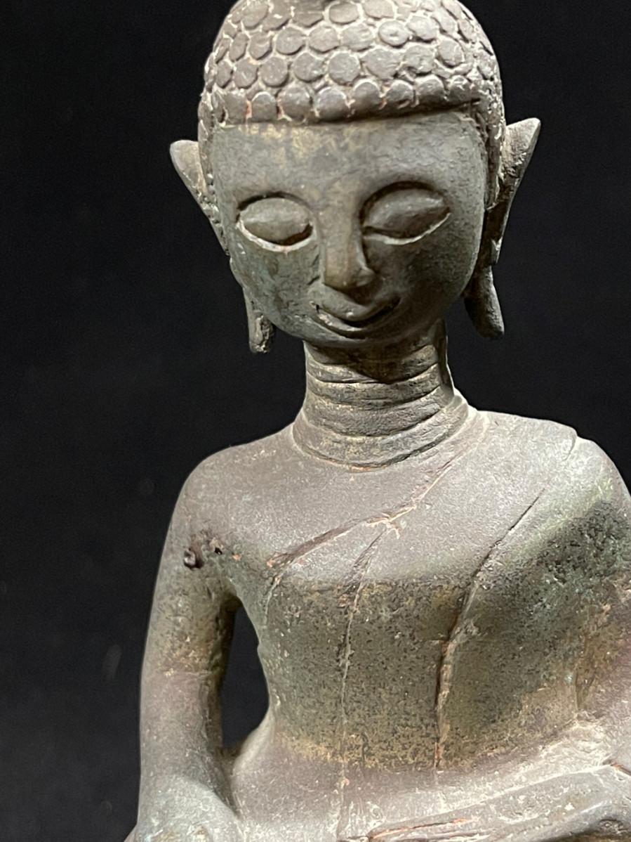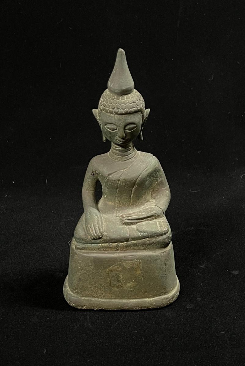 DESCRIPTION: This small bronze Buddha is an Ayutthaya-style Buddha from Thailand. Posed seated and touching the earth at the moment of enlightenment, the figure is seated on an unadorned throne that retains the a fragment of the original antique import stamp.