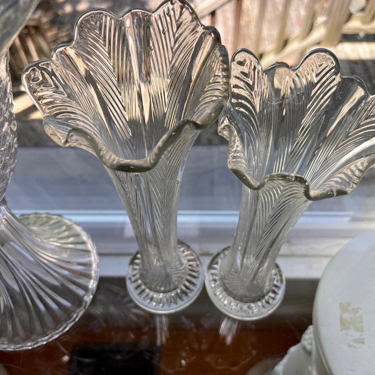 The large vase in the middle is heavy is stamped Imperial Crystal. The 2 more narrow ones are believed to be feather stretch swing vases. Very pretty collection!