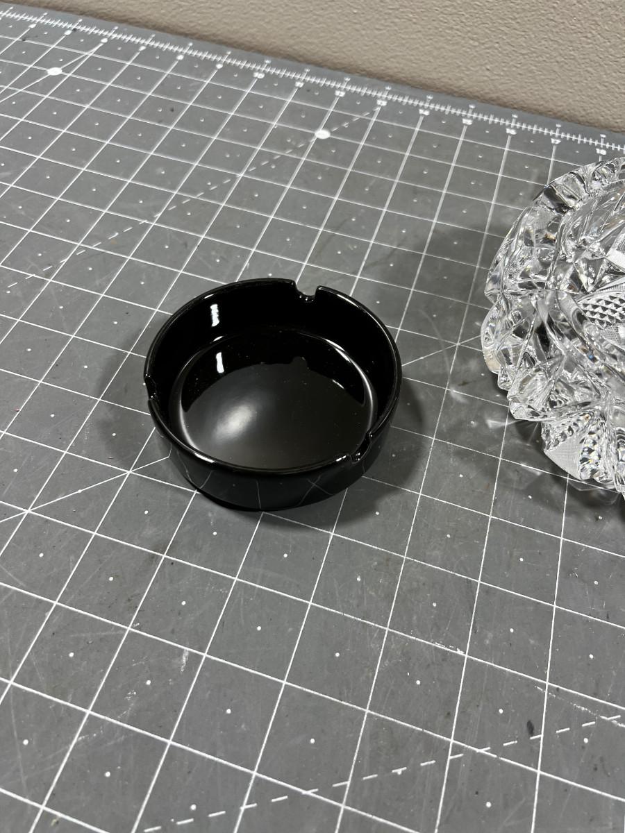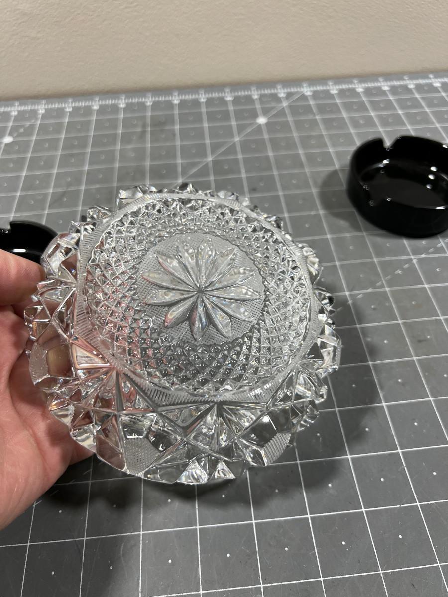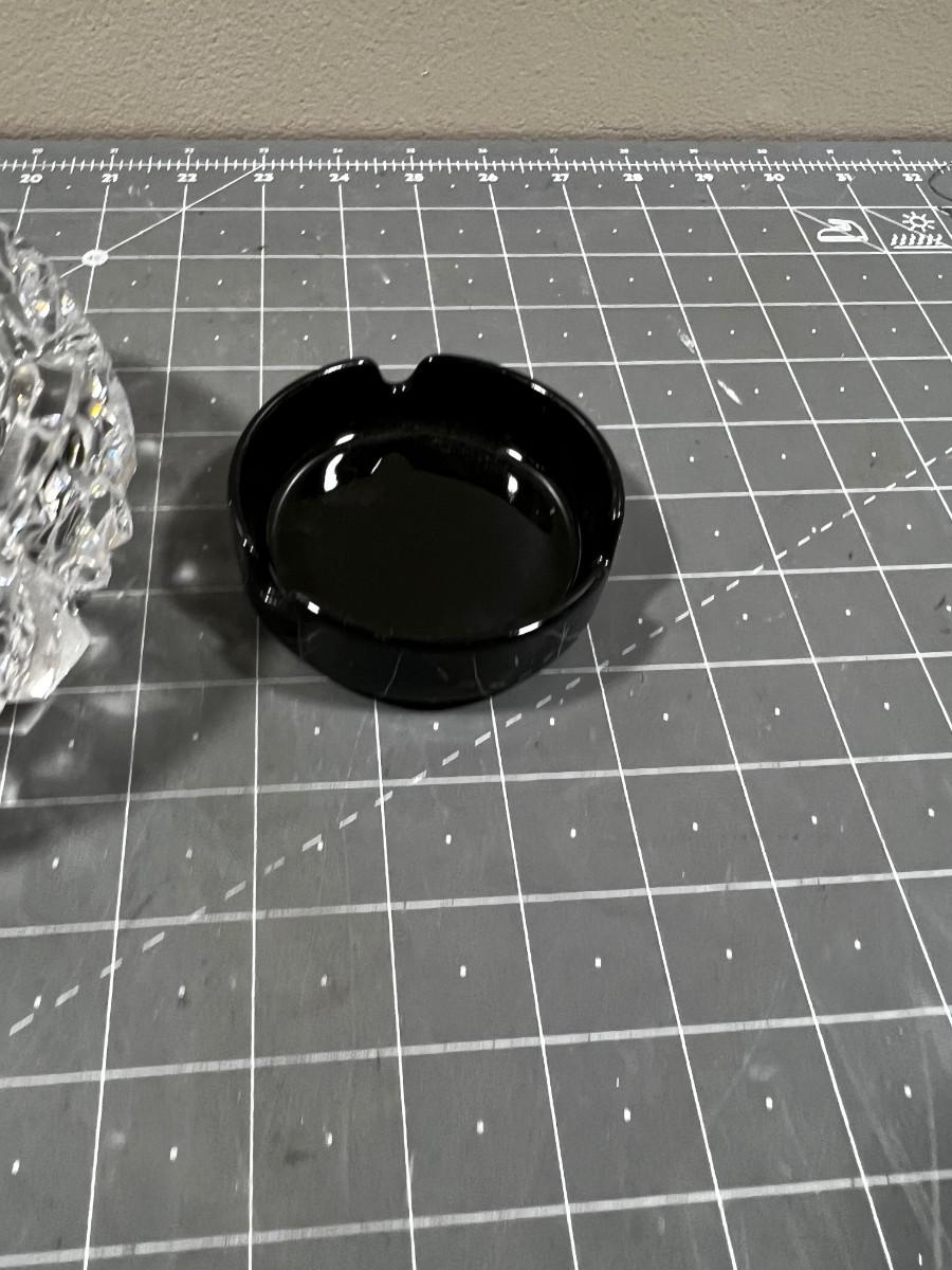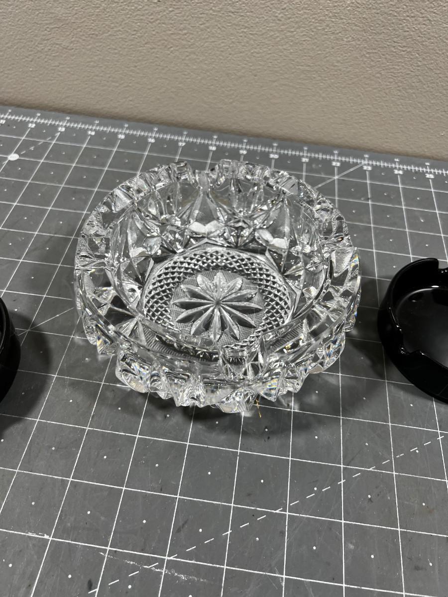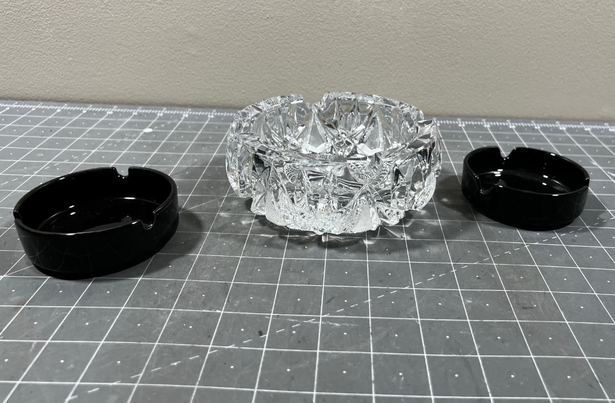 Crystal and 2 Black Glass Ash Trays
