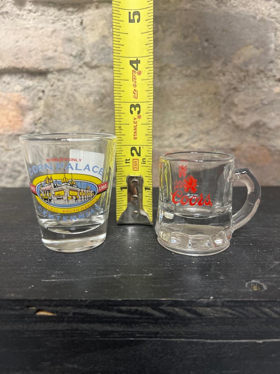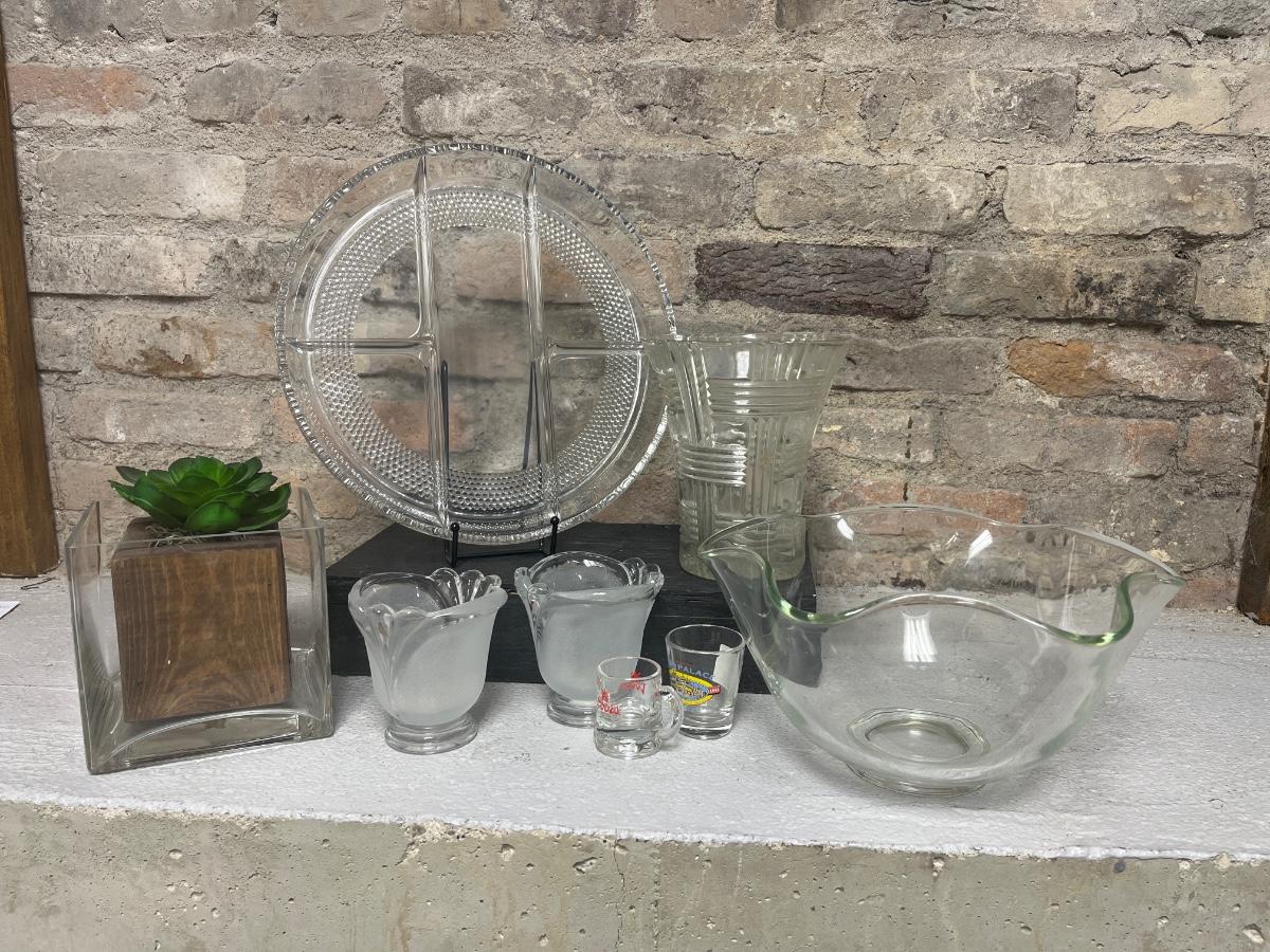 Beautiful, heavy 5 part relish dish, fluted serving bowl, pressed glass vase, cube planter, set of crystal votive holders, and Coors & Mitchell Corn Palace shot glasses