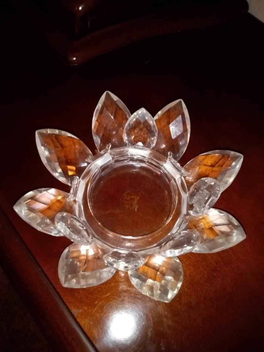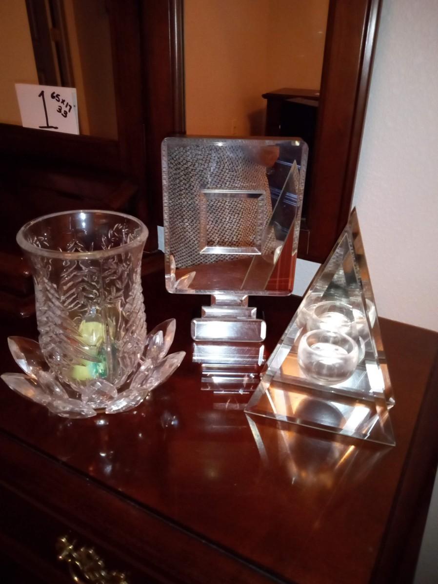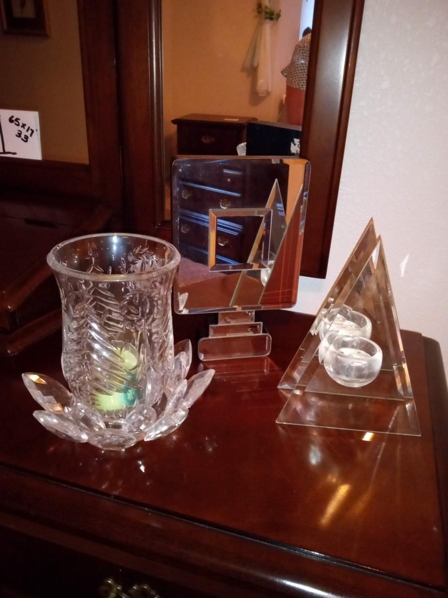 TRIANGLE MIRRORED REFLECTING CANDLE HOLDER, FREE STANDING ABSTRACT MIRRORED PIECE 9.5" TALL AND A CRYSTAL PETAL DISH (MISSING A FEW PETALS) WITH A CRYSTAL CANDLE HOLDER