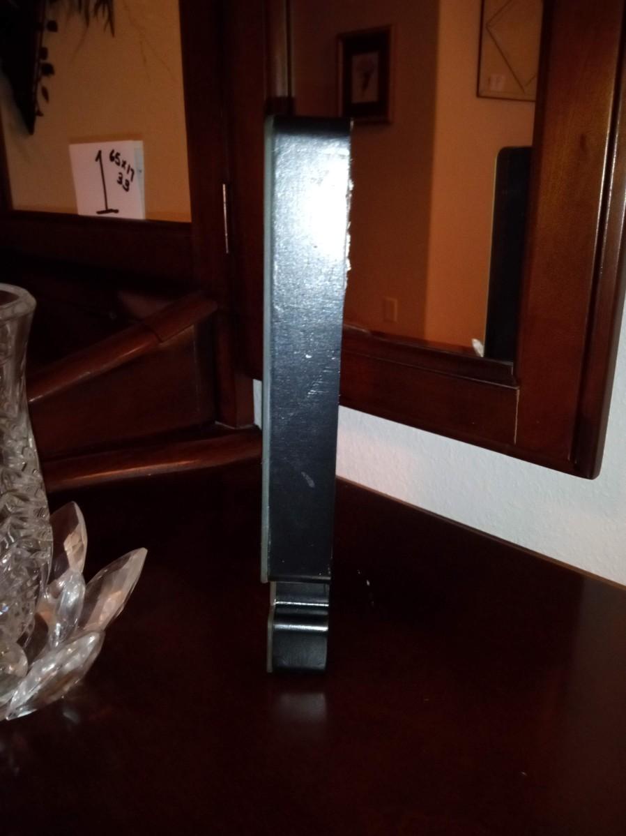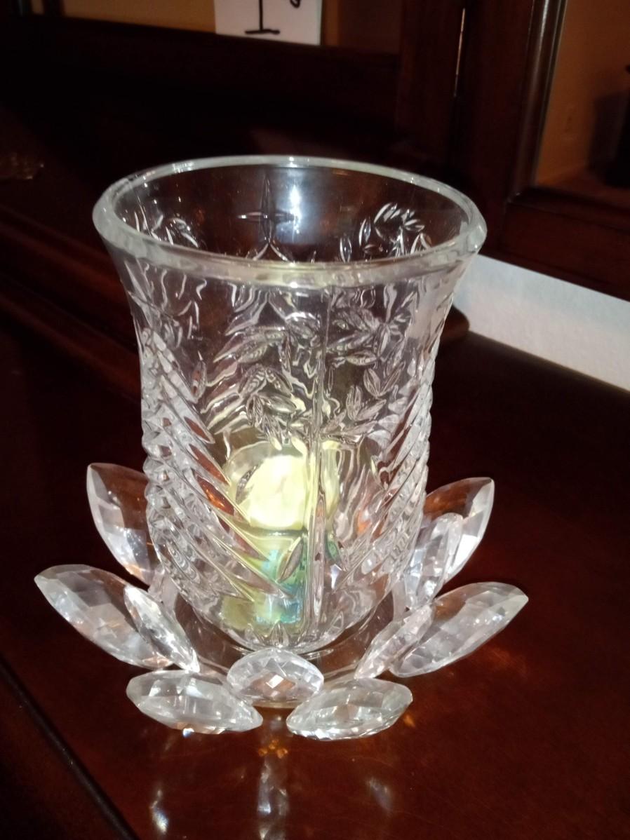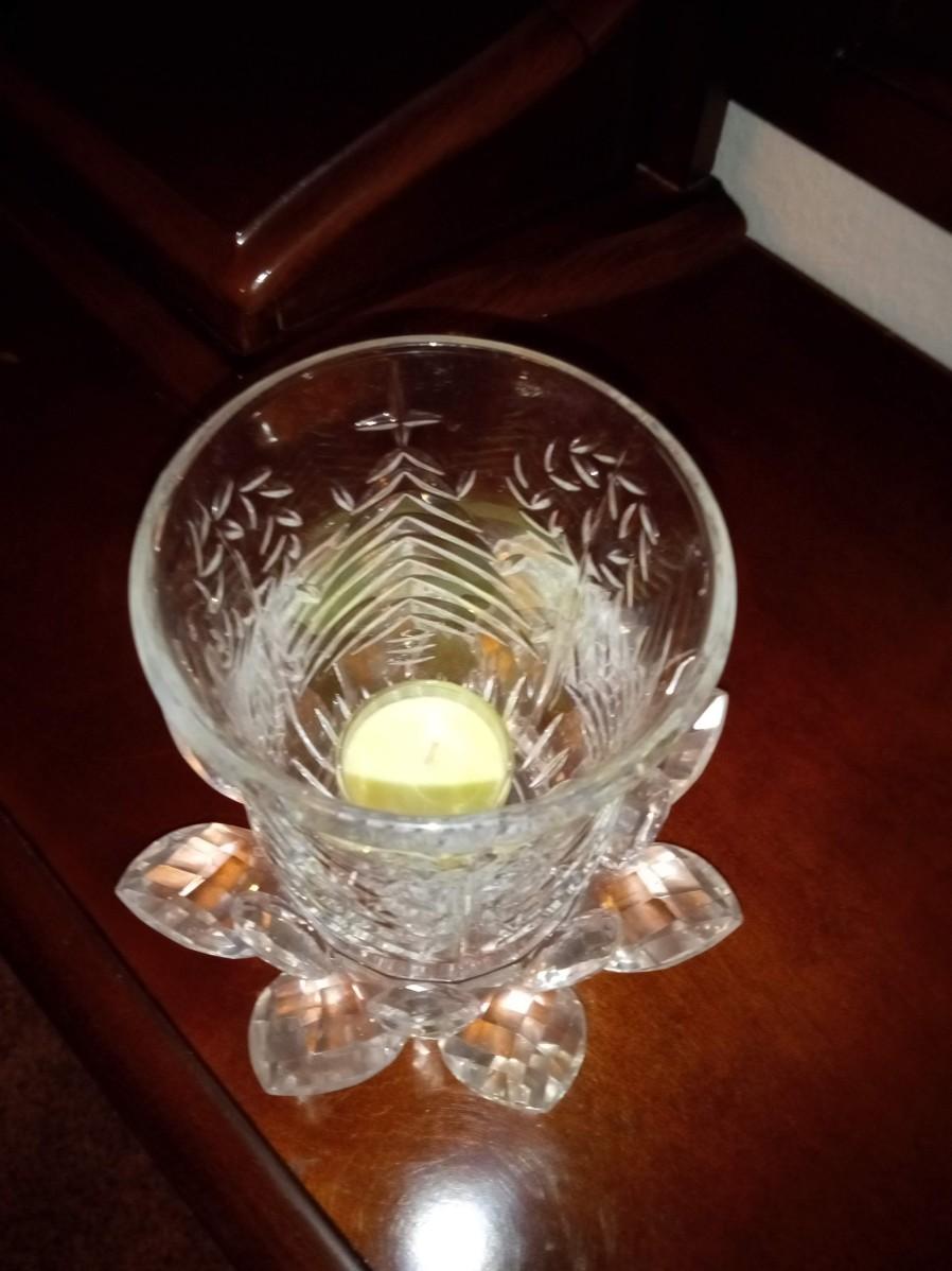 TRIANGLE MIRRORED REFLECTING CANDLE HOLDER, FREE STANDING ABSTRACT MIRRORED PIECE 9.5" TALL AND A CRYSTAL PETAL DISH (MISSING A FEW PETALS) WITH A CRYSTAL CANDLE HOLDER