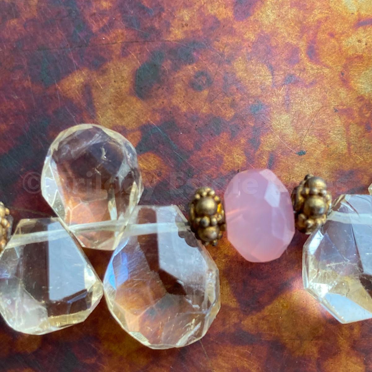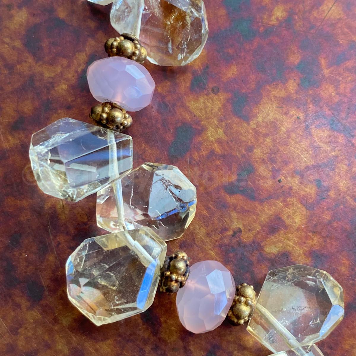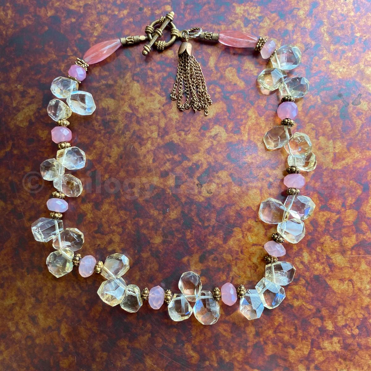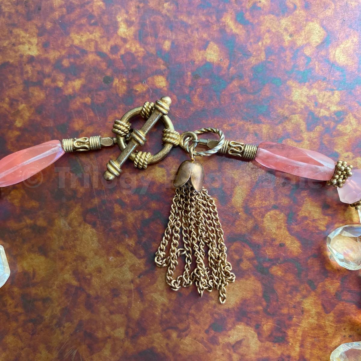 Crystal and pink beaded necklace with toggle closure. Some of the clear crystal beads are chipped or scratched.