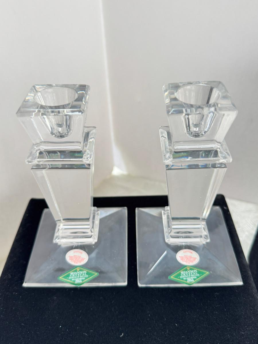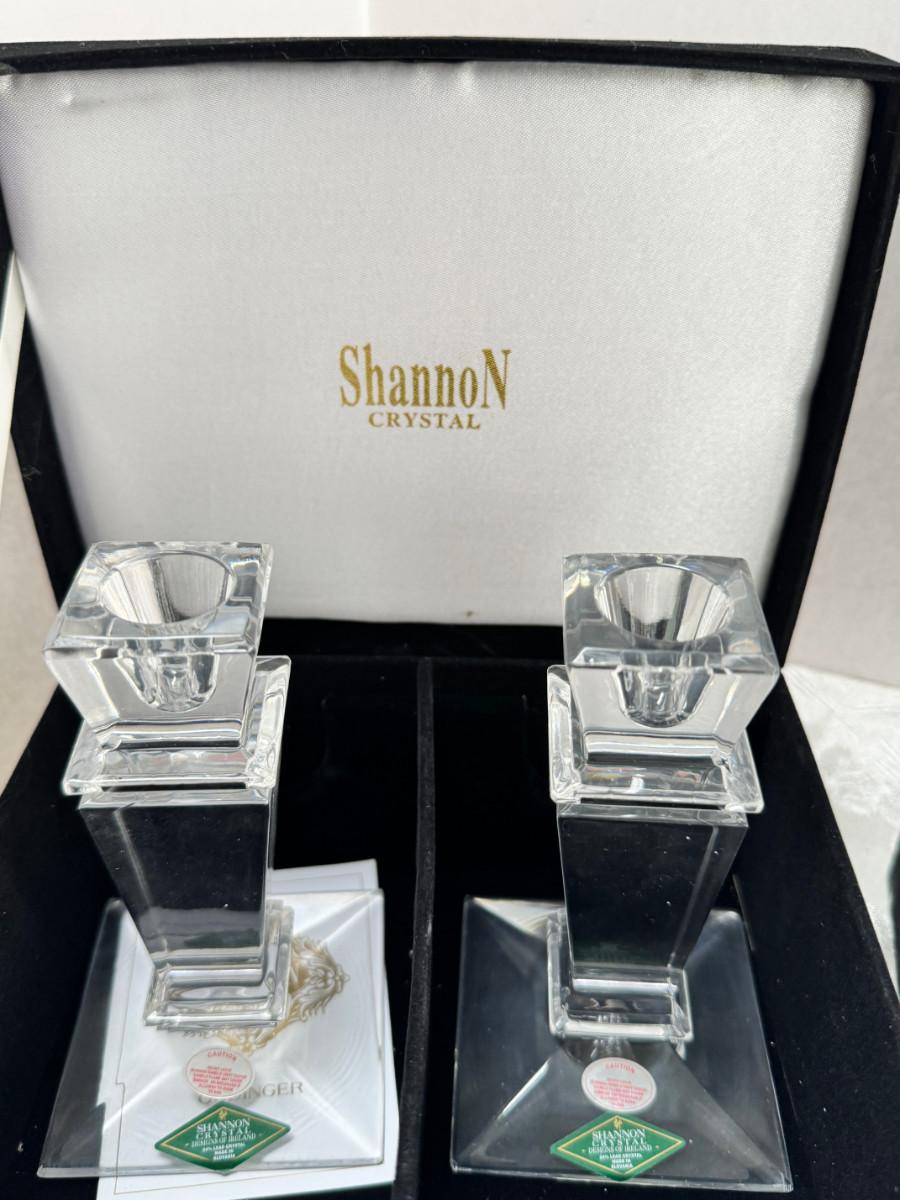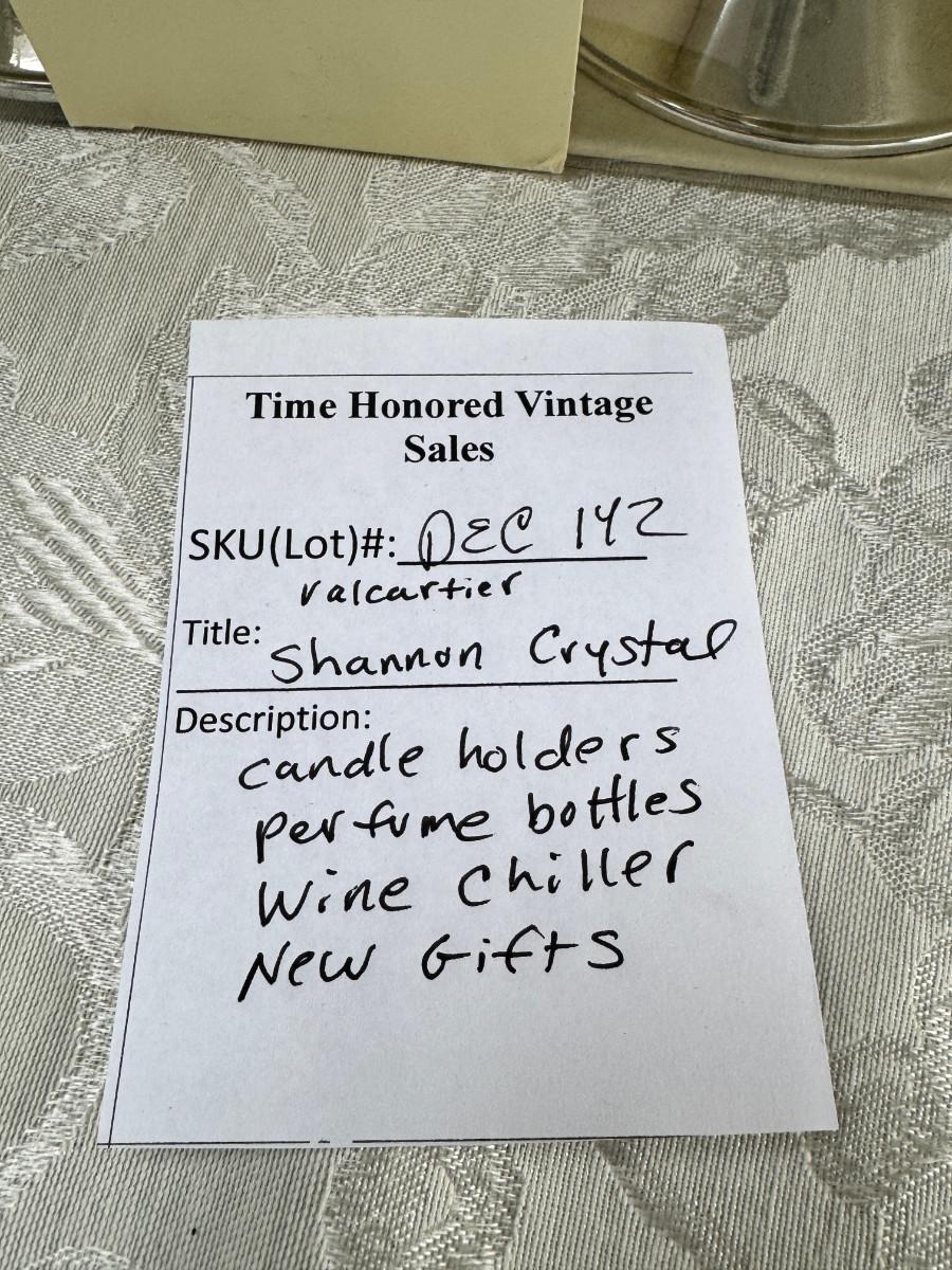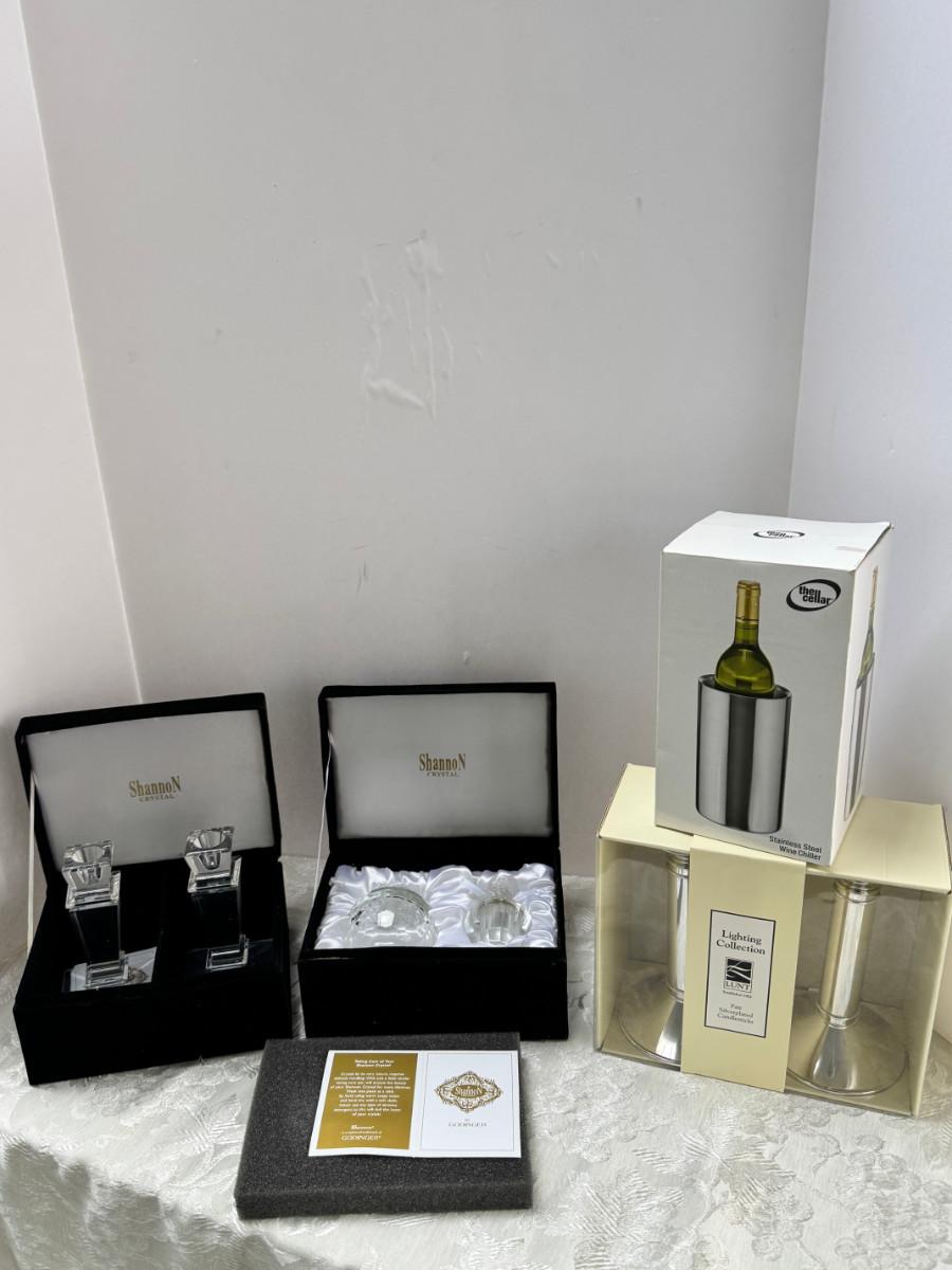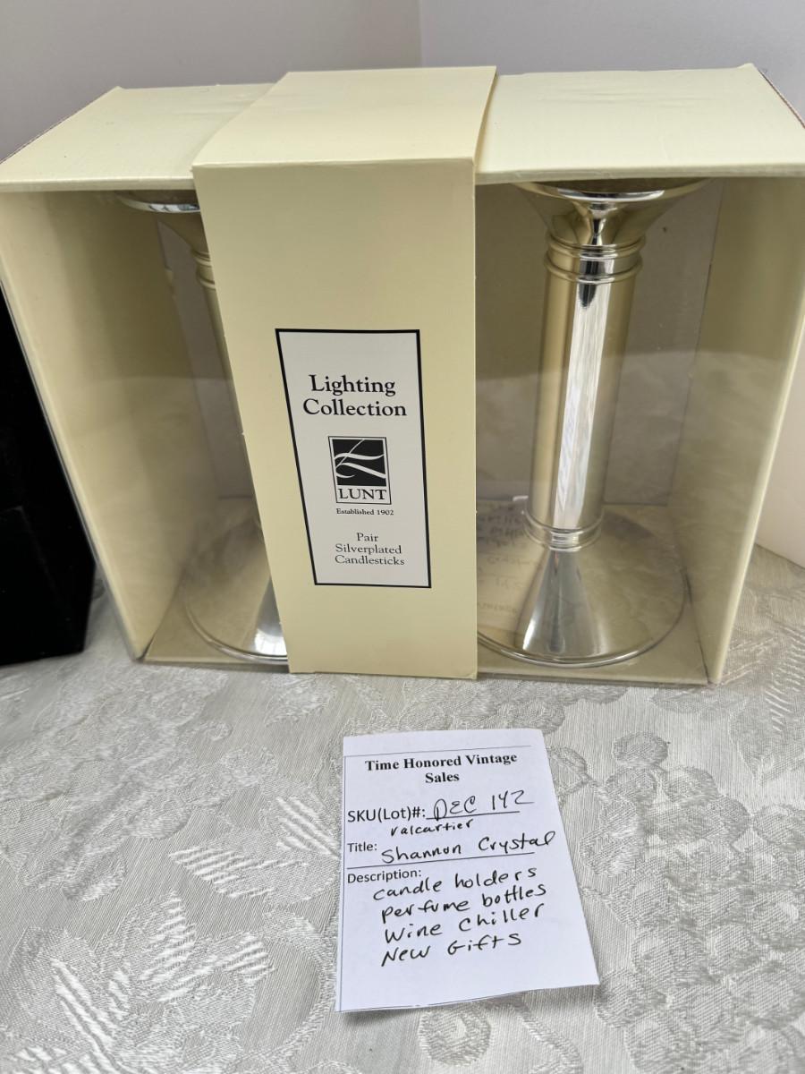 Gift lot with new Shannon crystal in gift boxes, Wine Cellar wine cooler , New Lunt Silver color candlesticks. 2 Crystal perfume bottles Shannon brand from Macy's.