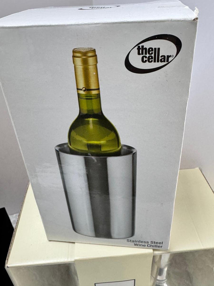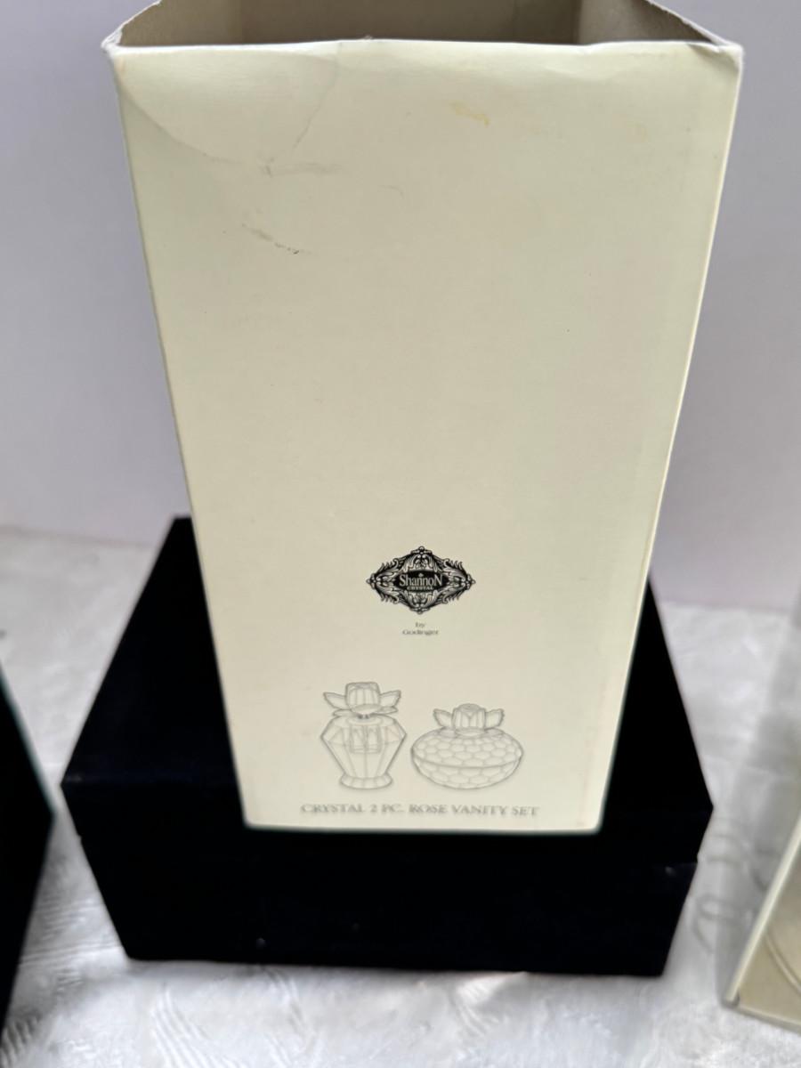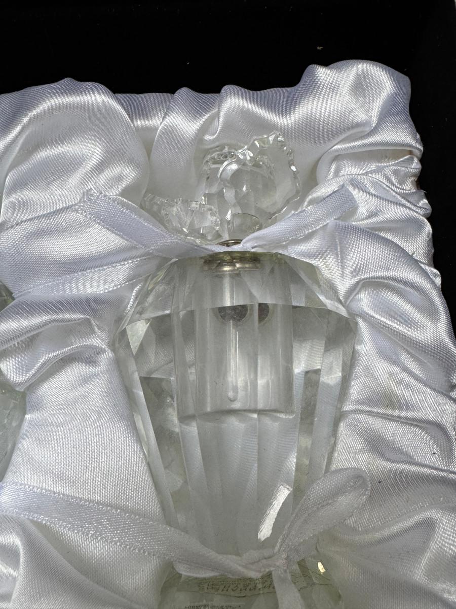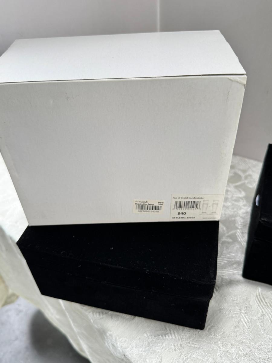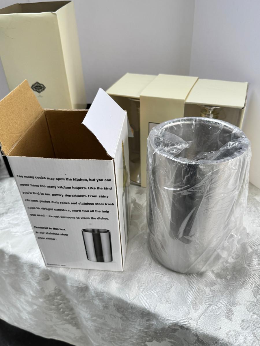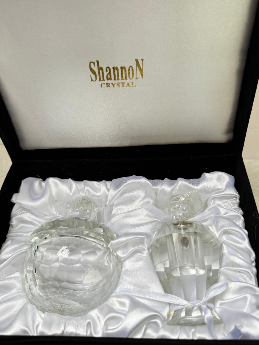 Gift lot with new Shannon crystal in gift boxes, Wine Cellar wine cooler , New Lunt Silver color candlesticks. 2 Crystal perfume bottles Shannon brand from Macy's.