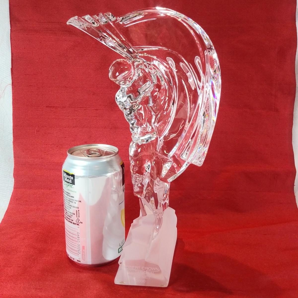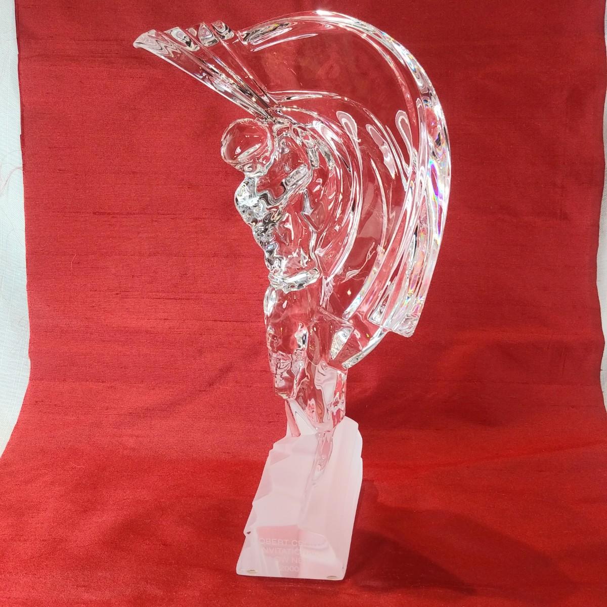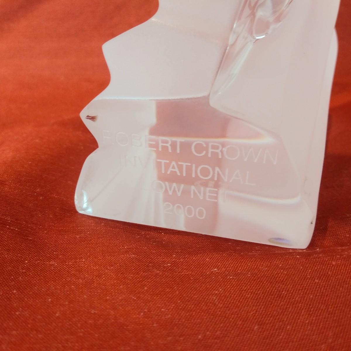 This auction lot is for a Crystal Art Glass Golfer. This offering is a wonderful contemporary crystal art glass golfer trophy. Made by Sevres France. It states Robert Crown Invitational 2000 Low Net. It doesn't look like a trophy and lettering is light , so still very useful for genera; display.