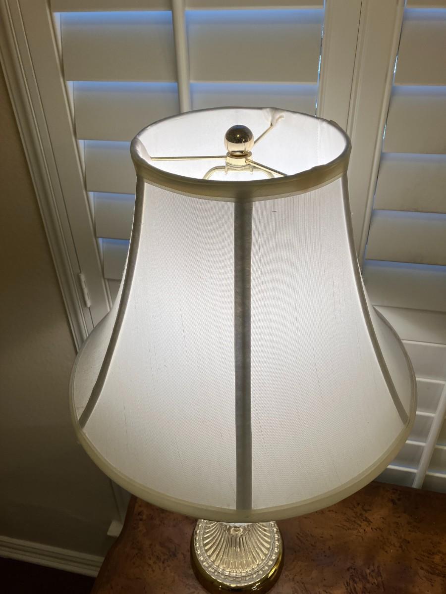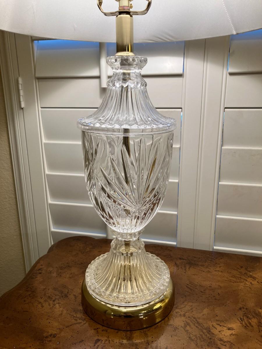 Beautiful Crystal base and brass lamp with white shade. 26" H