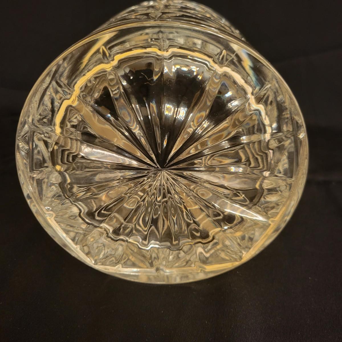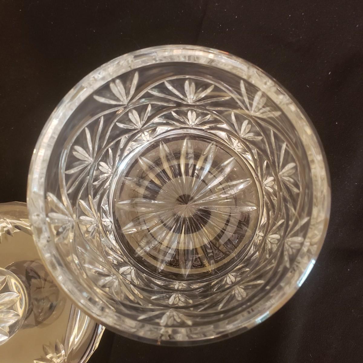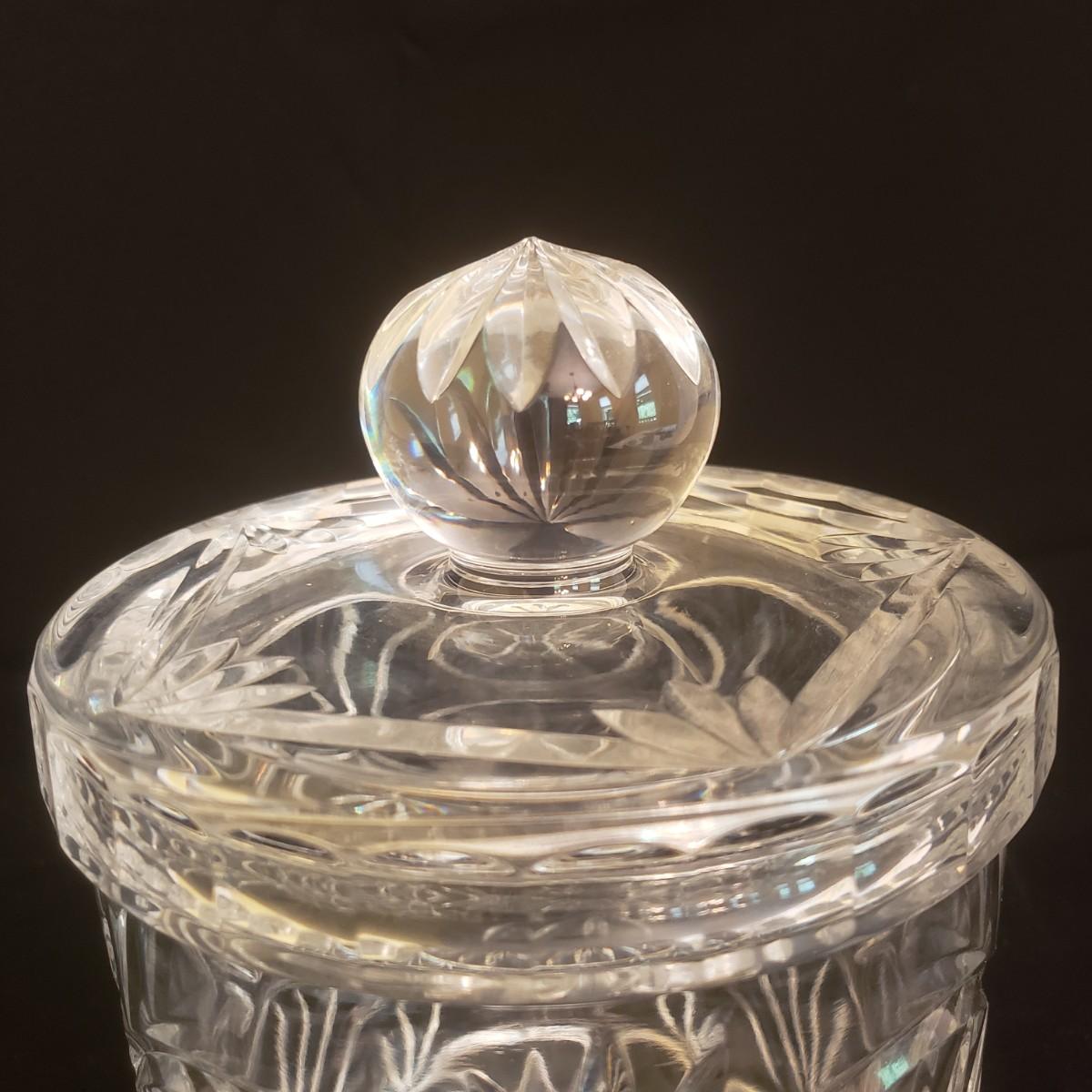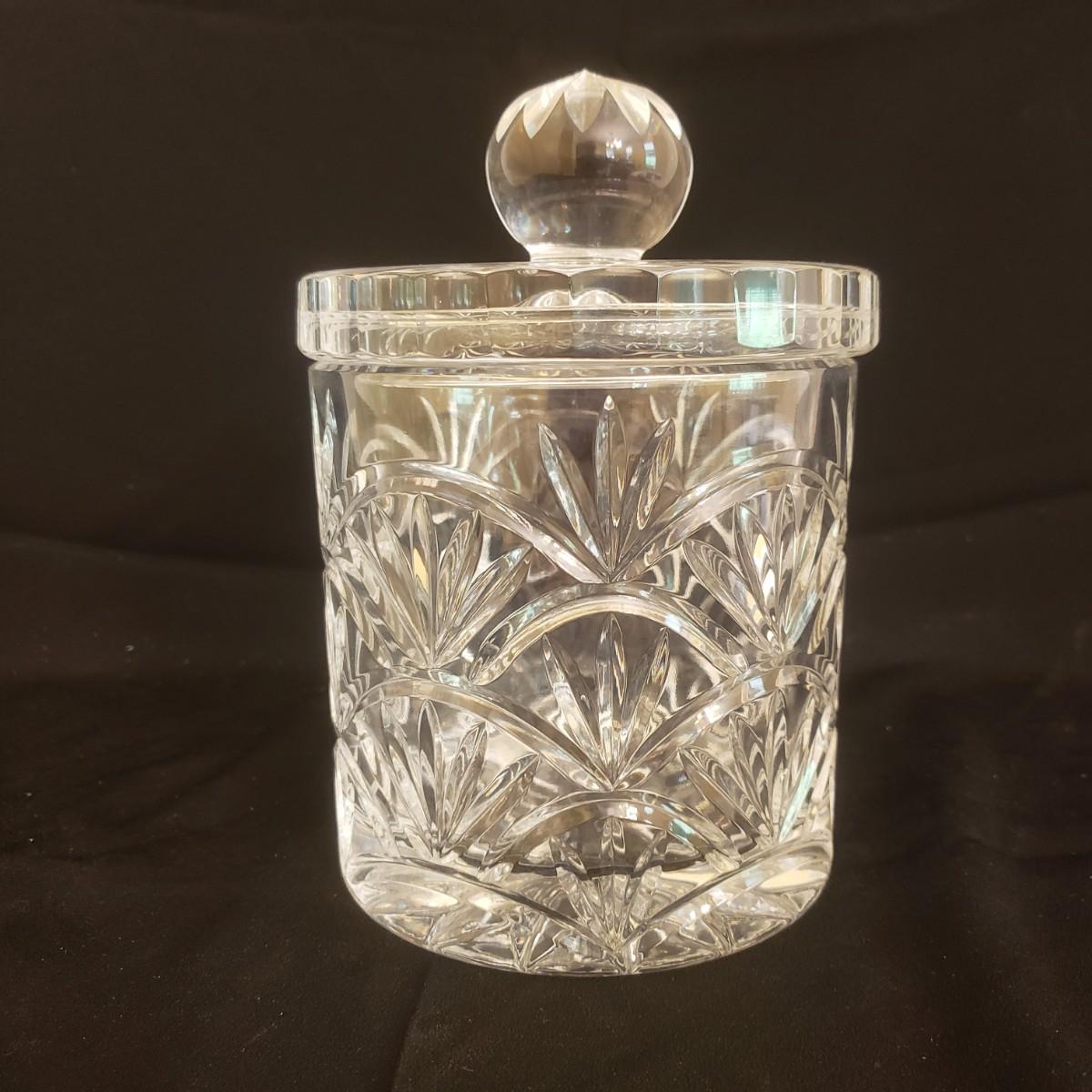 This is a crystal biscuit jar that measures 6" x 6" H. This jar is heavy to the touch.