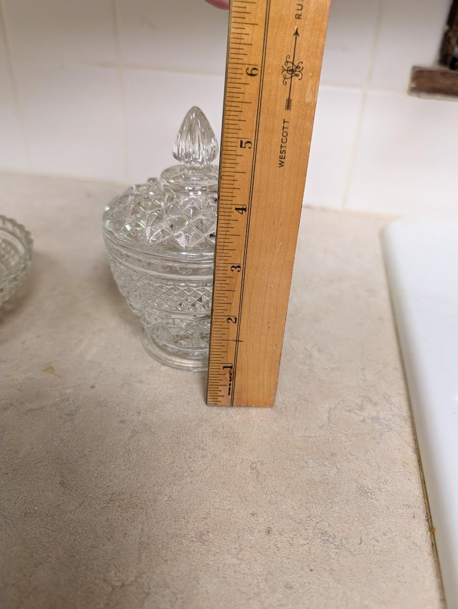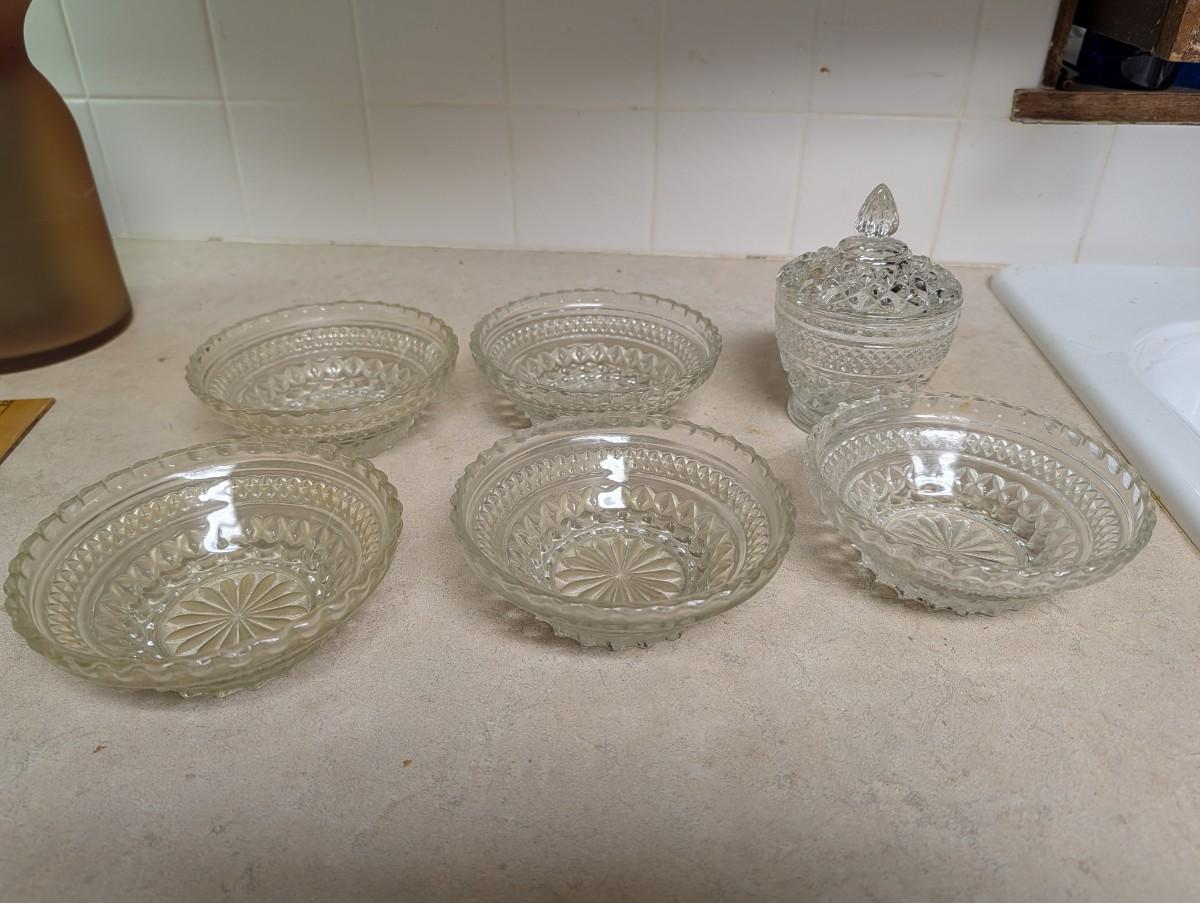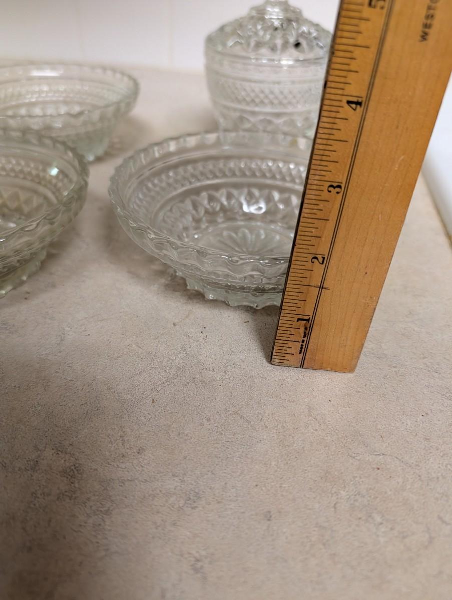 Anchor Hocking small bowls and a Anchor Hocking sugar bowl with lid.
