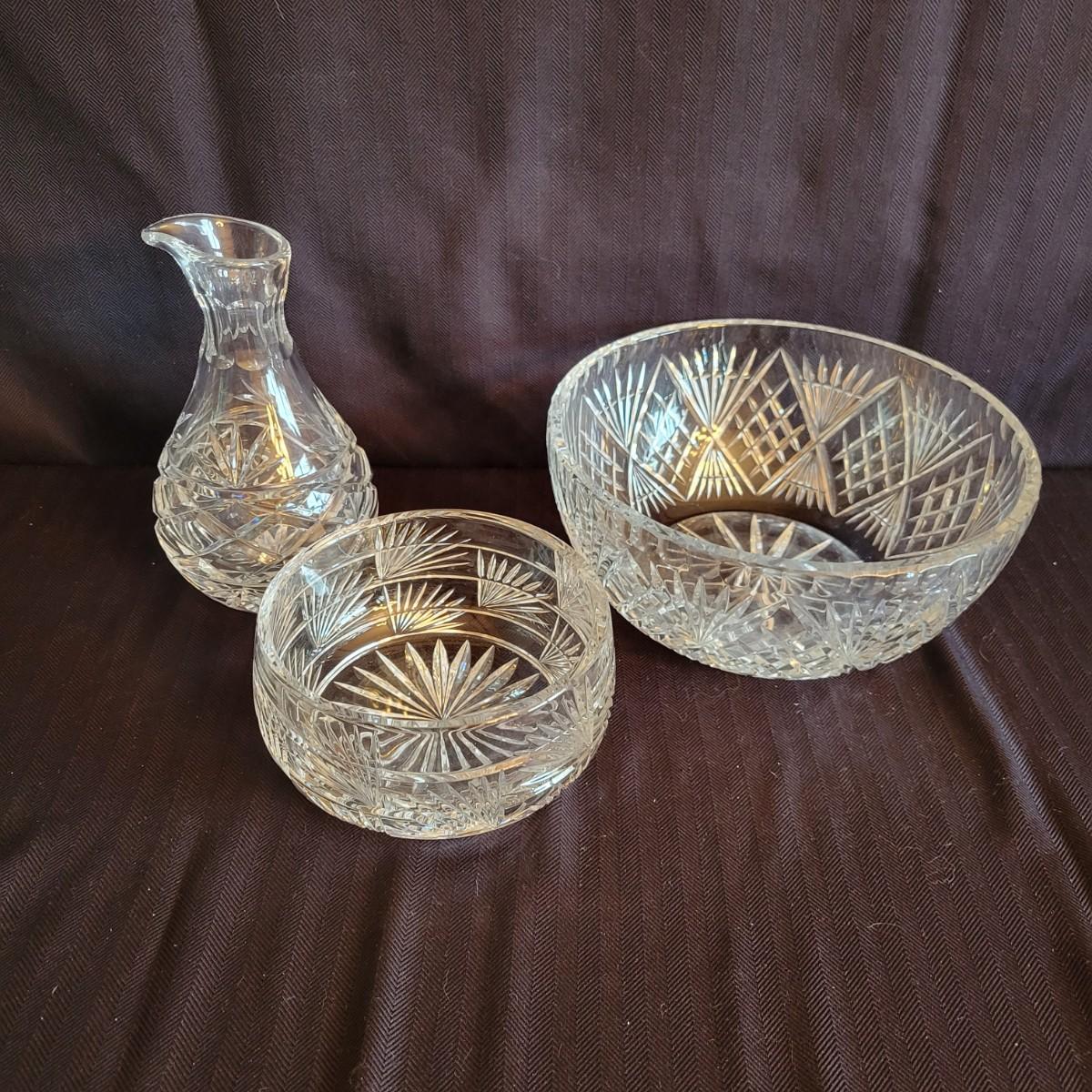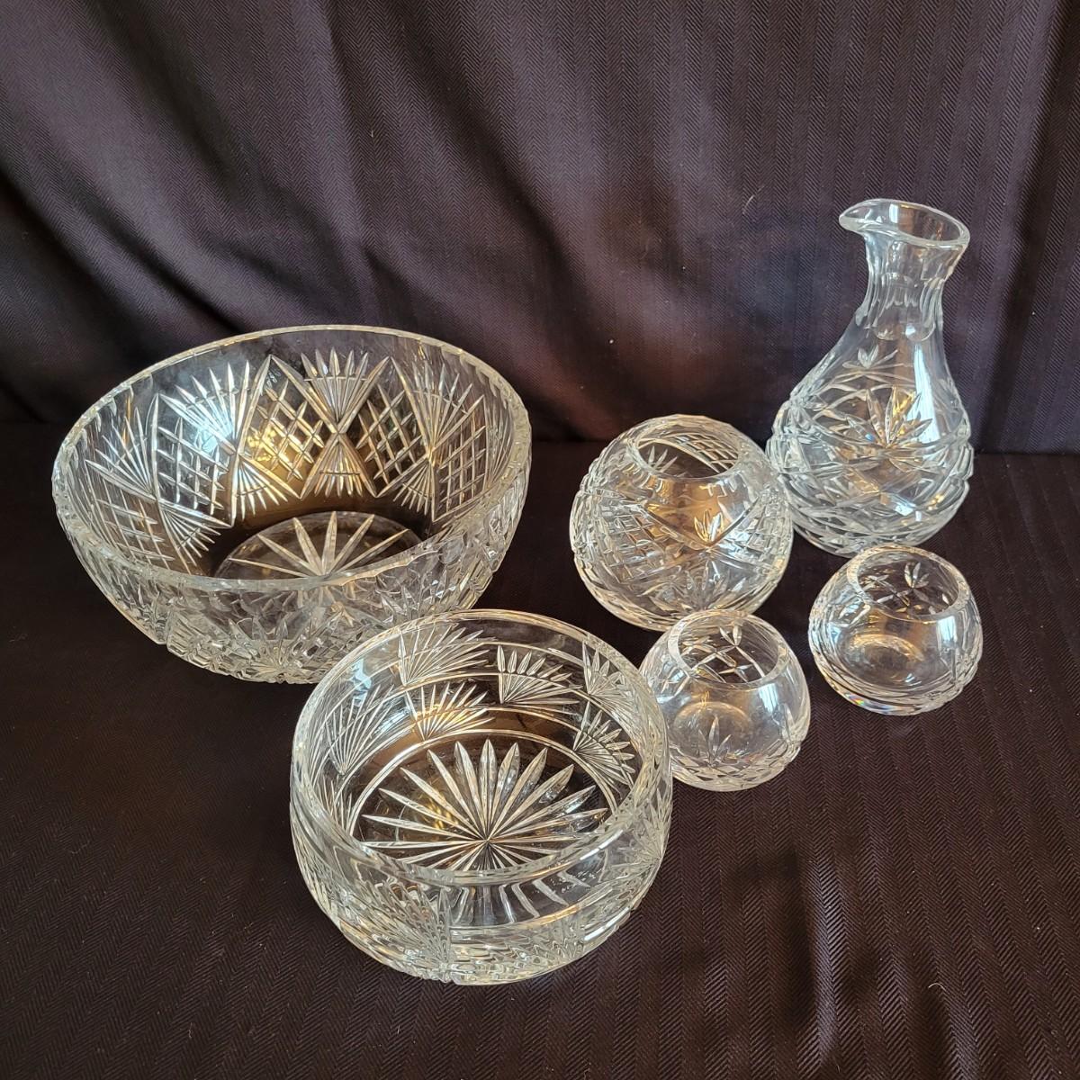 Six pieces of crystals that includes five bowls and a small pitcher The largest bowl measures approximately 9.5"D x 4"H. Shipping available