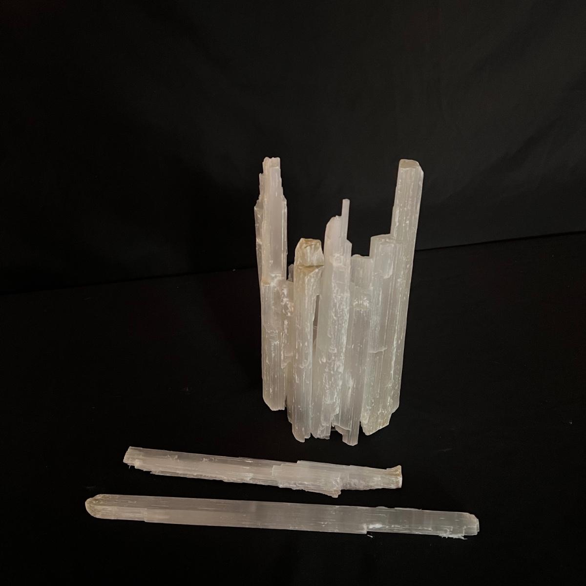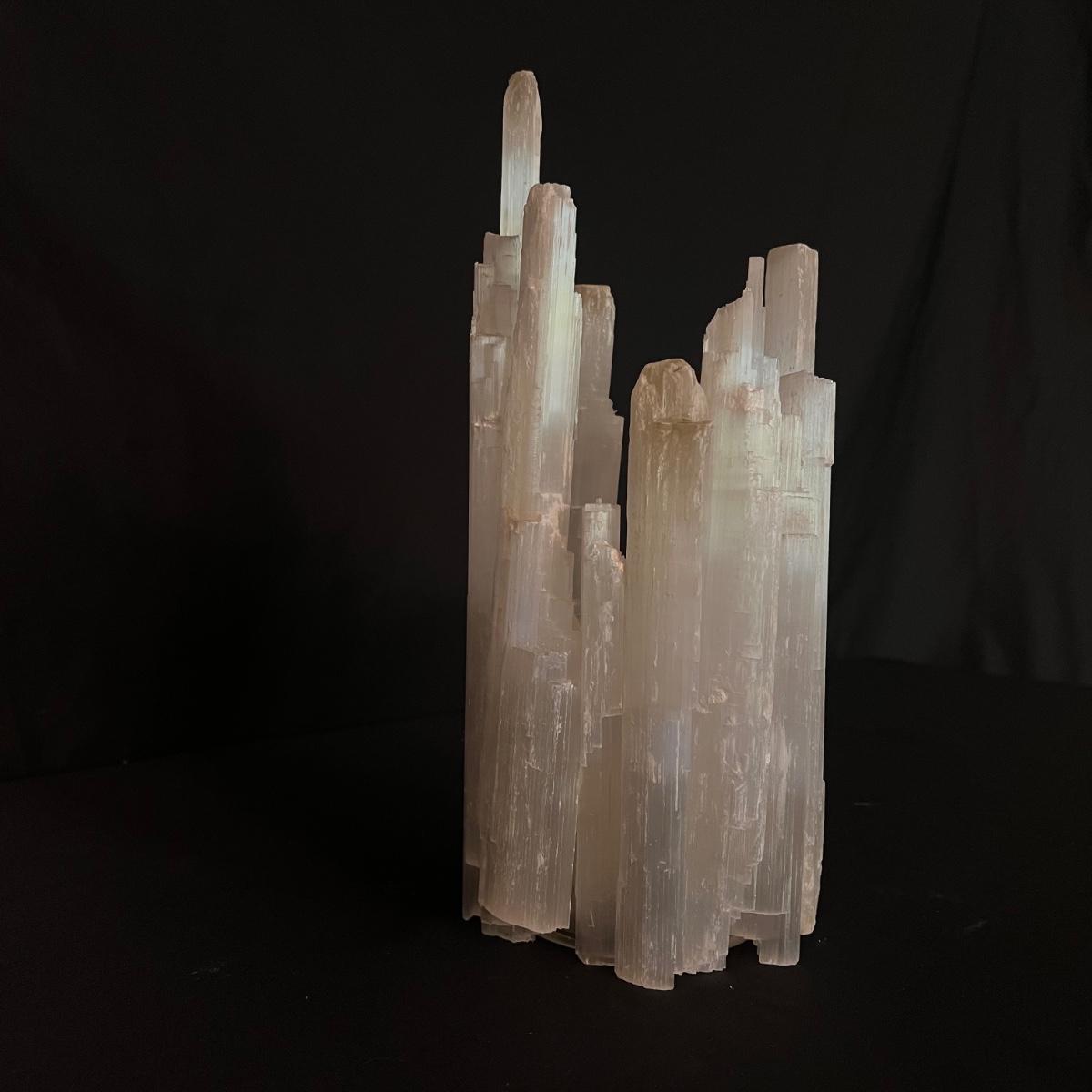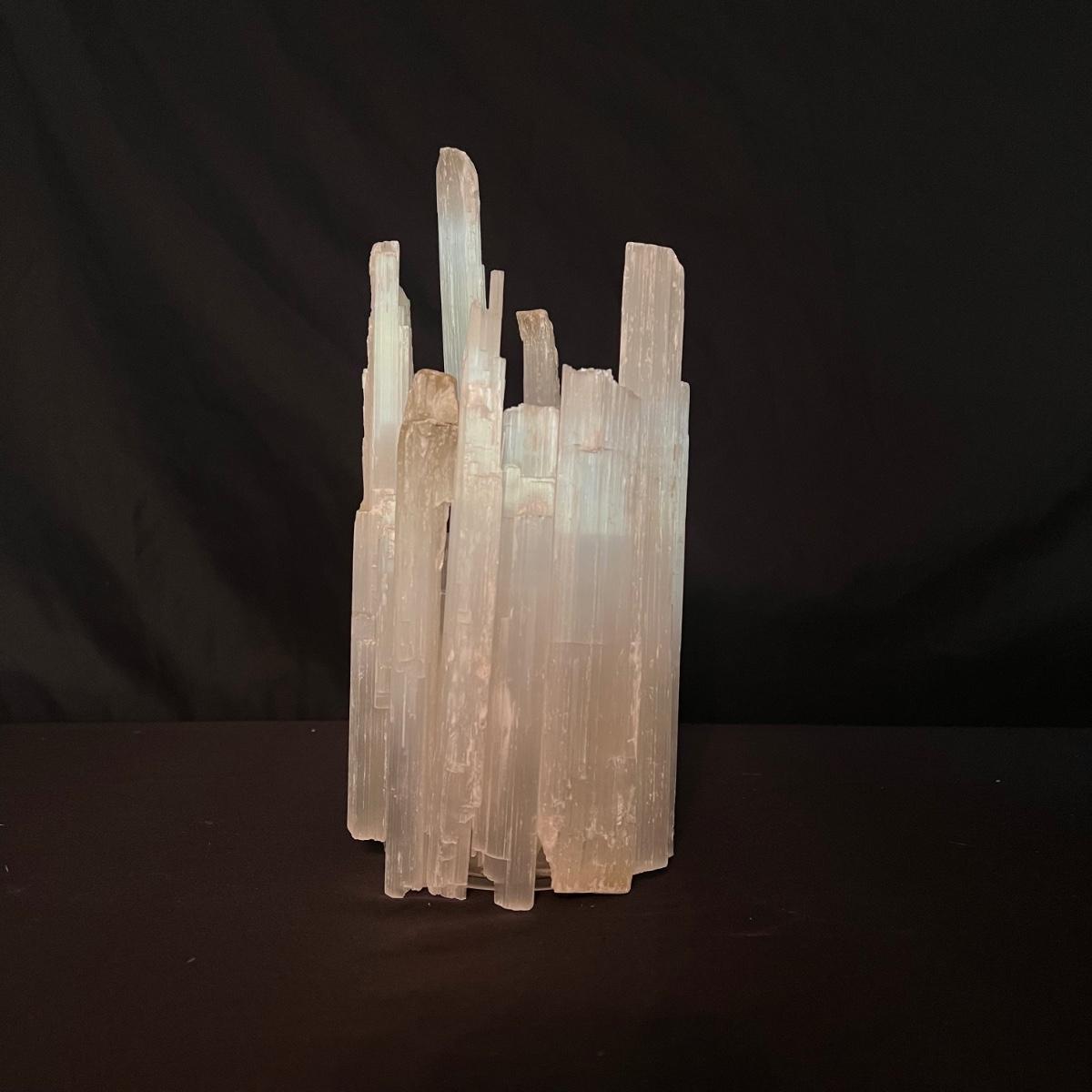 This selenite crystal candle holder is staggered with various sized crystals surrounding the candle. Two pieces have detached but can easily be glued back - see picture included. The candle holder measures 5" x 9"H. Shipping available.