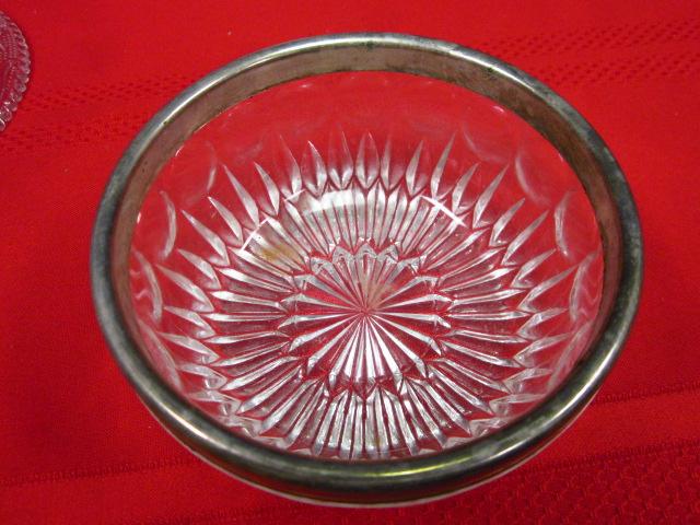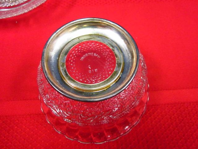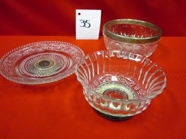 Crystal Candle holder plate with the base trimmed with silver plated metal Crystal Dish with silver trim, Crystal bowl with silver plate trim , 3 pcs