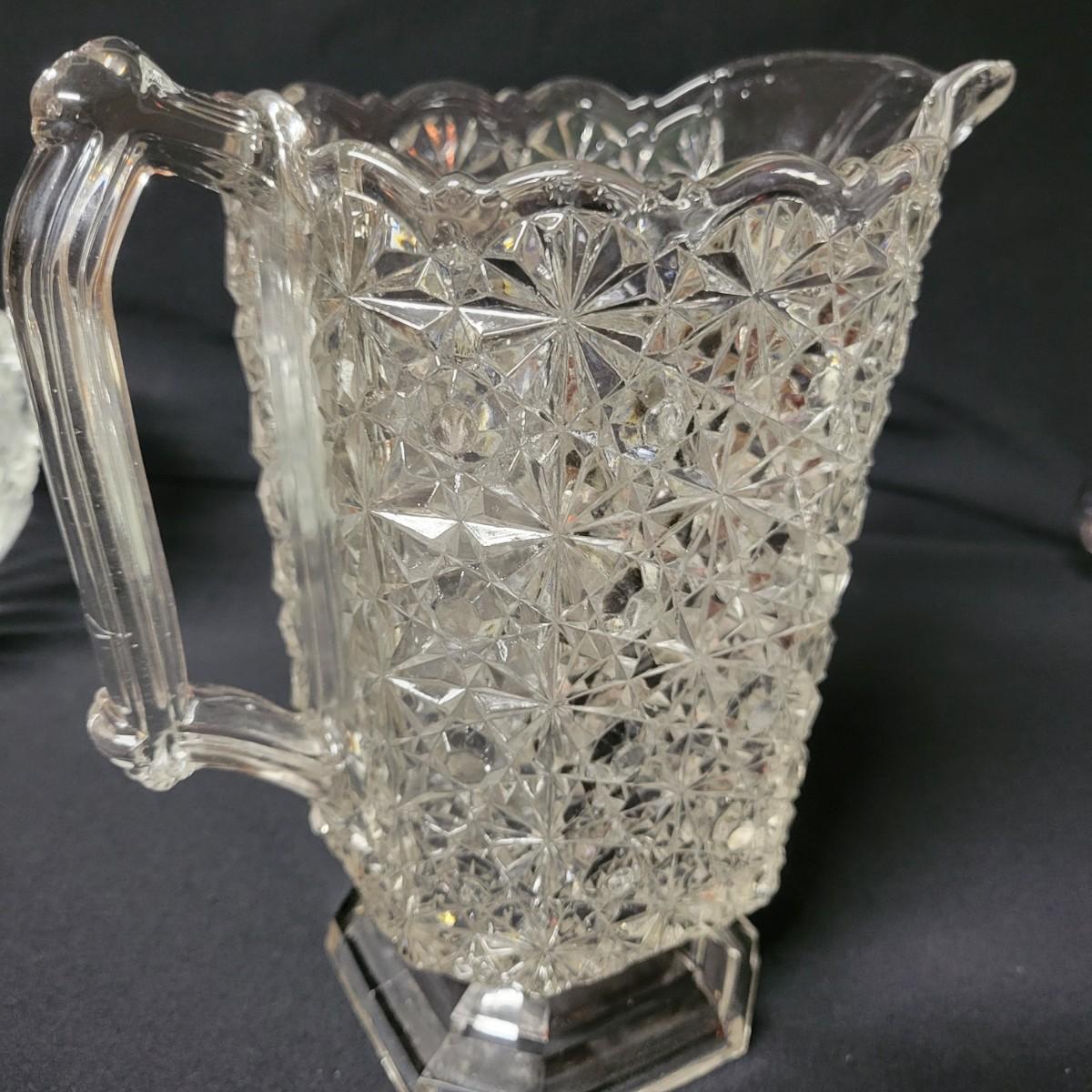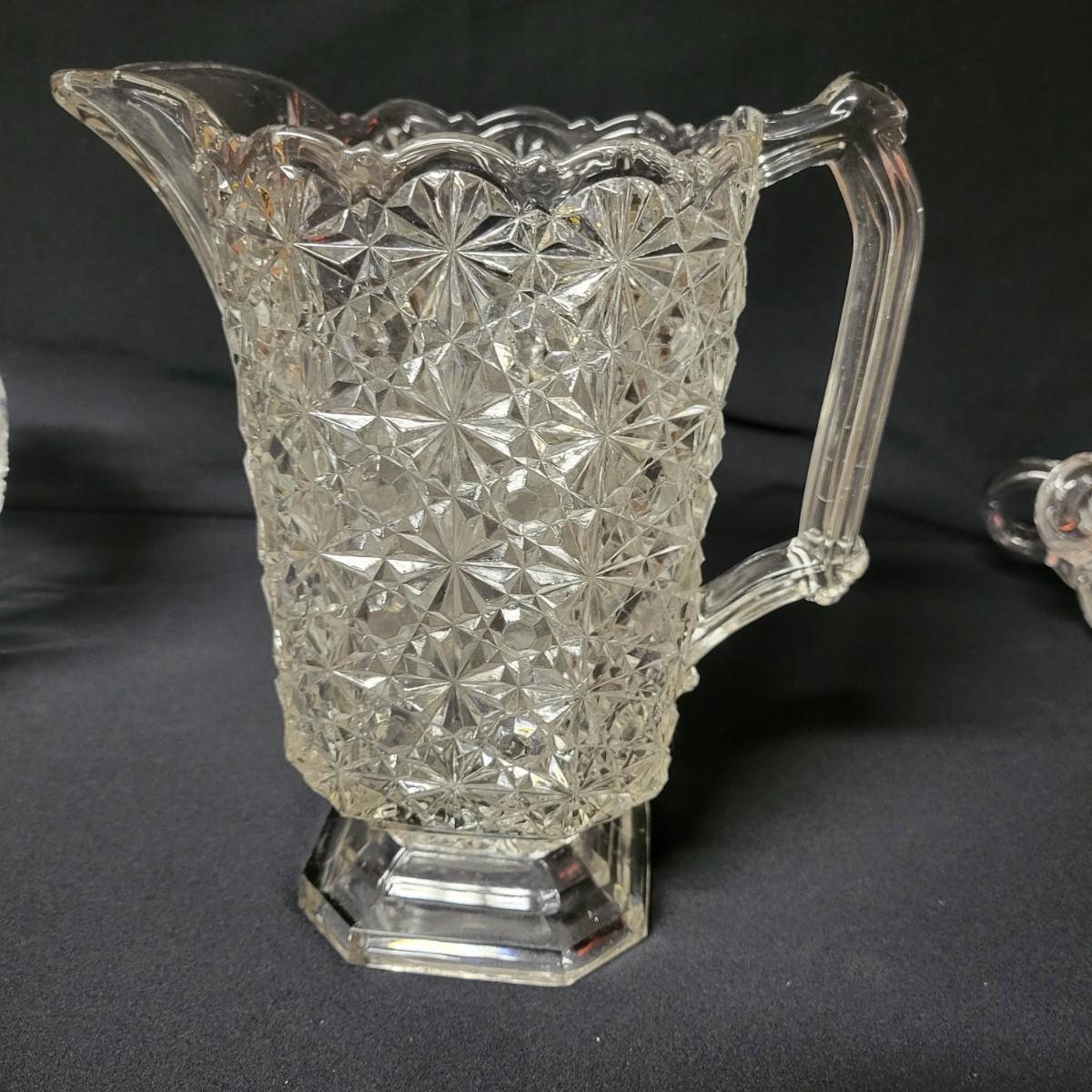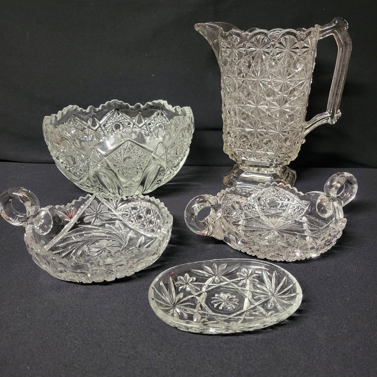 This lot consists of two crystal candy dishes in excellent condition and a pitcher, large bowl, and candy dish of molded glass with complimentary patterns. The large bowl measures approximately 8.5" x 5" Shipping available