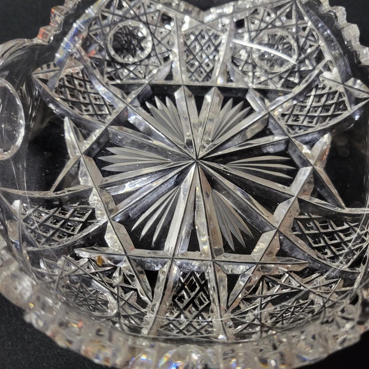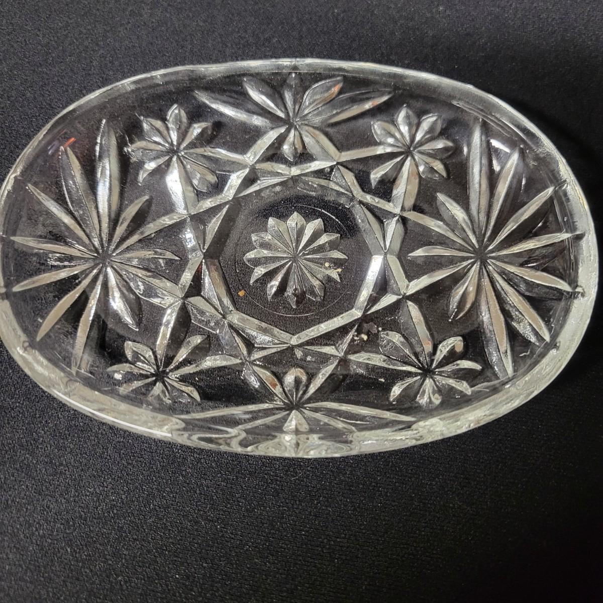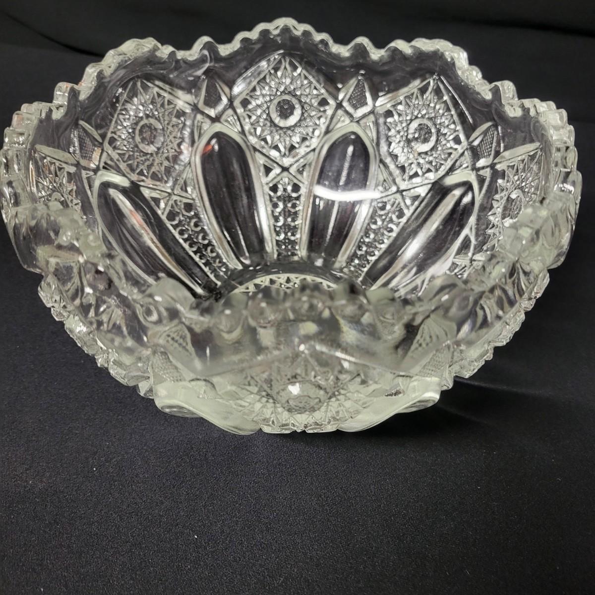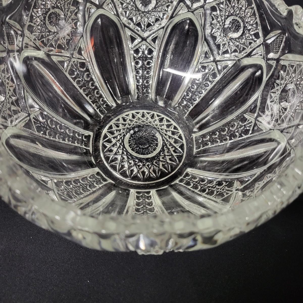 This lot consists of two crystal candy dishes in excellent condition and a pitcher, large bowl, and candy dish of molded glass with complimentary patterns. The large bowl measures approximately 8.5" x 5" Shipping available