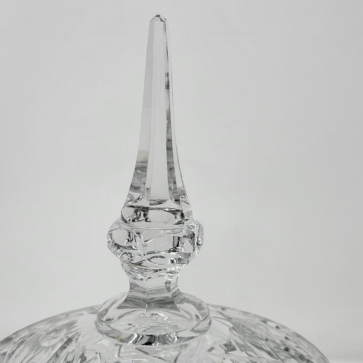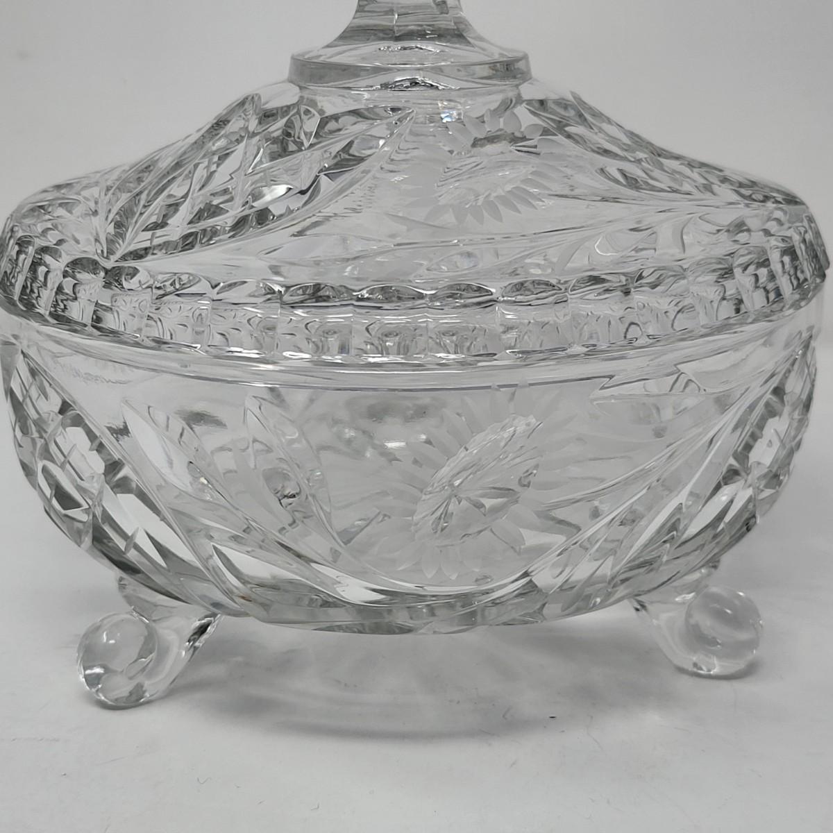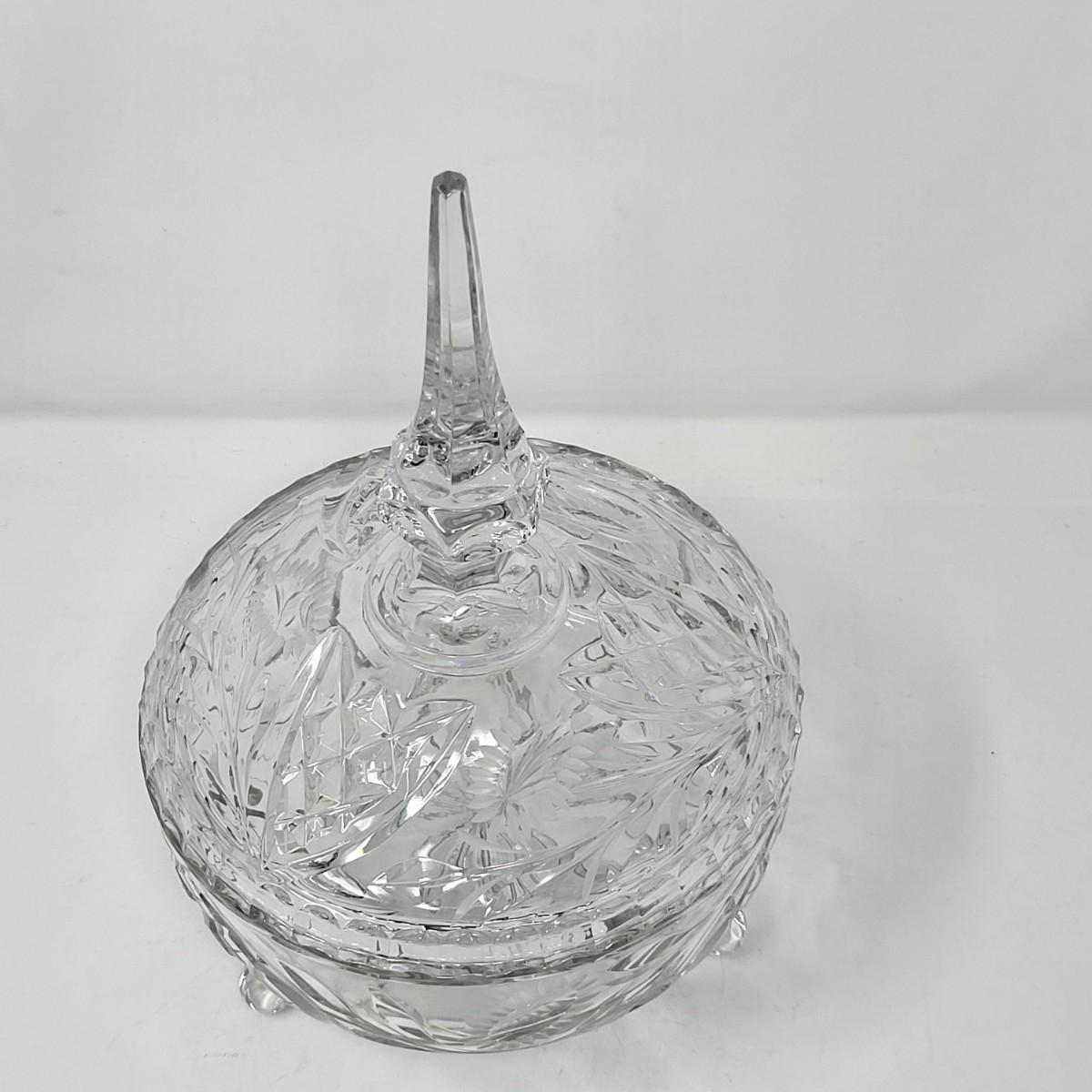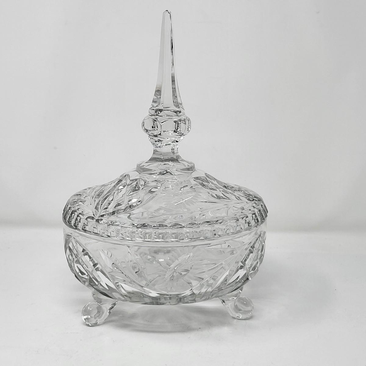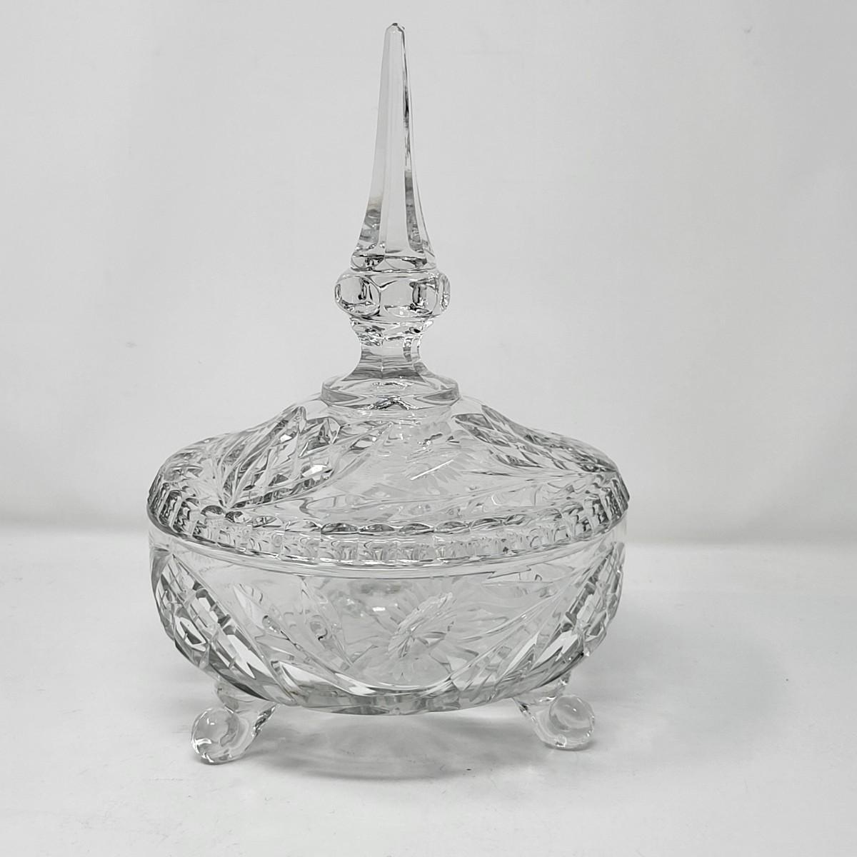 Fine crystal, three footed candy jar 10.5" tall x 7" diameter with a long pointed, handle stem lid.
