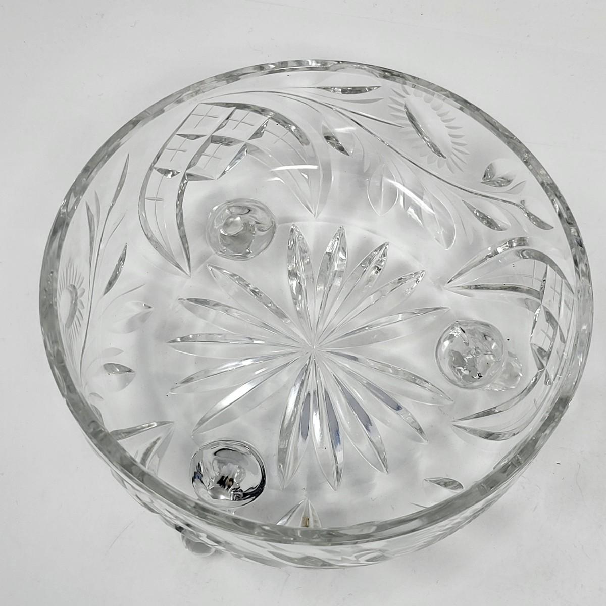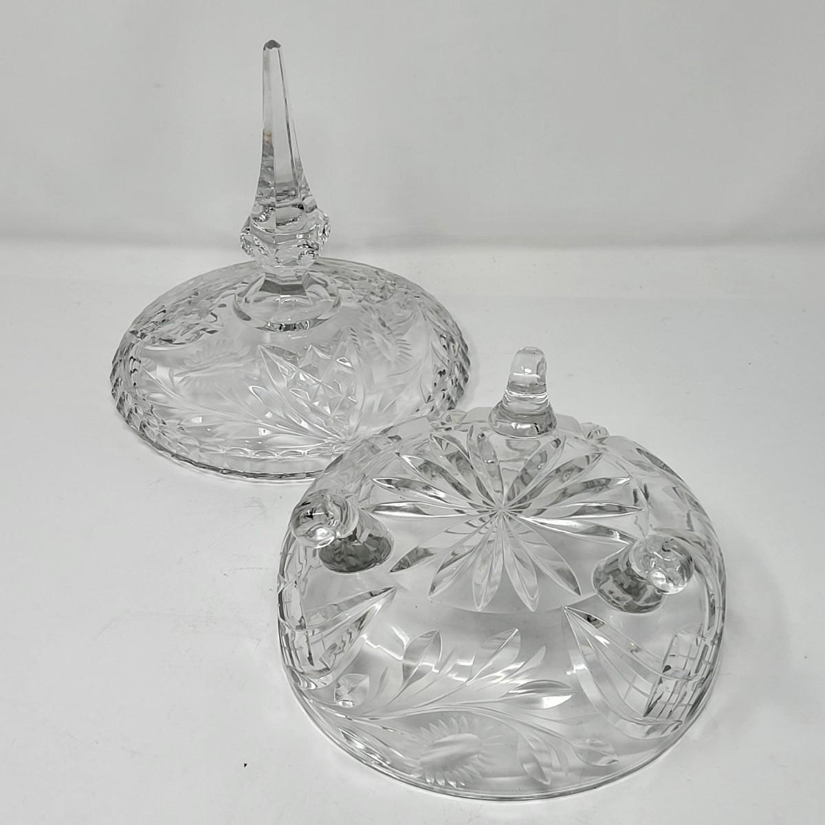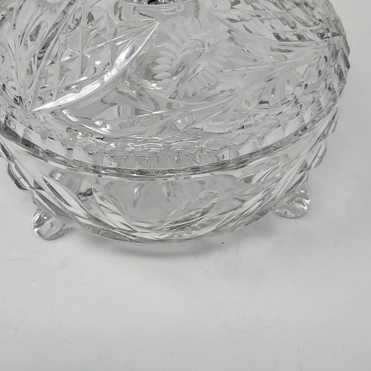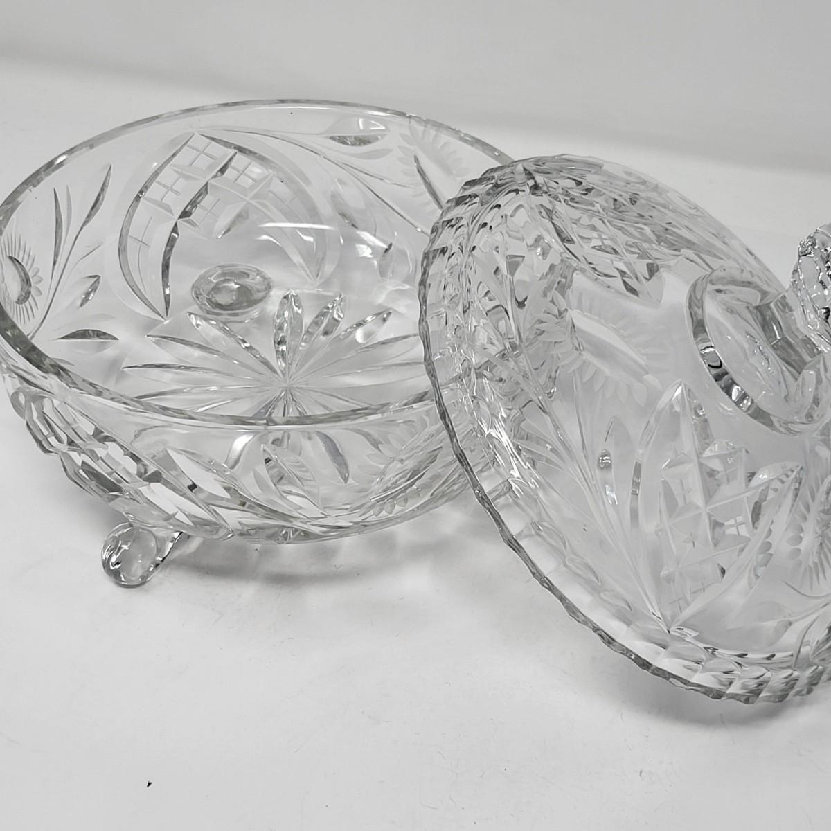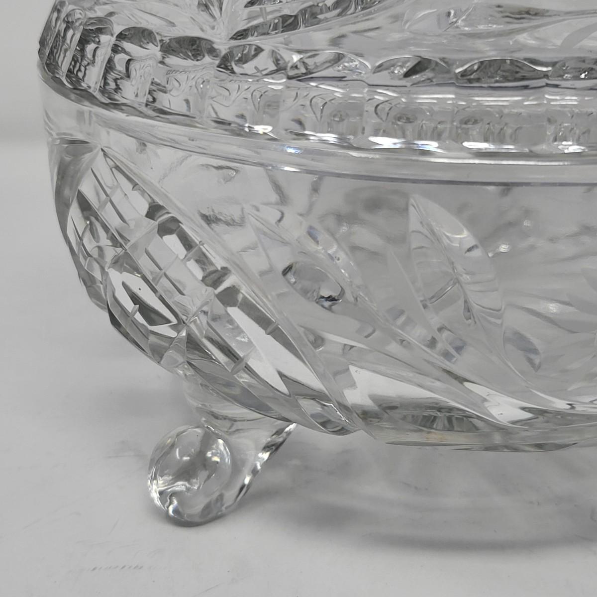 Fine crystal, three footed candy jar 10.5" tall x 7" diameter with a long pointed, handle stem lid.
