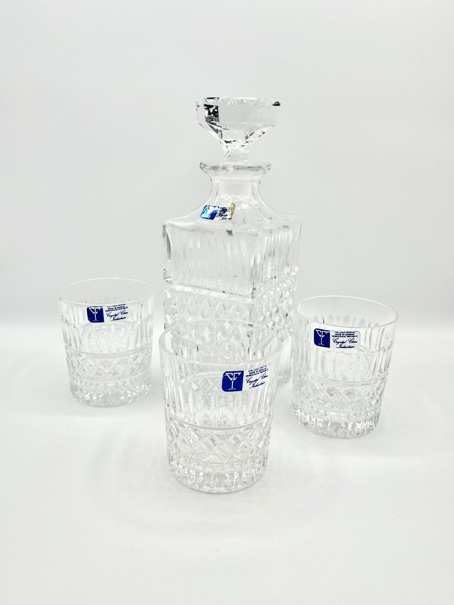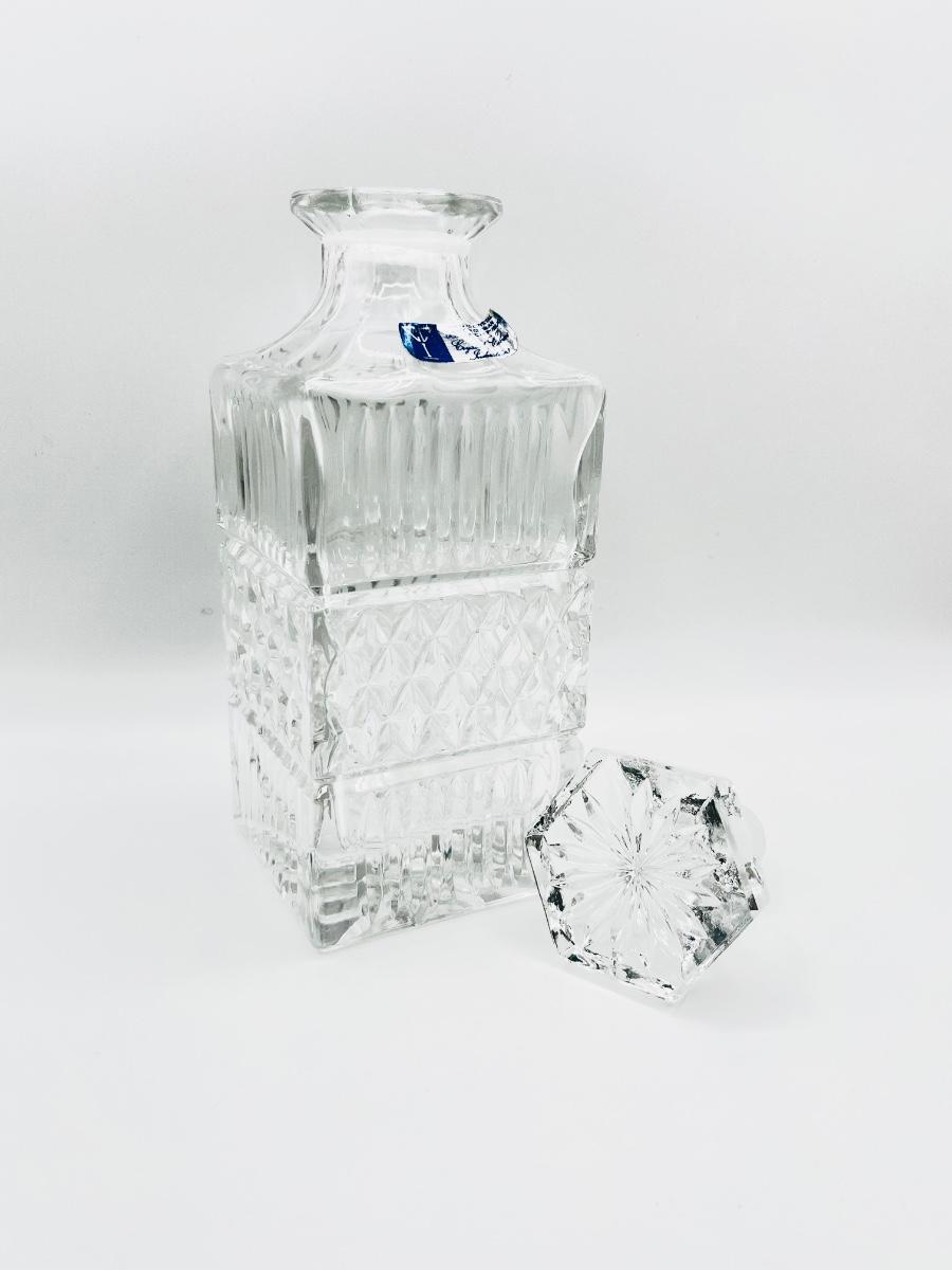 Includes = Decanter with stopper 10” H x 3.5” Square ~ (3) Old fashion glasses 3 3/4”