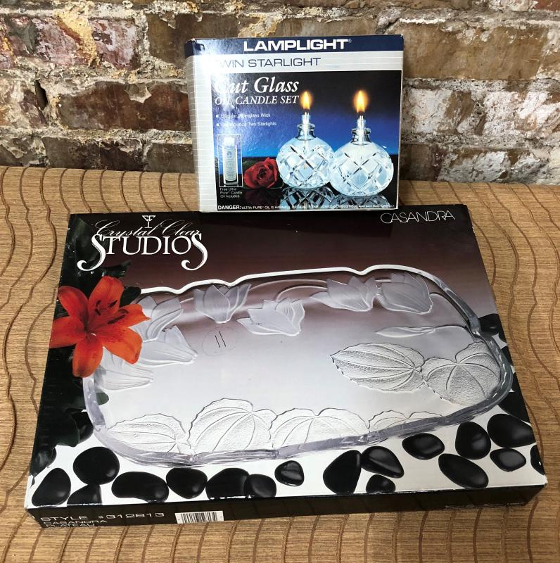 Both new in their boxes...a 35.5 x 25.5cm Crystal Clear Studios Casandra Plateau serving platter and a Twin Starlight Cut Glass Oil Candle Set....